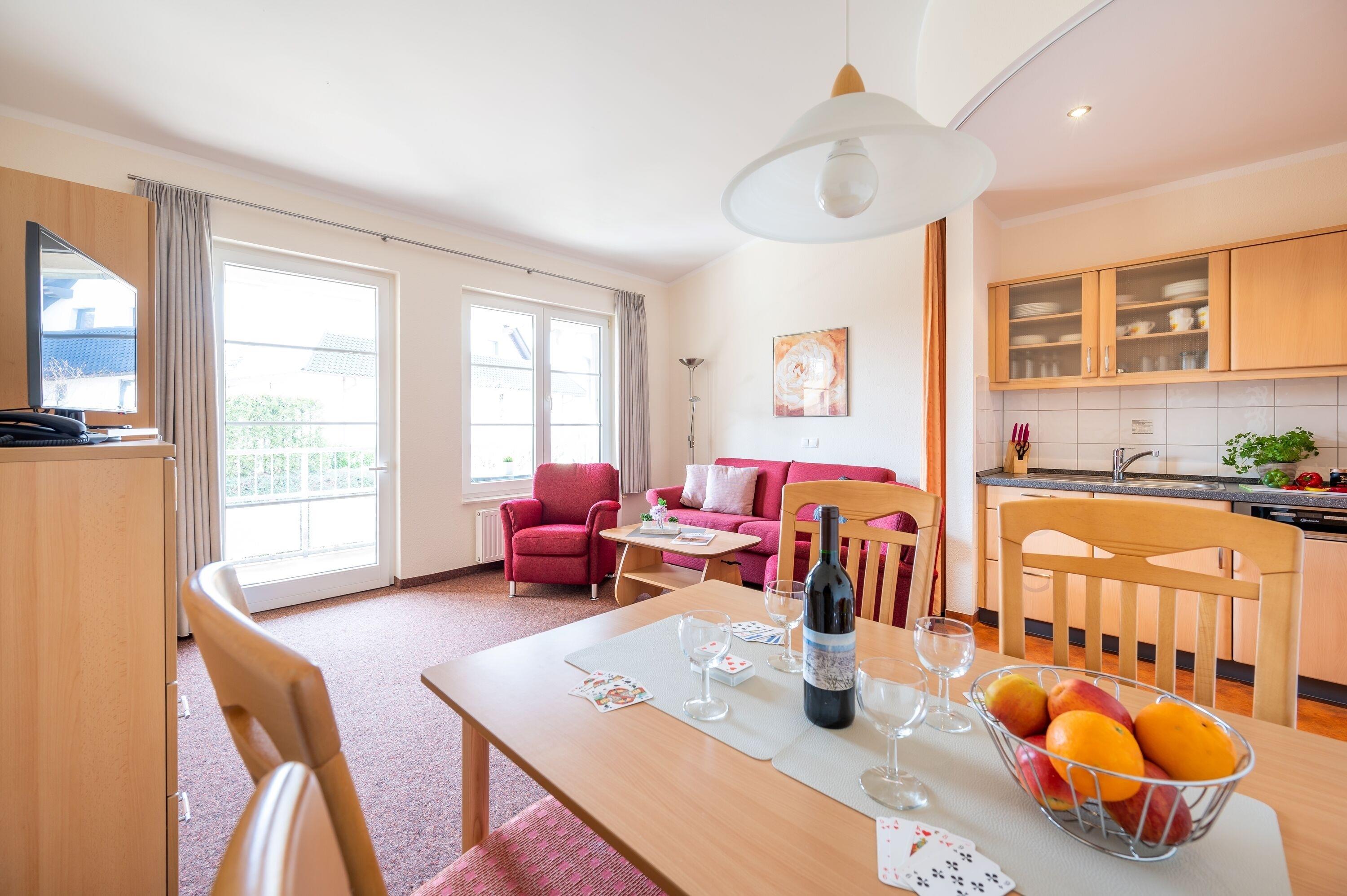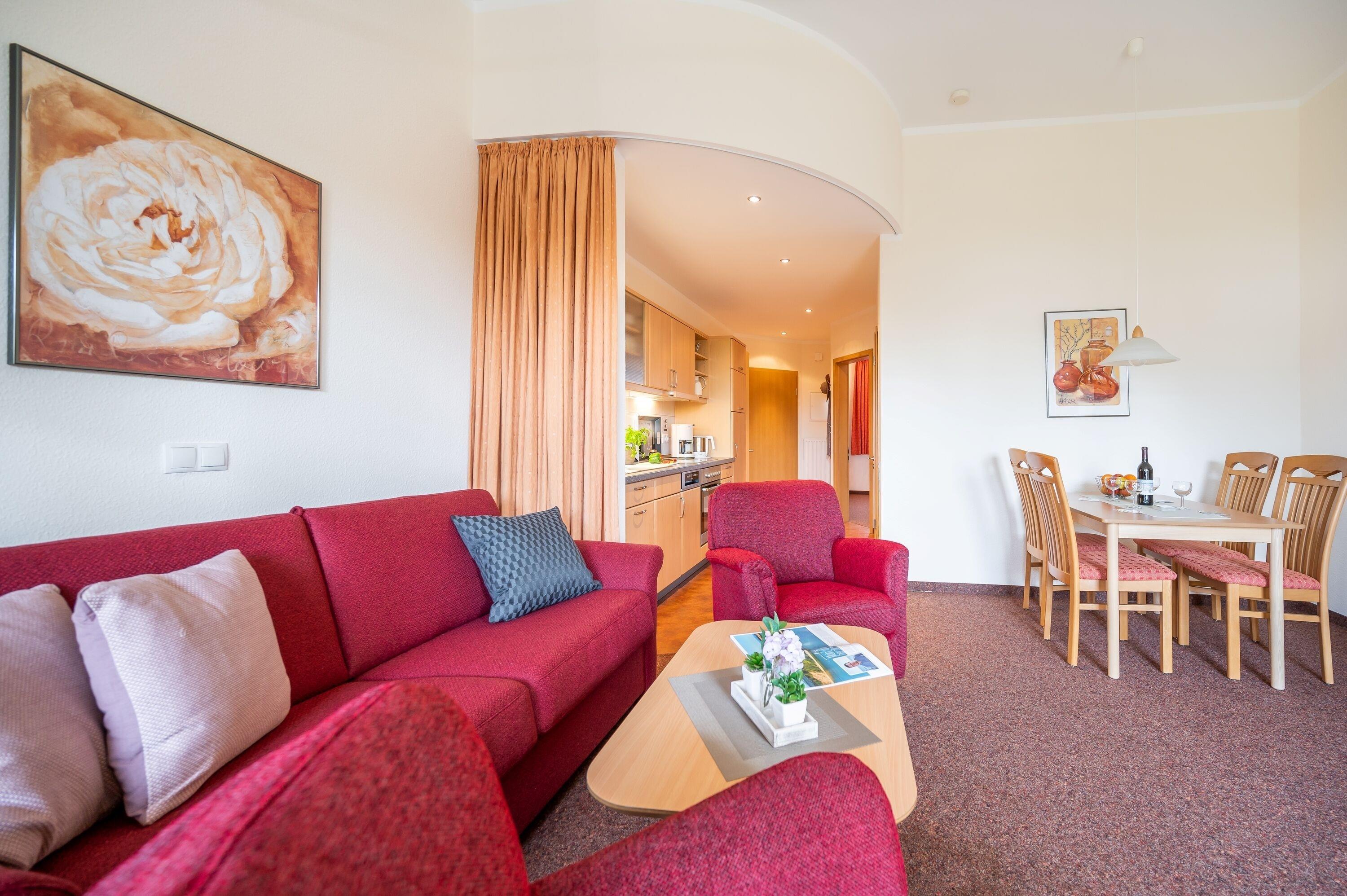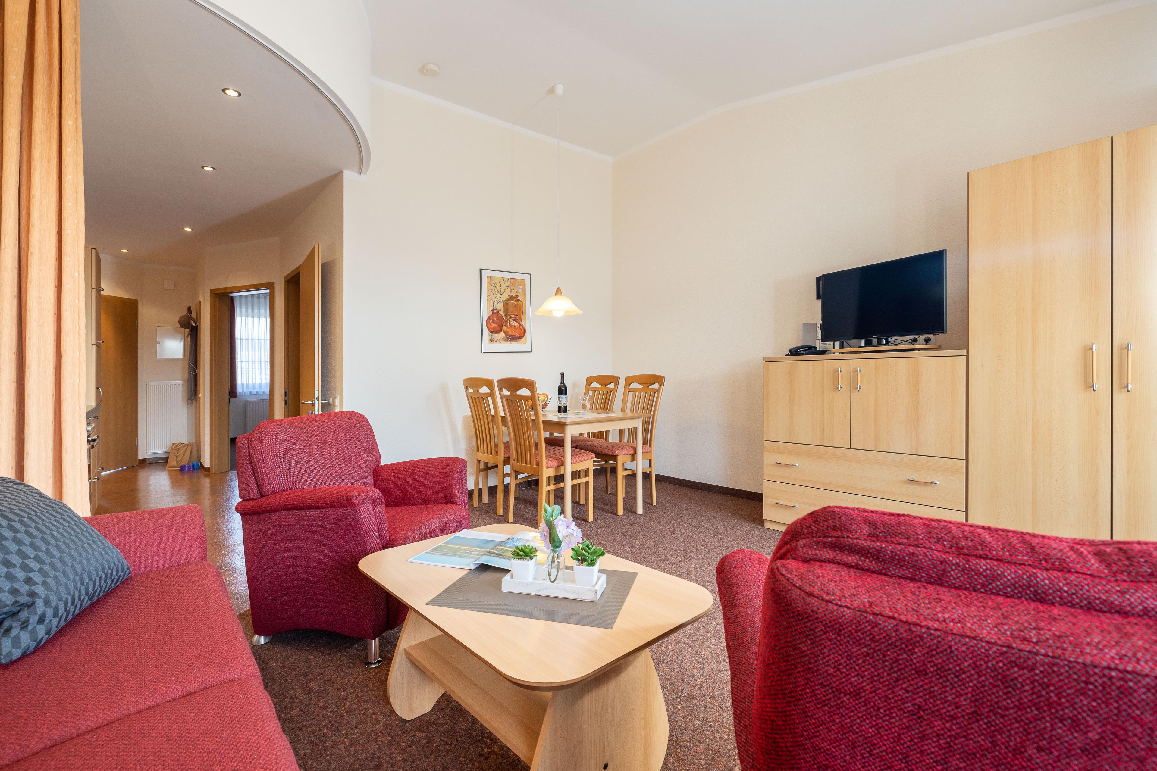 Die freundlich eingerichtete Wohnung 17 in der Ferienanlage Margaretha ist ca. 58 m² groß und für bis zu 4 Personen ausgelegt.