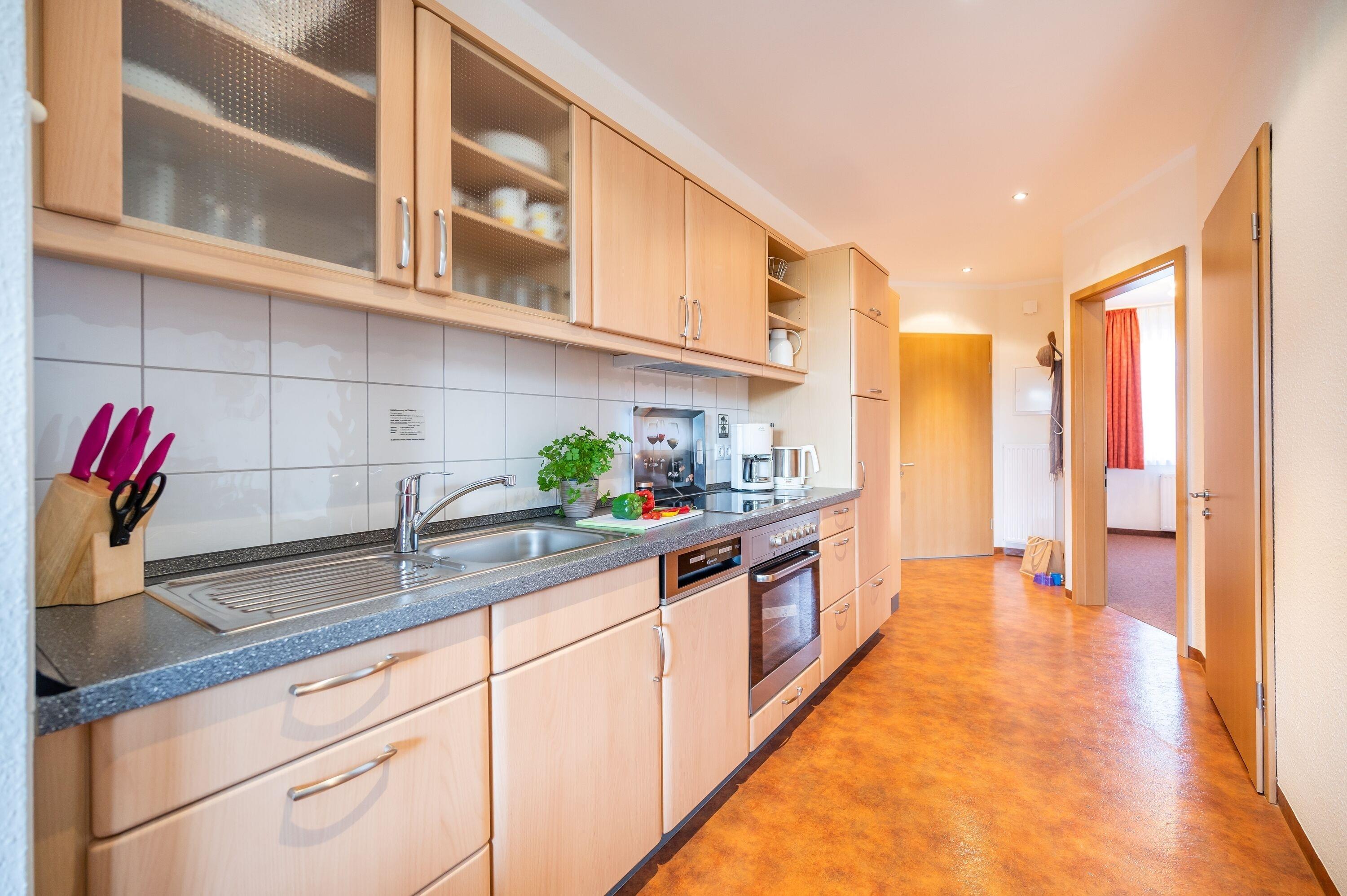 Die Küchenzeile ist mit einem Kühlschrank, einem Ceranfeld mit Backofen, einer Spülmaschine und einer Mikrowelle ausgestattet. Ebenso finden sich hier alle nötigen Küchenkleingeräte (Wasserkocher, Kaffeemaschine, Toaster..).