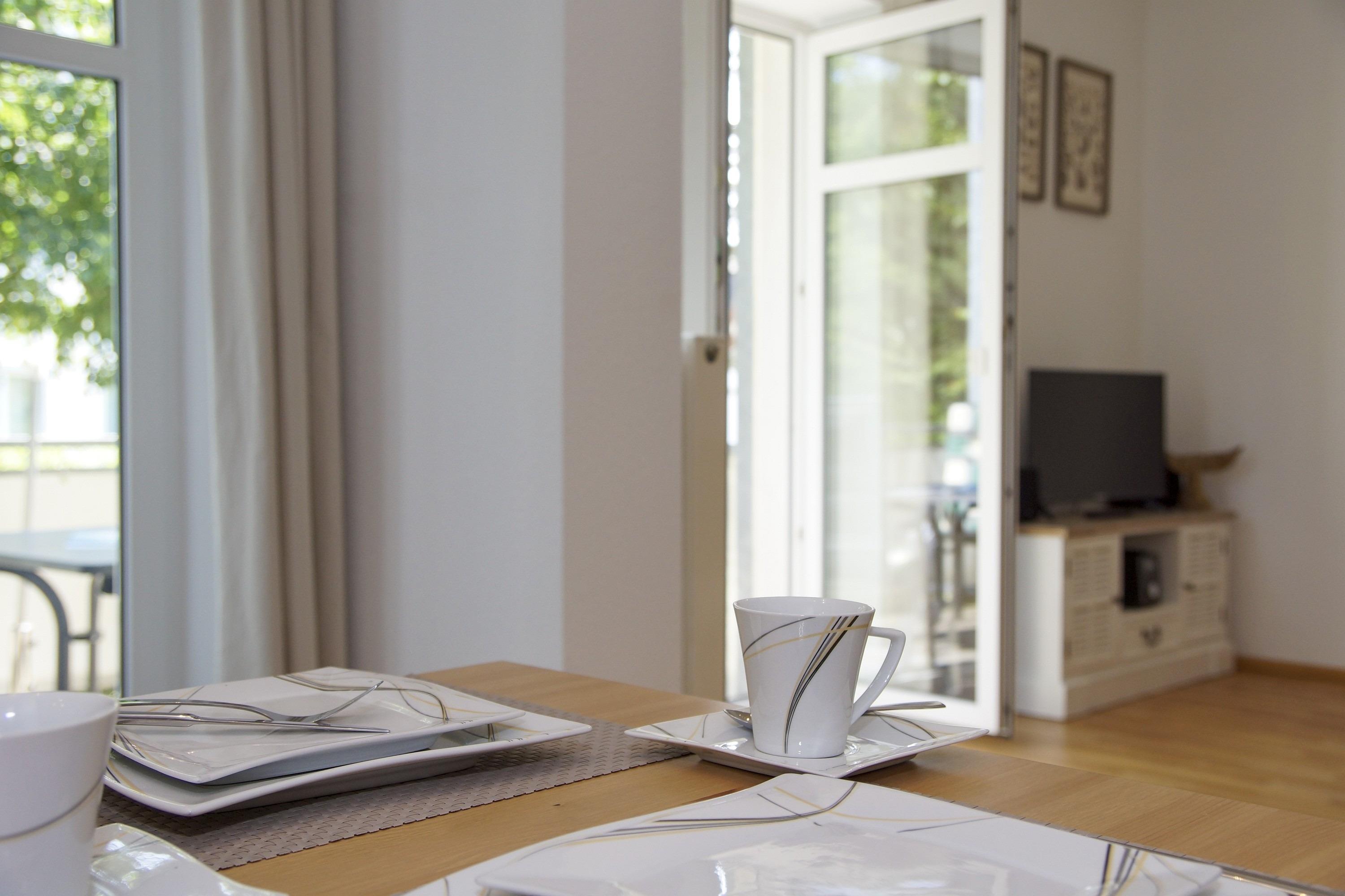 Das modern eingerichtete Wohnzimmer mit TV und Schlafcouch bietet Ihnen nicht nur Zugang zum sonnigen Balkon, sondern auch einen hellen Essbereich.