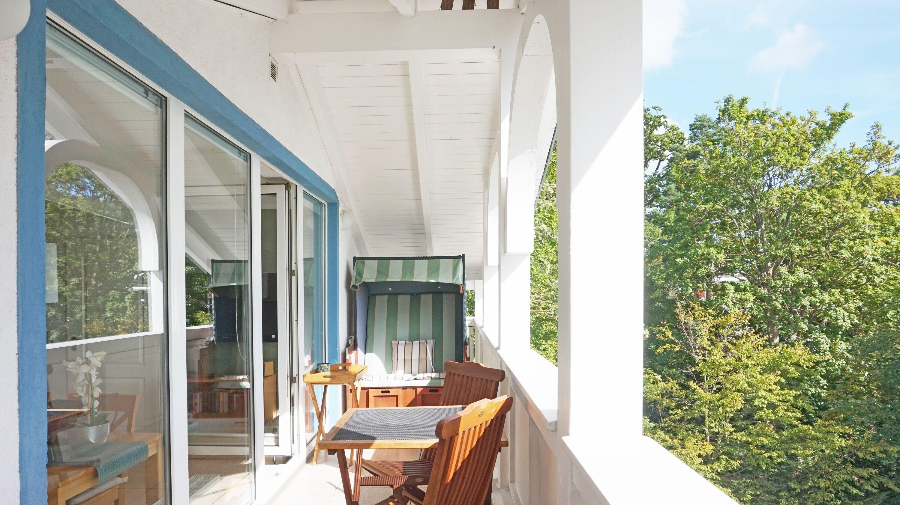 Moderne Ferienwohnung Morgensonne mit Balkon und Strandkorb im Ostseebad Sellin auf Rügen.