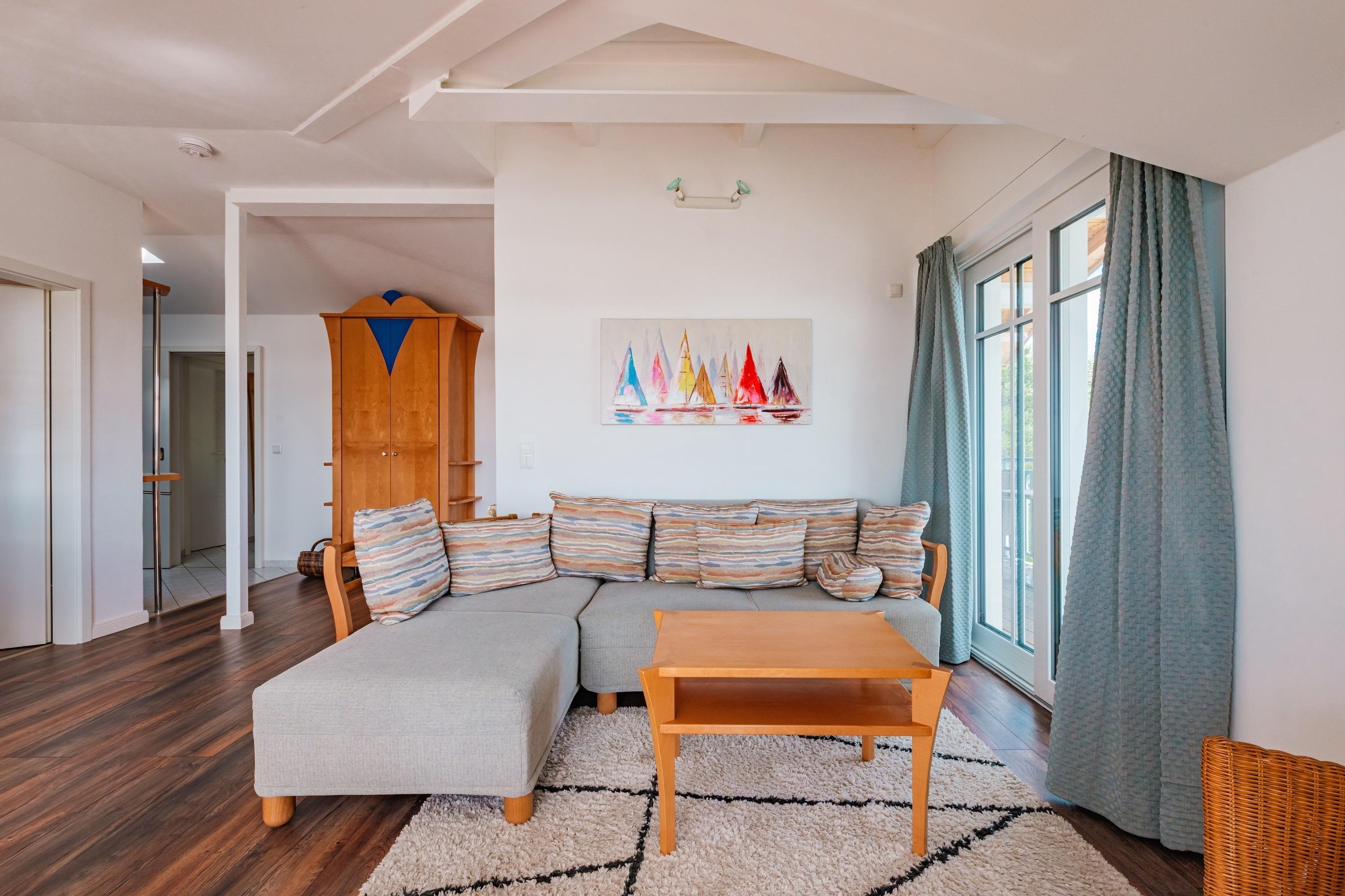 Das Herzstück der Wohnung ist das helle Wohnzimmer mit Blick auf den glitzernden Selliner See – ein Ort zum Entspannen, Genießen und Ankommen. Ob gemeinsames Frühstück am Esstisch oder ein gutes Glas Wein auf dem Sofa – hier beginnt Urlaub bei jedem Atemzug.