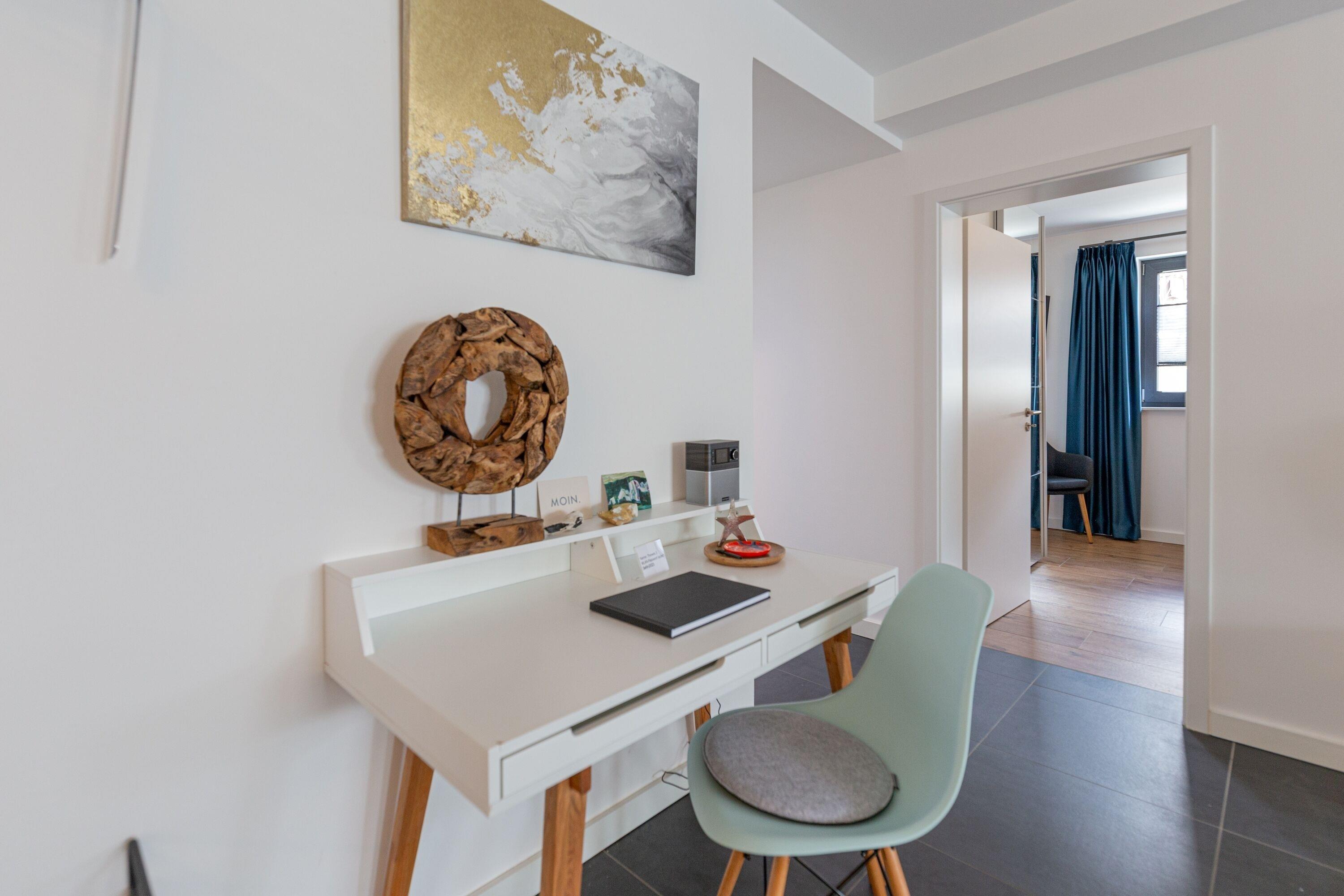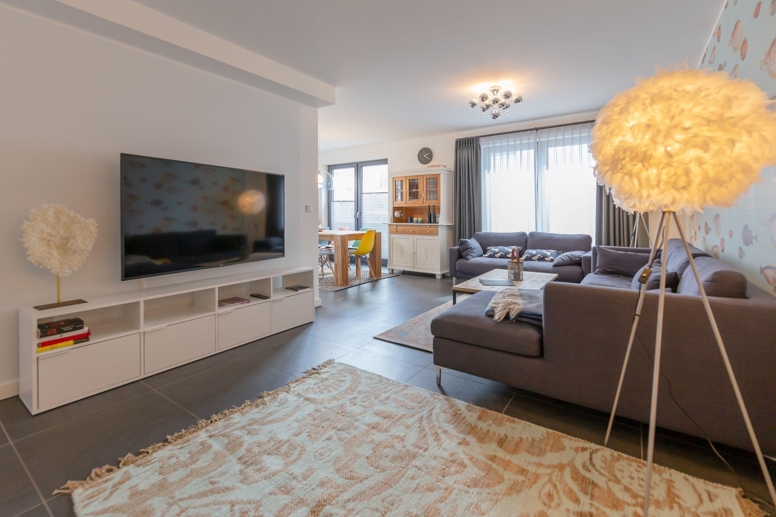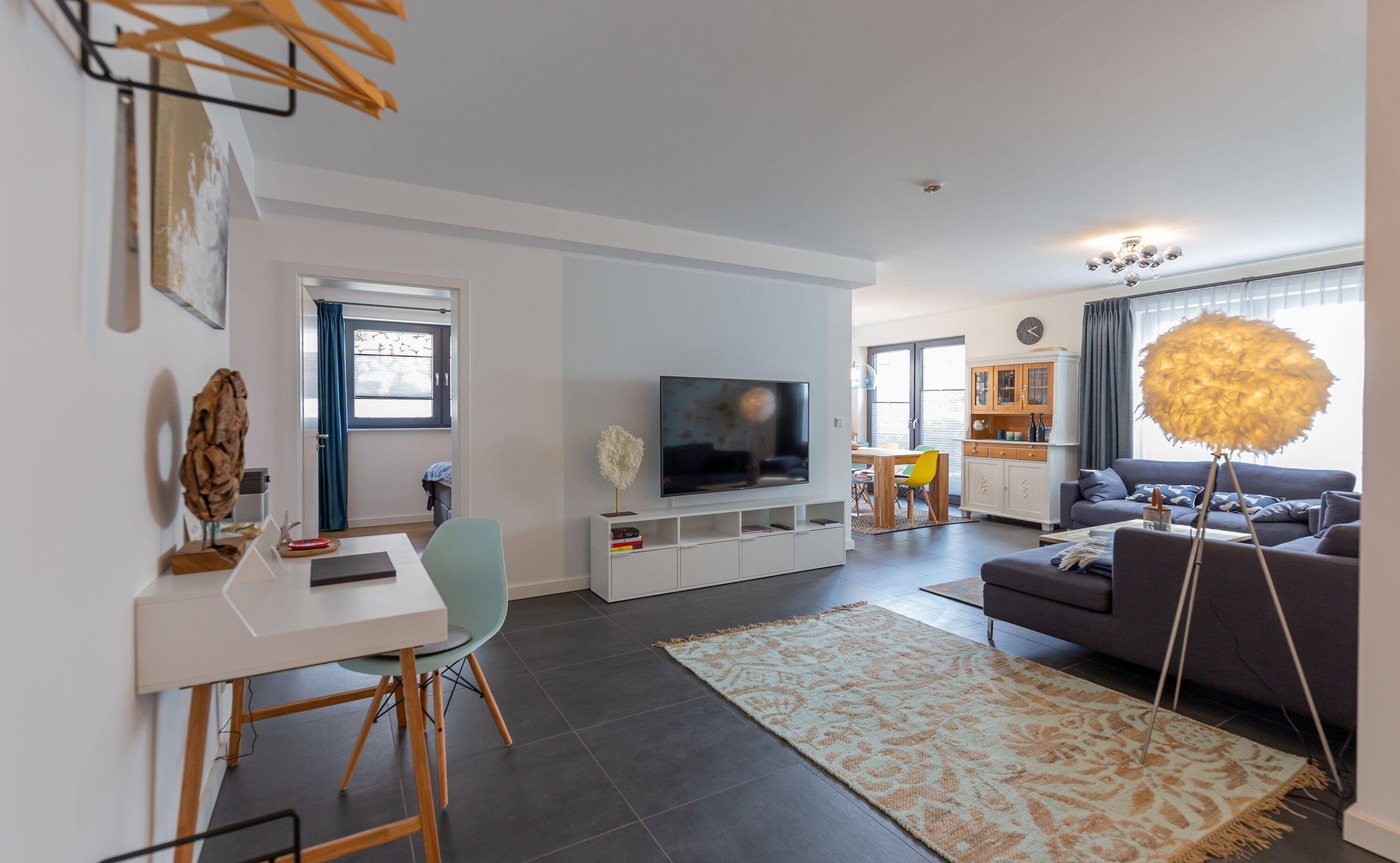 Betreten Sie die Ferienwohnung Mare, erwartet Sie eine herrlich maritime Atmosphäre zum Wohlfühlen und eine sonnige Terrasse. Der freundliche Wohnbereich verfügt über eine hochwertige, voll ausgestattete Küche mit einladendem Essbereich.
