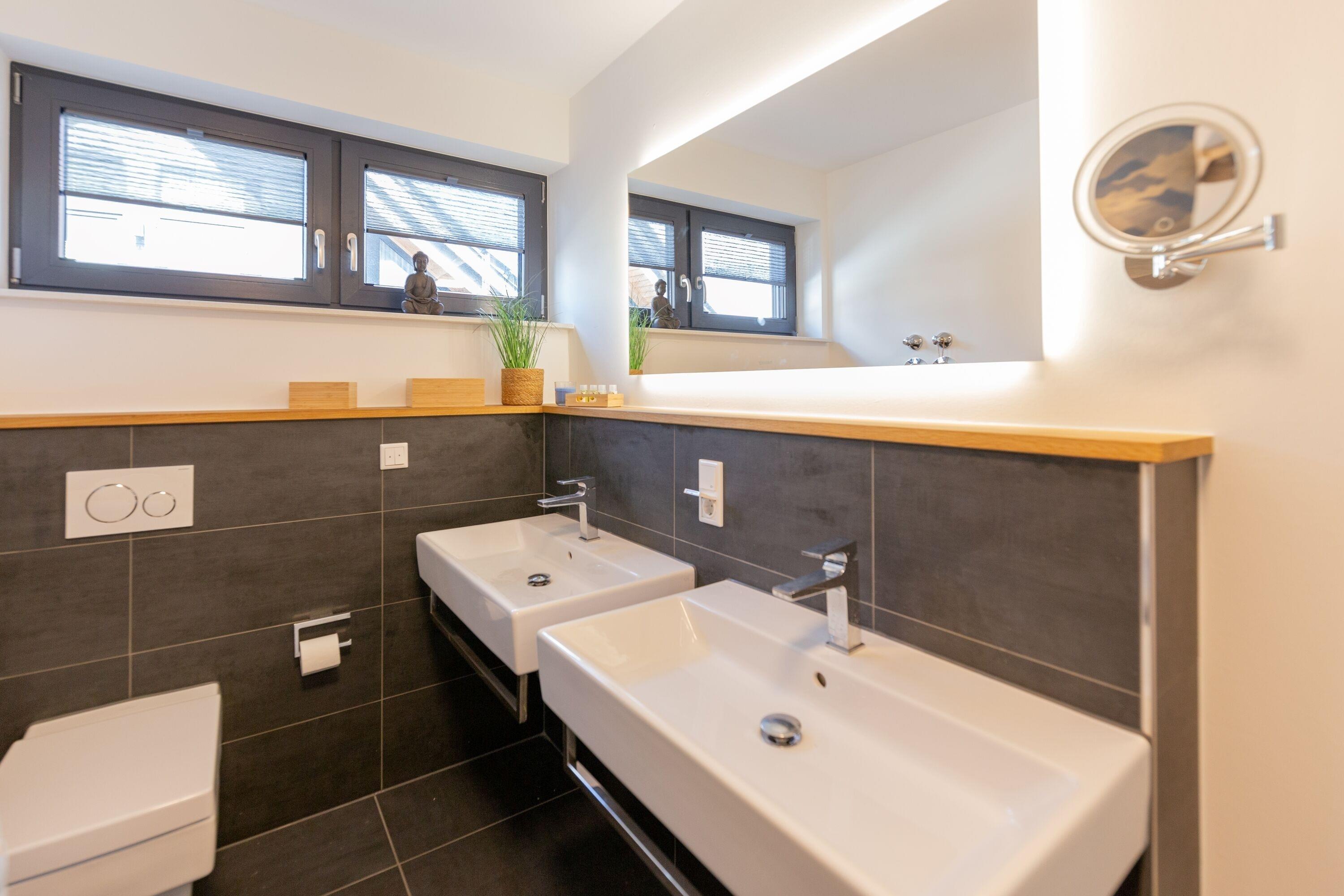 Die begehbare, ebenerdige Dusche und der große Doppelwaschtisch mit Tageslichtspiegel sind ebenfalls im Badezimmer vorhanden.