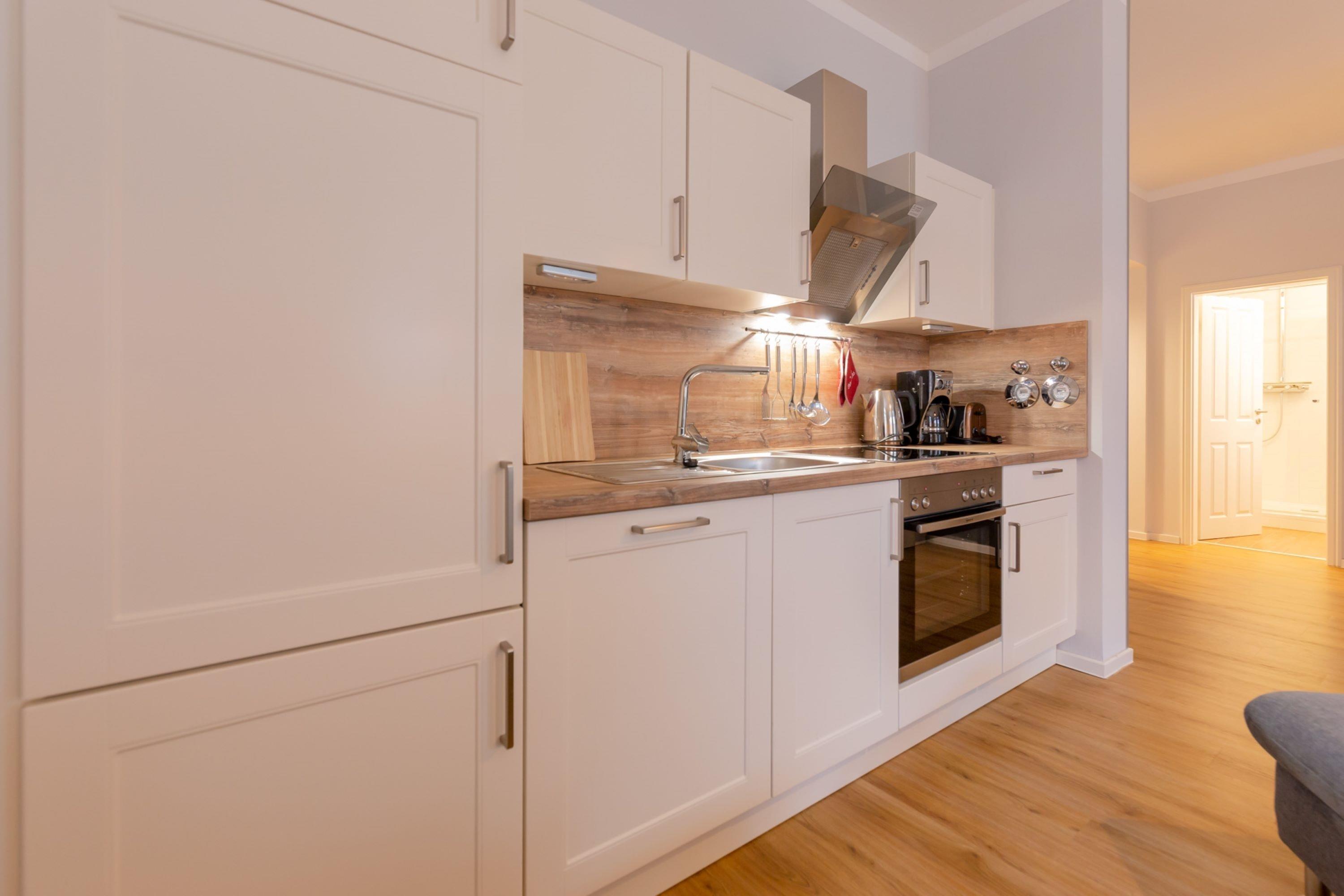 Die offene Küche ist bestens ausgestattet. Neben einem Kühlschrank mit Gefrierfach, einer Spülmaschine, einem Herd und einem Backofen finden Sie hier auch allerlei Küchenkleingeräte.