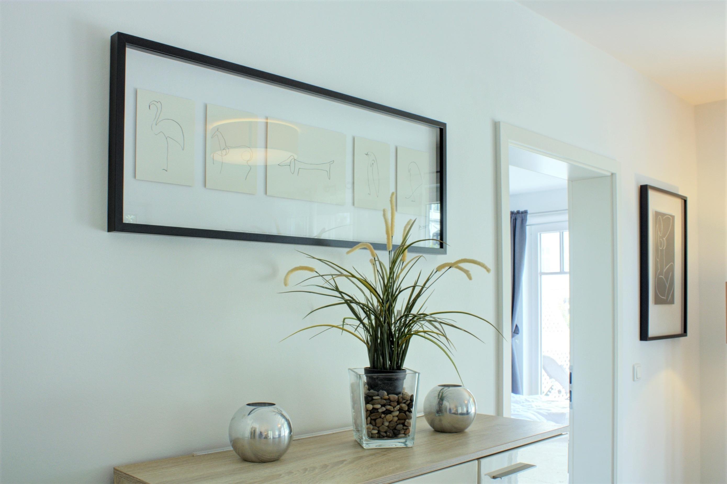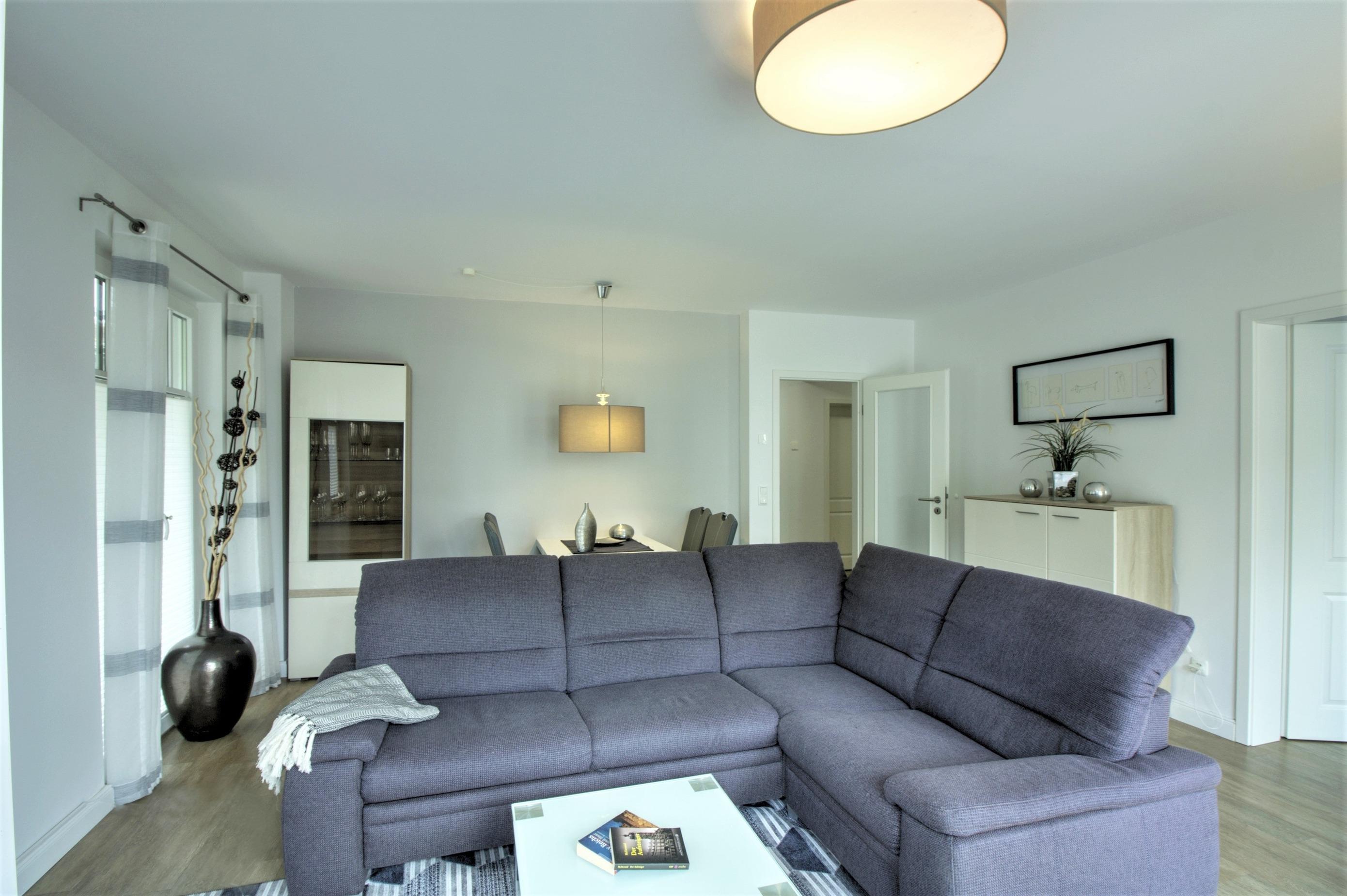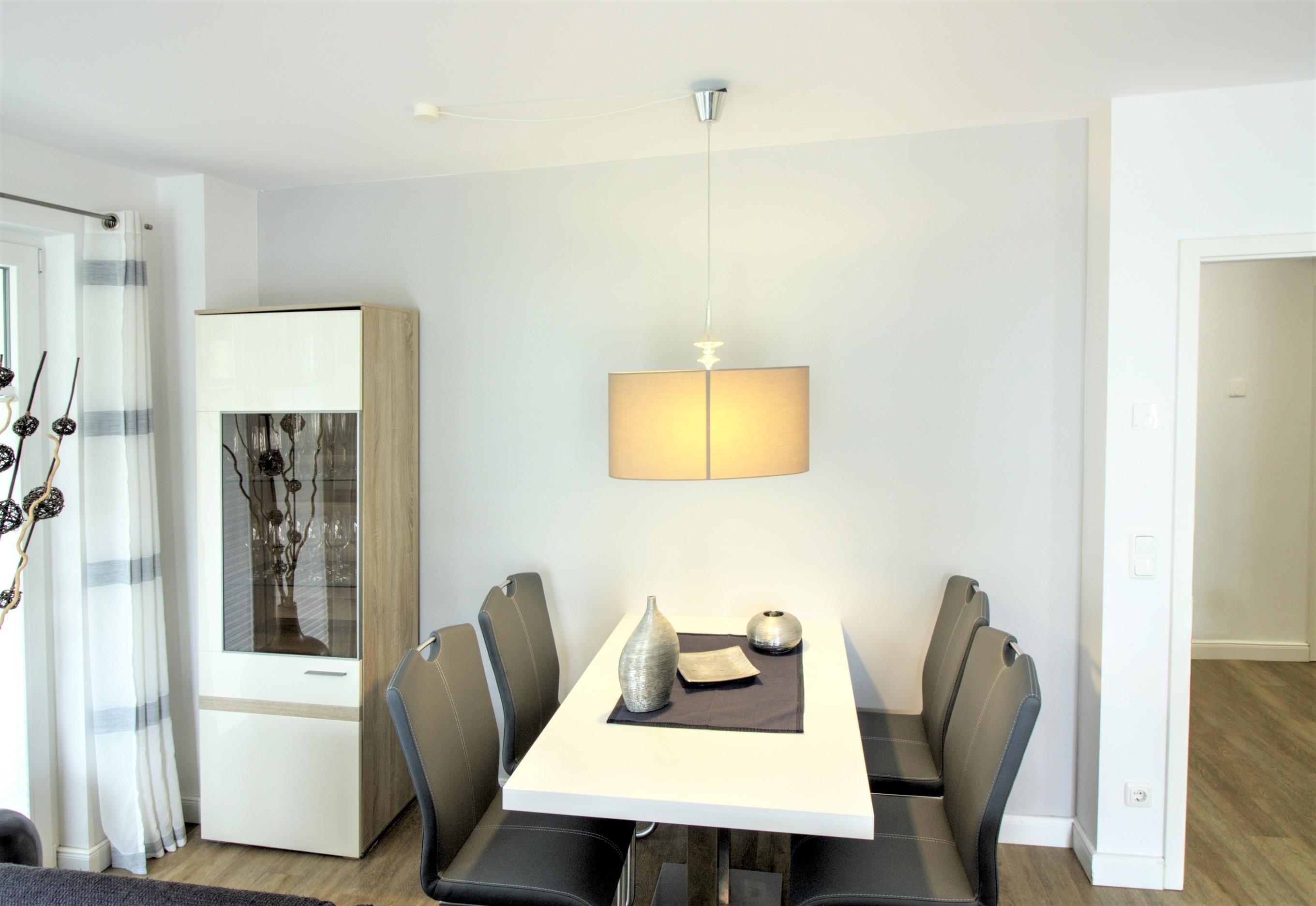 Betreten Sie den hell erleuchteten Wohnungsflur, der Sie in alle weiteren Räume begleitet. Der Wohnbereich verfügt nicht nur über eine moderne Couchgarnitur und einen Flachbild-TV, sondern auch über einen freundlichen Essbereich für bis zu 4 Personen.