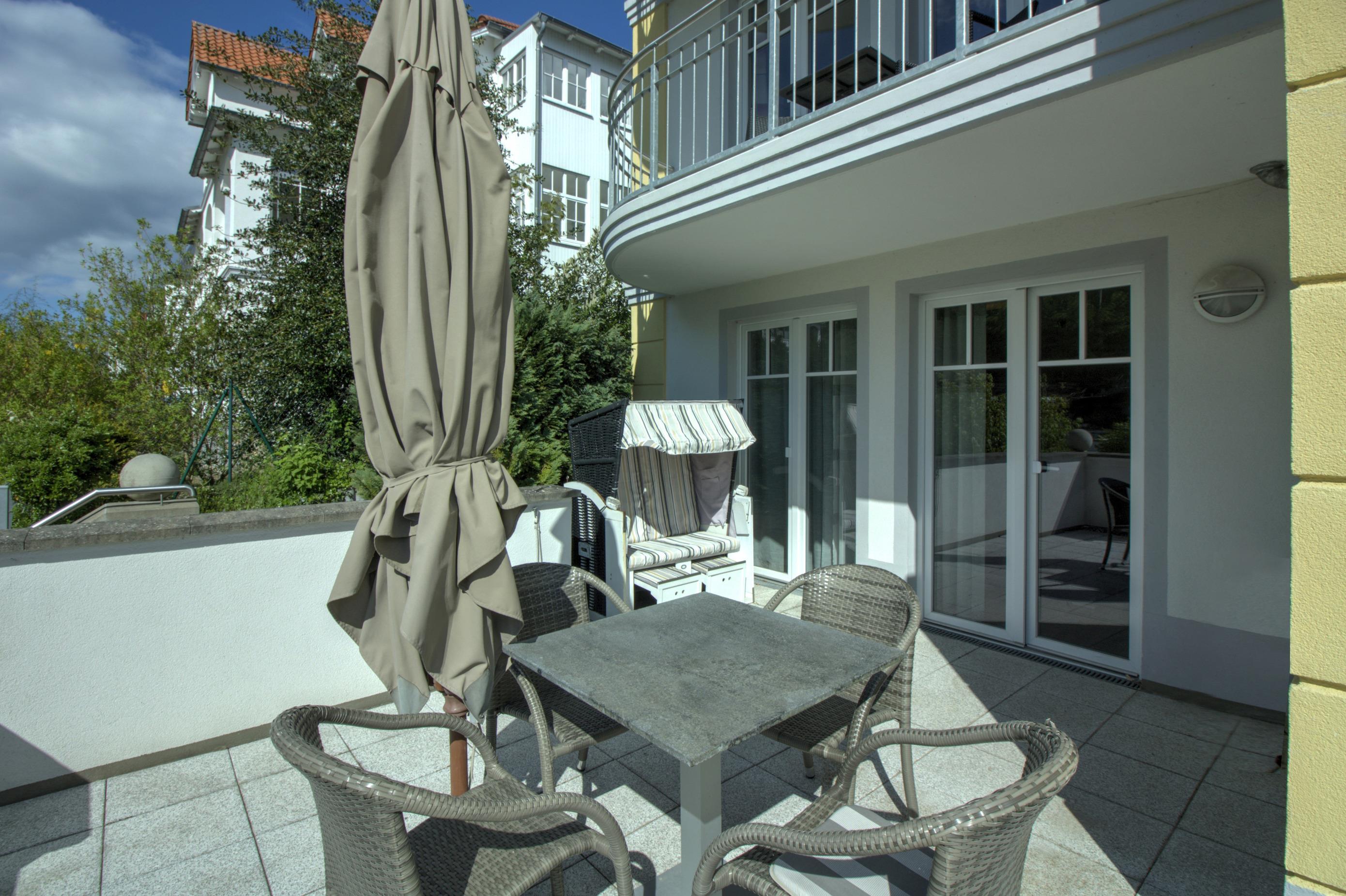 Vom Wohnbereich aus erreicht man die sonnige Terrasse mit komfortablen Gartenmöbeln und einem eigenen Strandkorb.