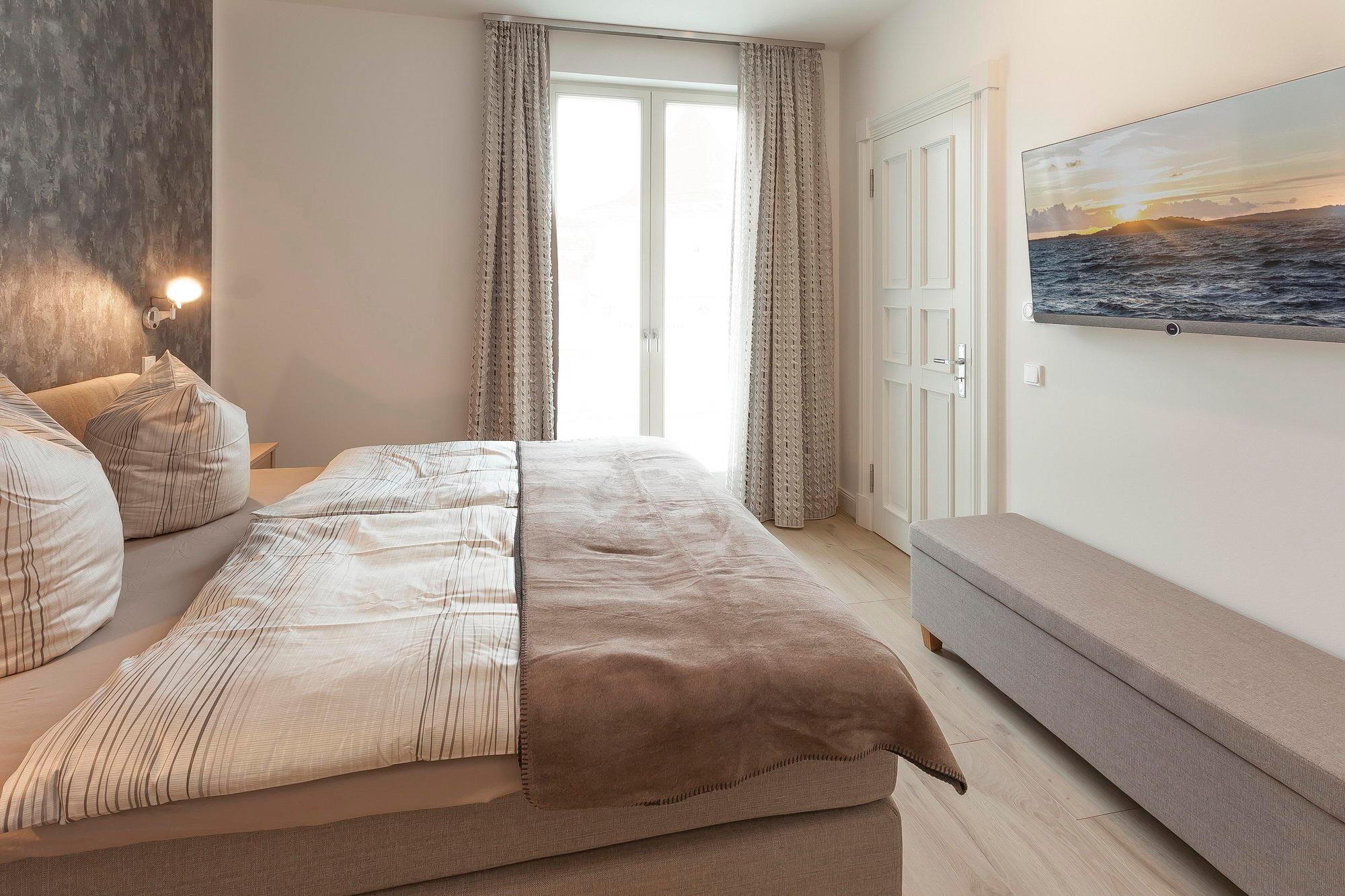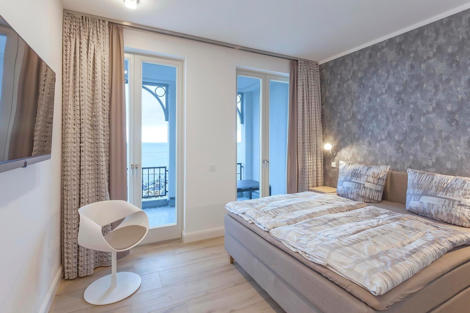 Zwei Schlafzimmer mit standesgemäßen Jensen-Boxspringbetten in 180x200cm, großem Kleiderschrank und 48 Zoll LOEWE-Fernsehern bieten Ihnen den notwendigen Rückzugsraum. Von einem der Schlafzimmer gelangen Sie auf die seeseitige Loggia, das andere Schlafzimmer hat einen Balkon mit Blick auf die Wilhelmstraße. Selbstverständlich lassen auch die beiden elegant gefliesten Badezimmer mit bodentiefer Dusche bzw. Badewanne, großzügigen Waschtischen, Kosmetikspiegel und Handtuchwärmer keine Wünsche offen.
