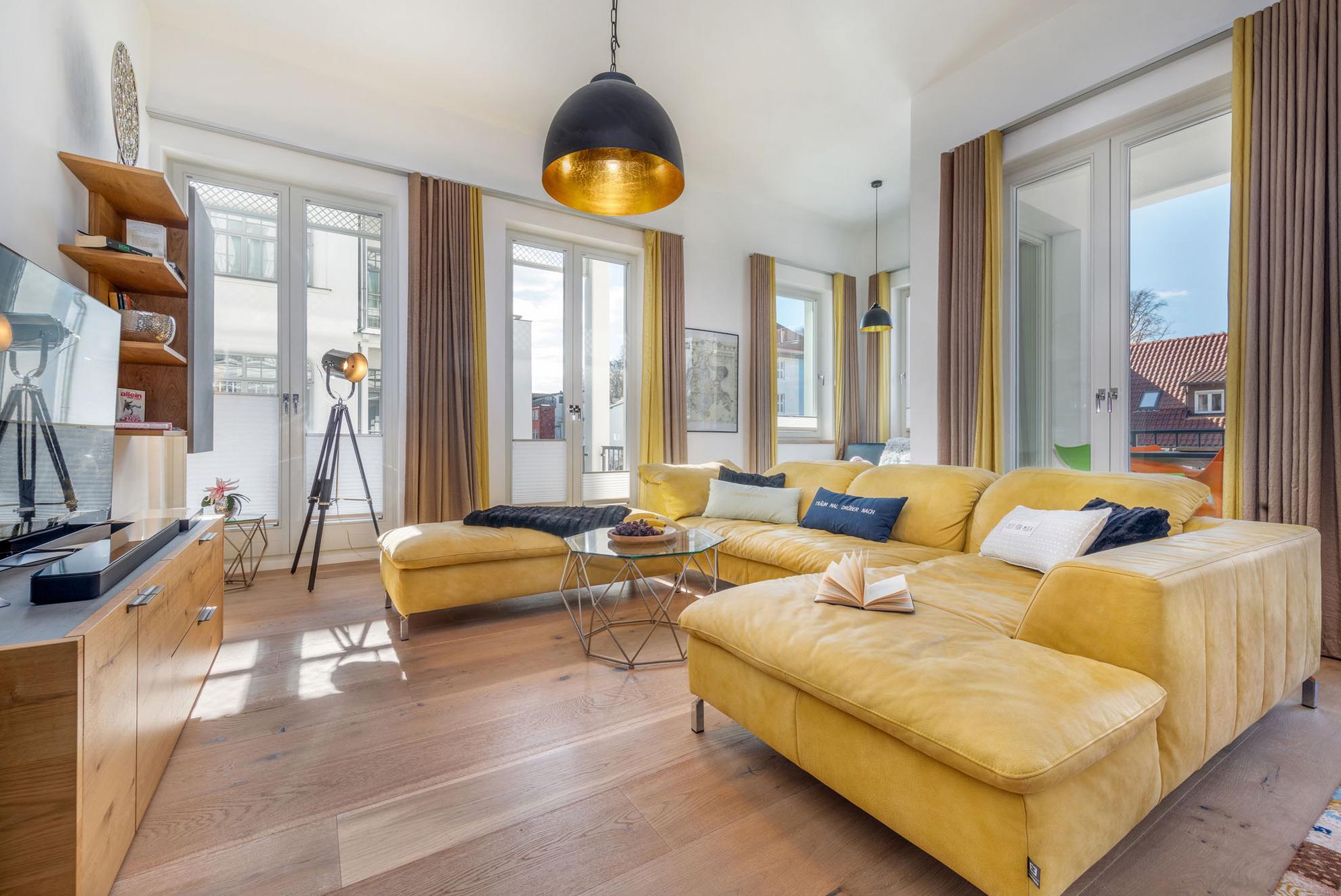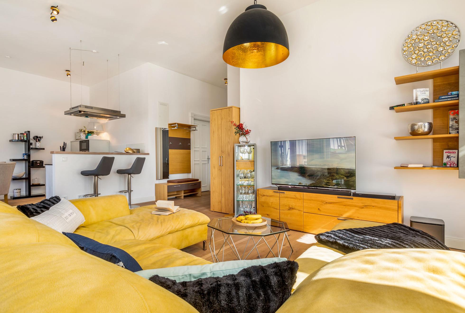Die gesamte Wohnung ist absolut lichtdurchflutet und wurde mit modernen Mobiliar in ansprechenden Farben ausgestattet. Das großzügige Loungesofa aus weichem Leder bildet dabei den Mittelpunkt der Wohnung und lädt zum gemütlichen relaxen ein.