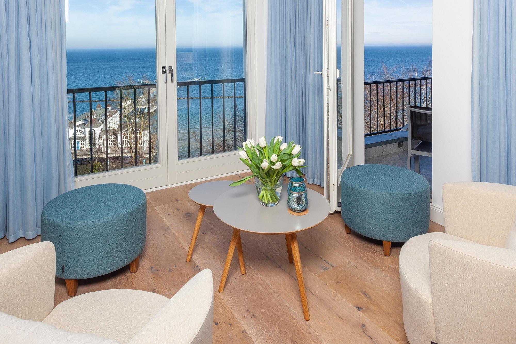 Im offen gestalteten Wohn- und Essbereich können Sie in einer gemütlichen Sitzecke mit einem Schlafsofa und 2 Sesseln die Ruhe und den fantastischen Panoramablick über die Ostsee genießen. Bei schönem Wetter lassen Sie den Blick von dem Balkon aus auf sich wirken, der jederzeit zu einem gemütlichen Frühstück mit Meeresbriese einlädt. Für zeitgemäße Unterhaltung im Wohnzimmer sorgen ein Flachbild-TV, eine Musikanlage, ein CD/DVD-Player und kostenfreies W-LAN.