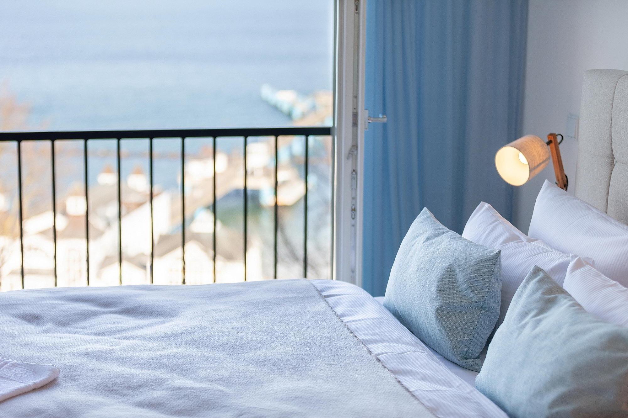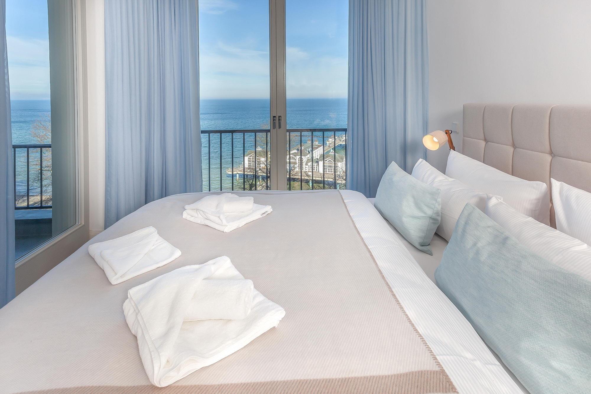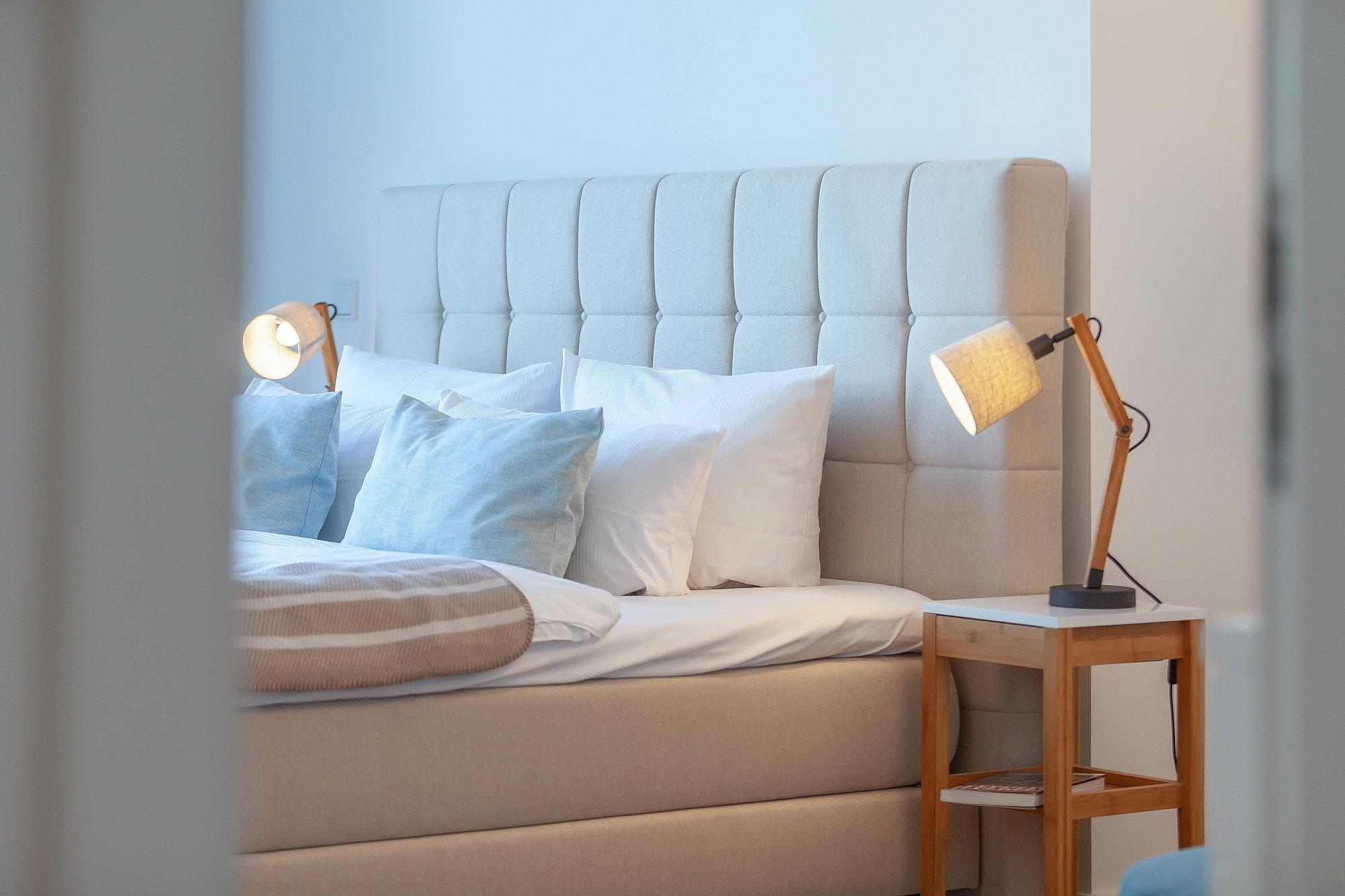 Das Schlafzimmer ist mit einem großzügigen Boxspringbett, zwei Nachtschränken mit Lampen und einem Kleiderschrank ausgestattet. Auch vom Bett aus haben Sie hier direkten Meerblick. Über eine Terrassentür im Schlafzimmer erreichen Sie den möblierten Balkon.