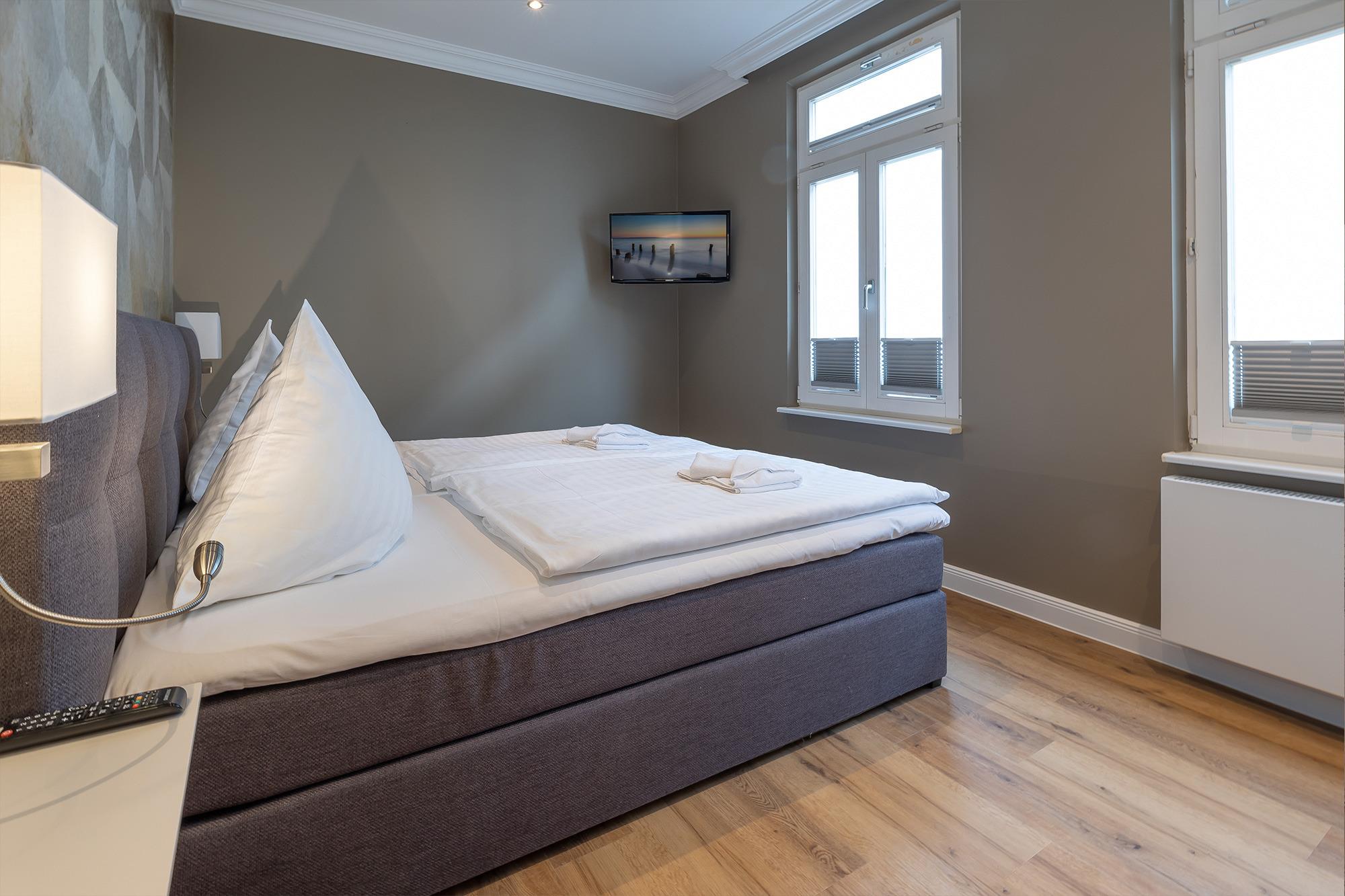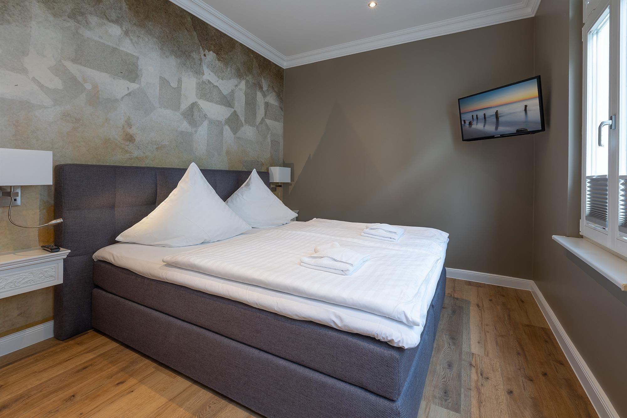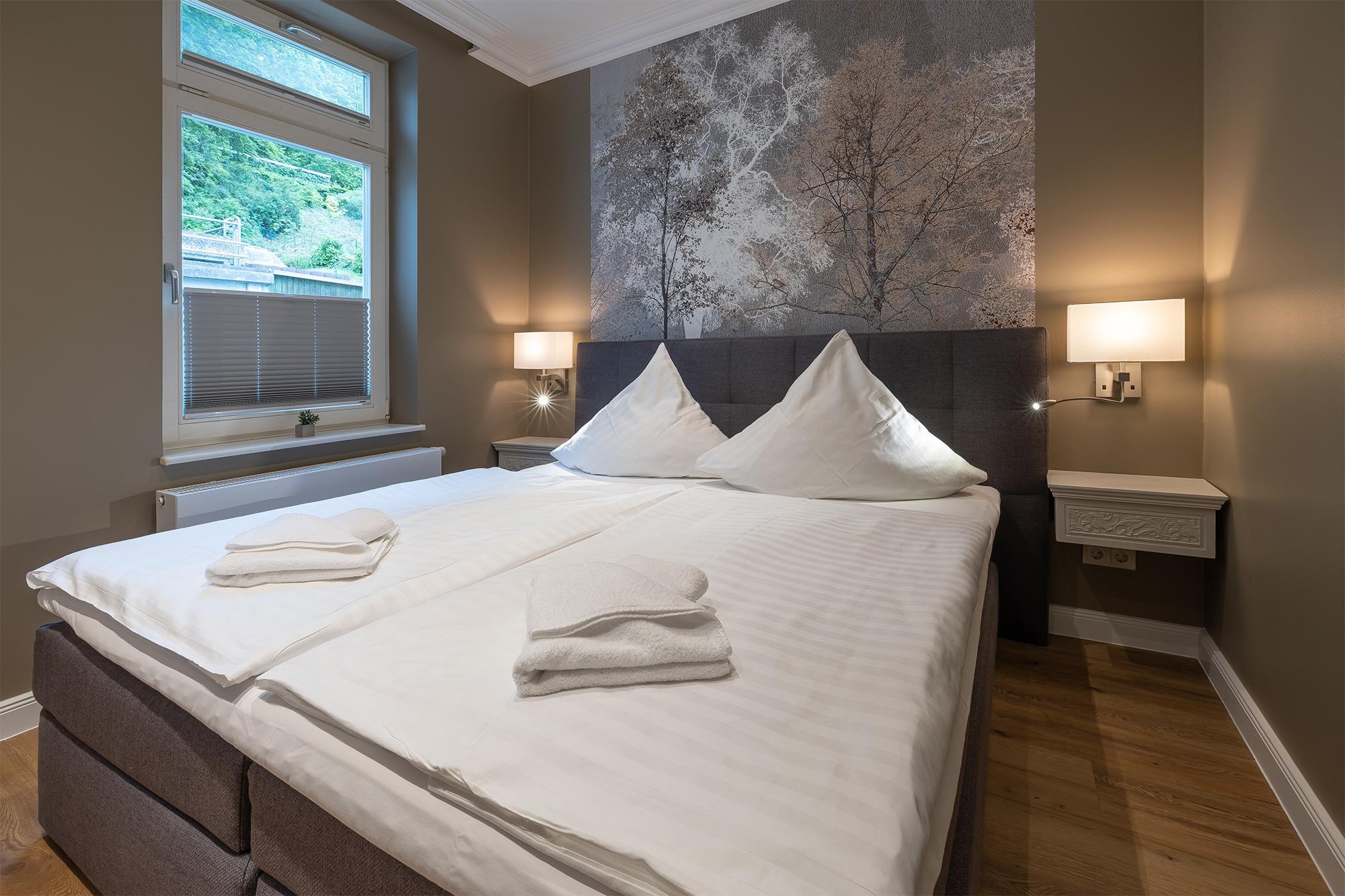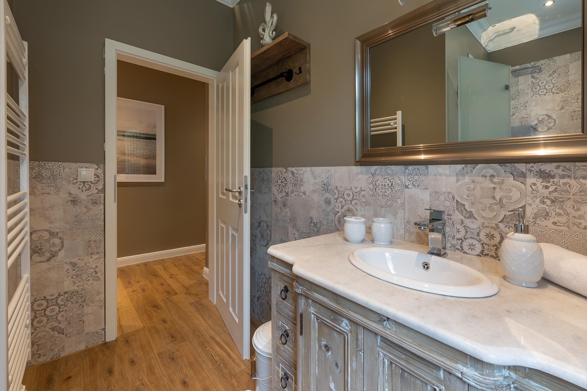 Als Rückzugsort erwartet Sie zwei Schlafzimmer mit Boxspringbetten in 180x200 cm und einem großen Kleiderschrank. Die Ferienwohnung verfügt über ein Bad mit Dusche, sowie einem separaten WC mit Handwaschbecken.