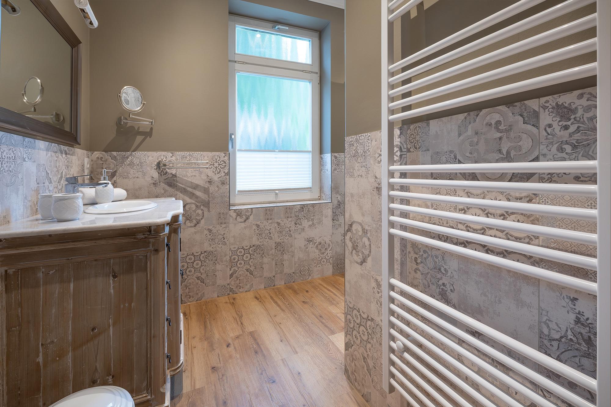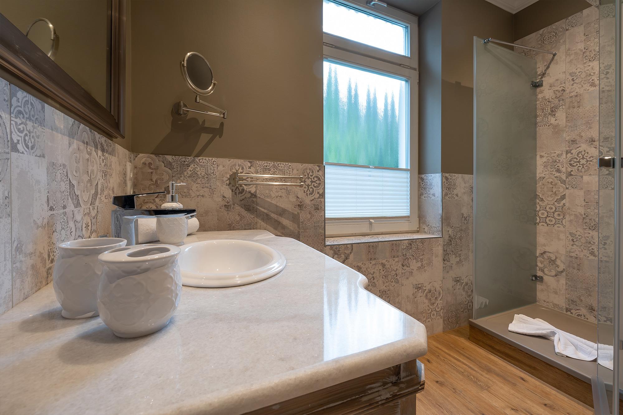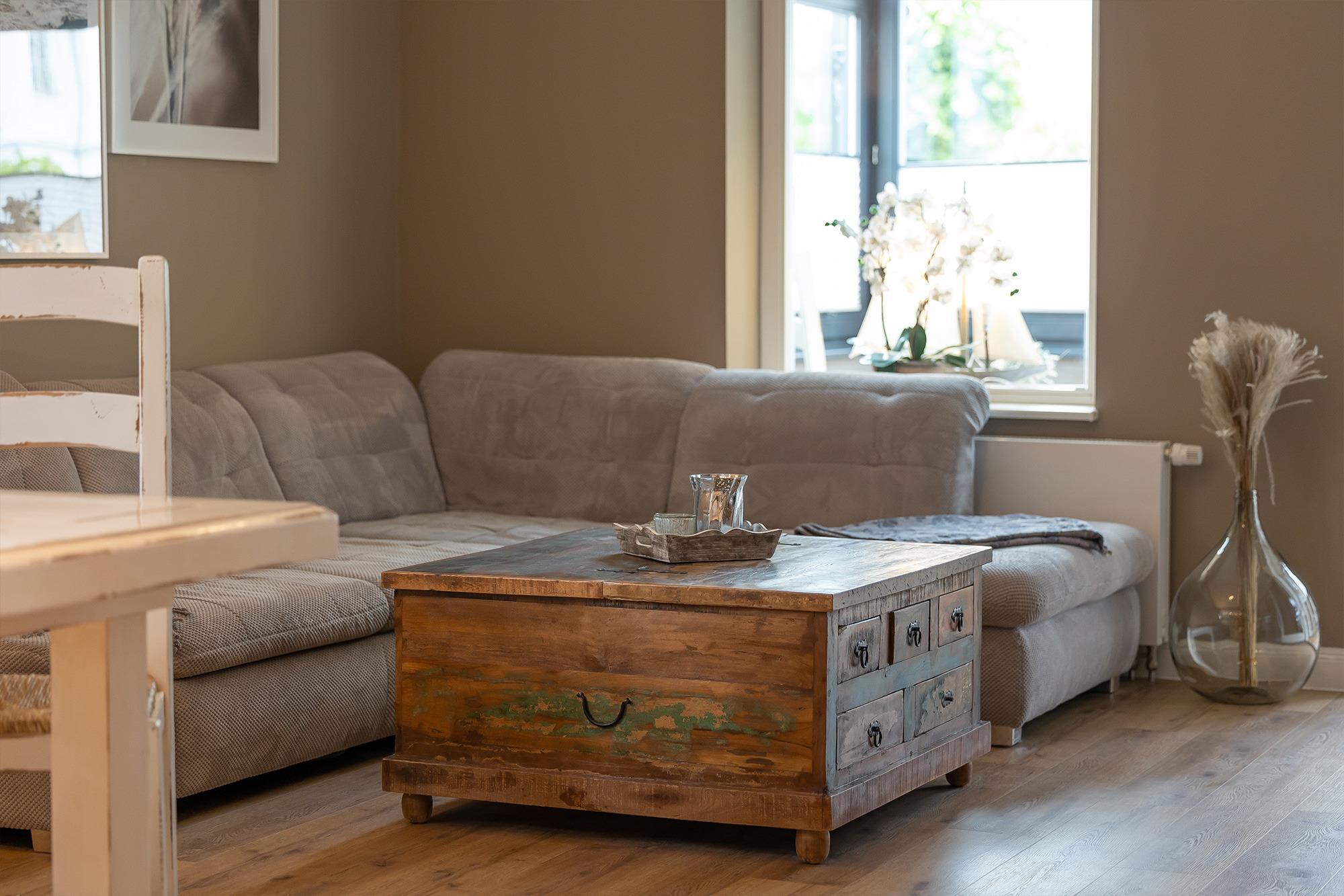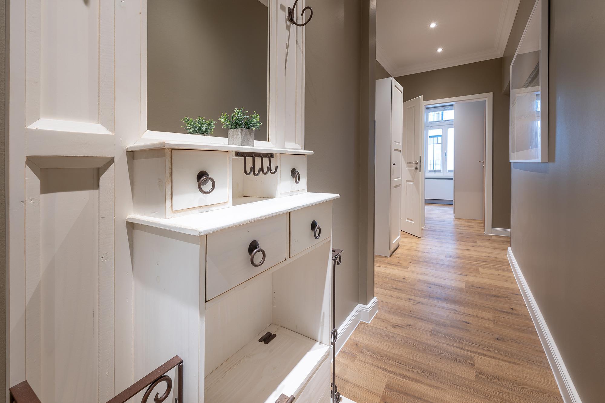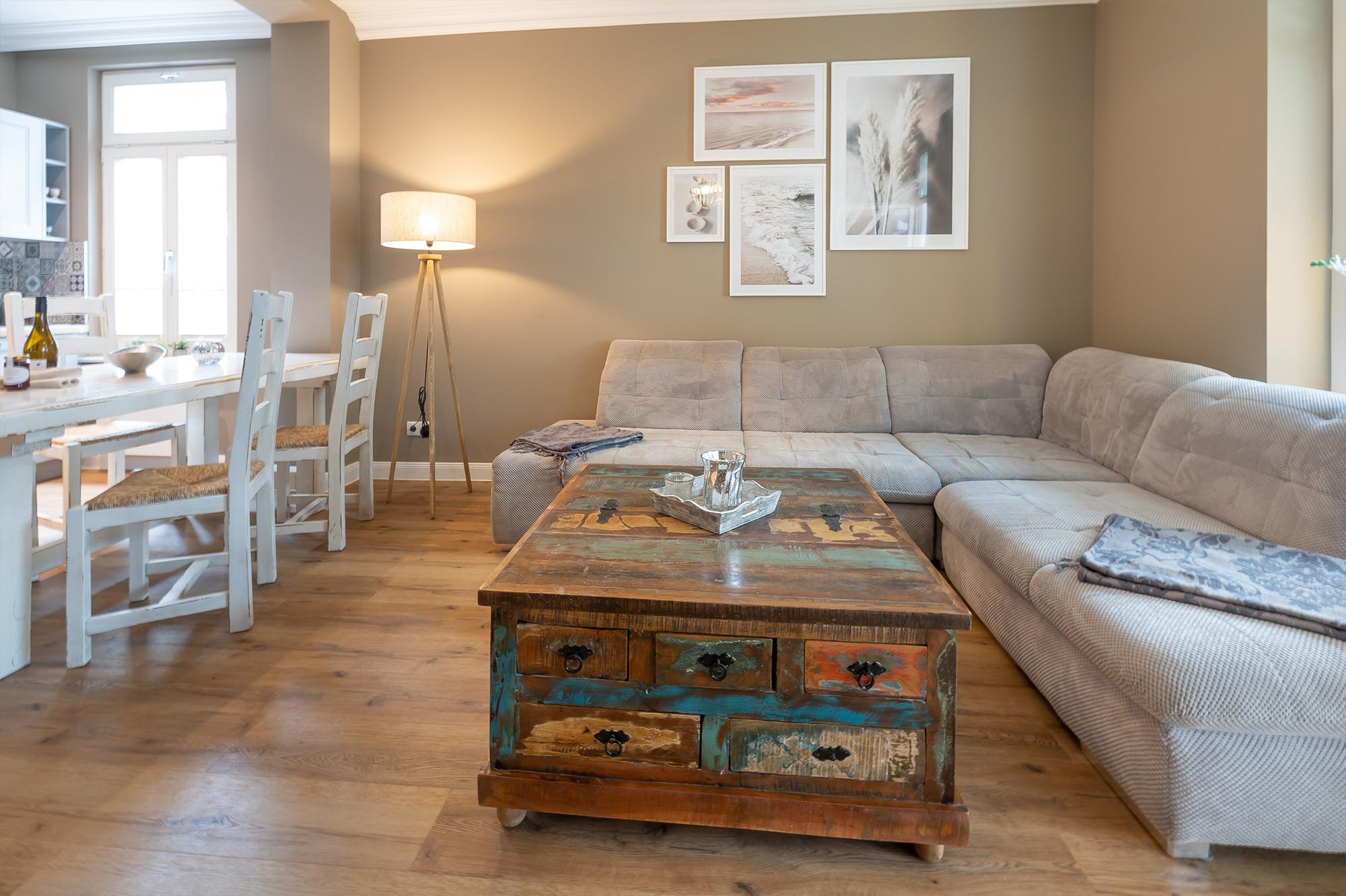 Als Rückzugsort erwartet Sie zwei Schlafzimmer mit Boxspringbetten in 180x200 cm und einem großen Kleiderschrank. Die Ferienwohnung verfügt über ein Bad mit Dusche, sowie einem separaten WC mit Handwaschbecken.