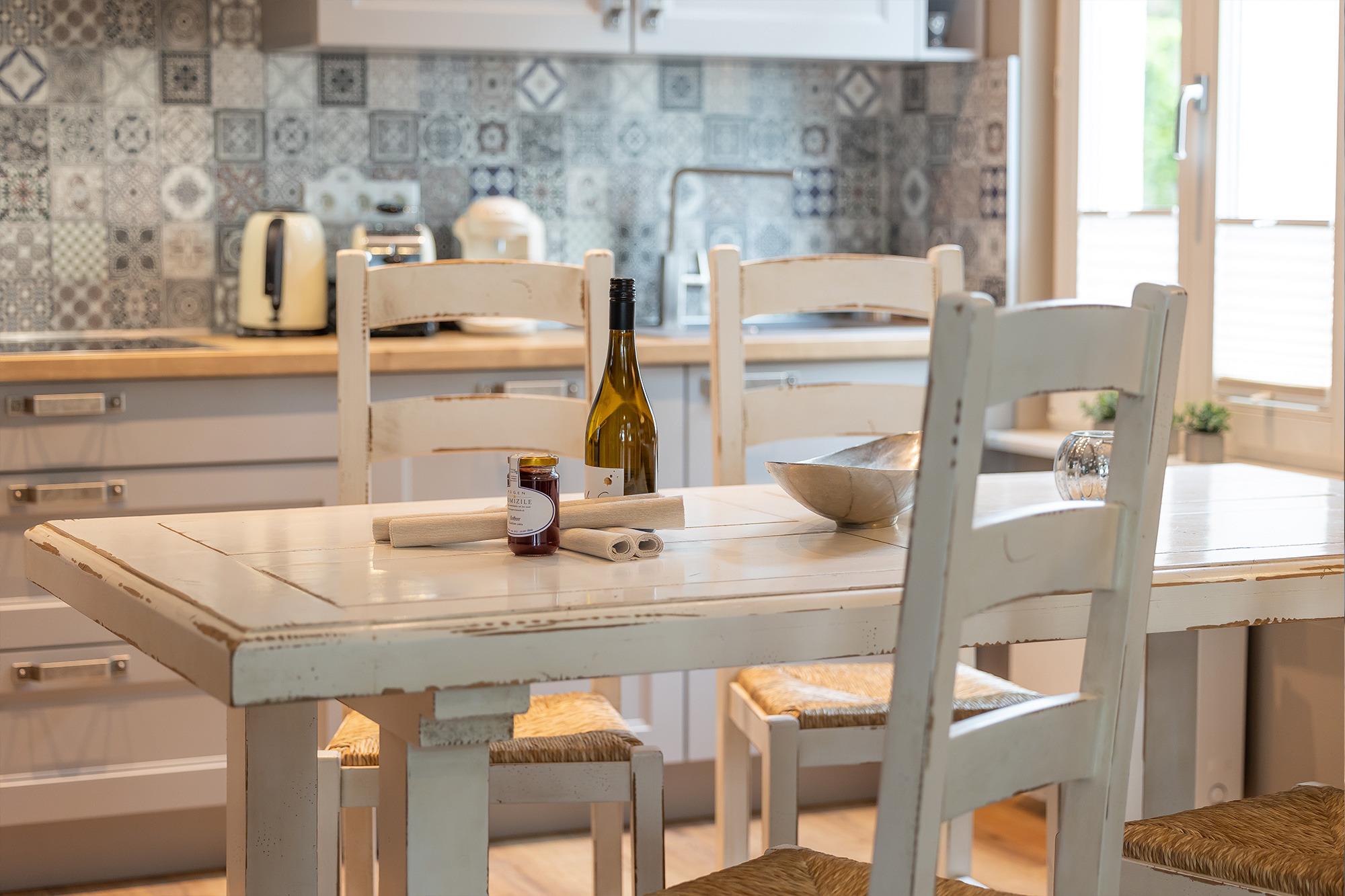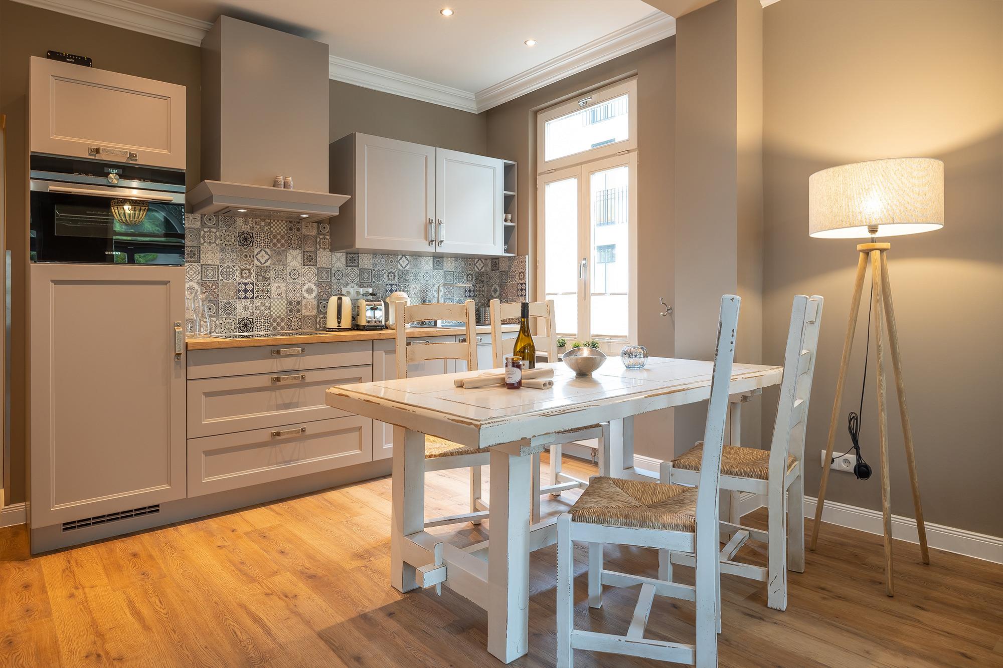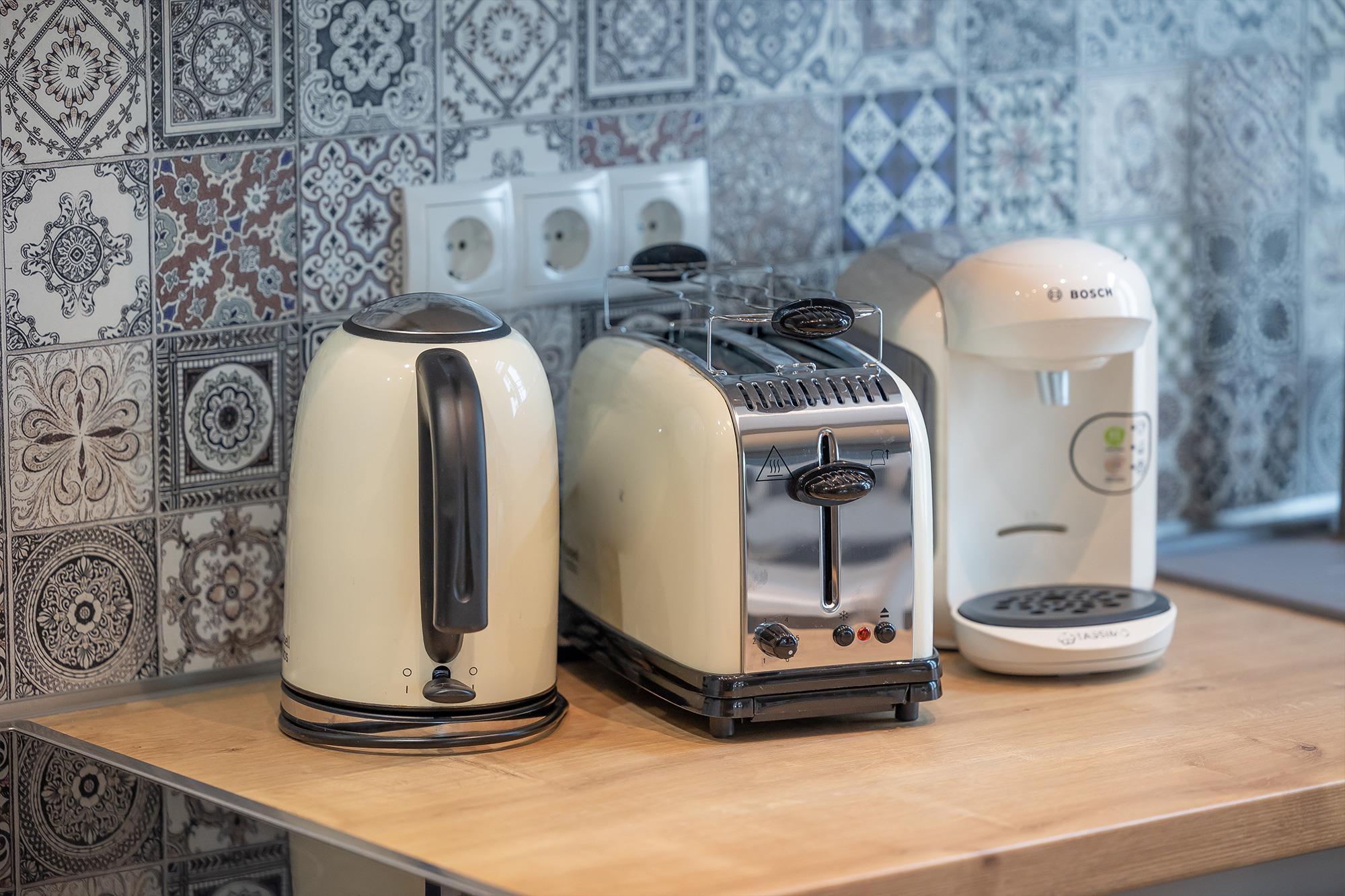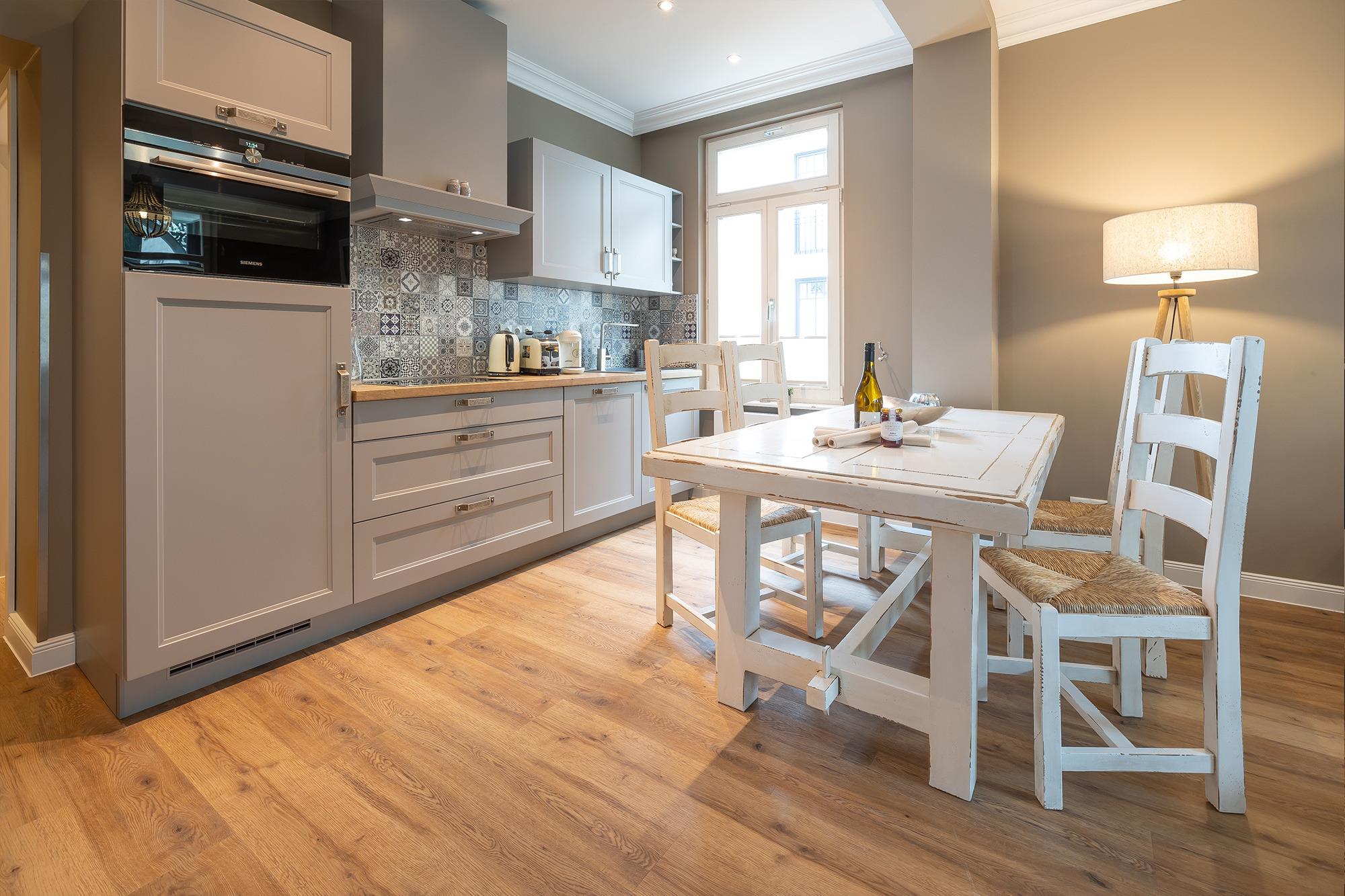 Die separate Küche ist mit einem Cerankochfeld, Backofen und Spülmaschine ausgestattet. Dazu kommen eine Kaffeepad Maschine der Marke Tassimo, Kühlschrank mit Gefrierfach, Wasserkocher, Toaster und eine Vielzahl an Küchenhelfern hinzu. Hier können Sie kleine Köstlichkeiten gerieren und Sie im Wintergarten mit Blick auf die Wilhelmstraße genießen. Ein Hochstuhl für unsere kleinen Gästen, steht Ihnen kostenfrei zur Verfügung.