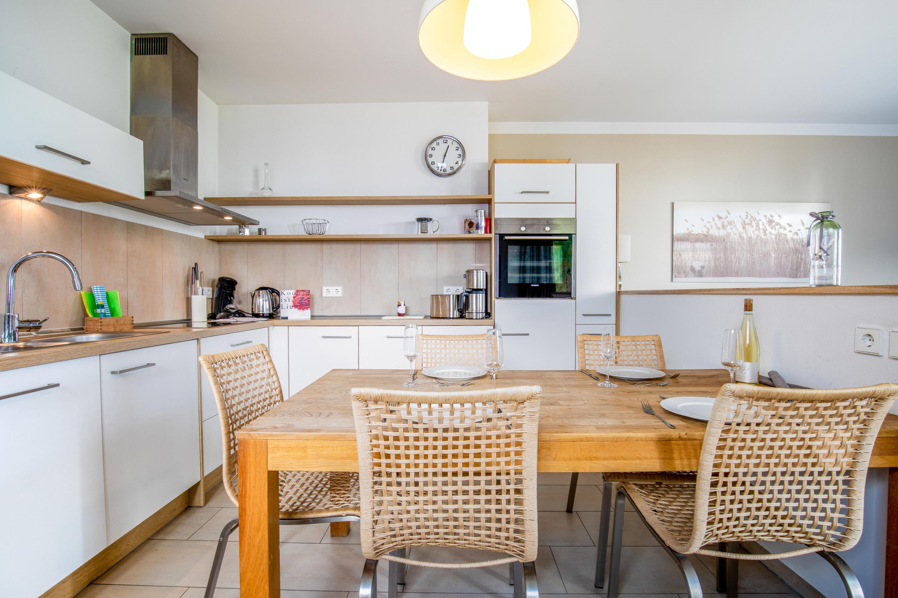Hinter seiner bauhaustypischen Fassade verfügt Ihr Urlaubsdomizil über zwei Schlafzimmer mit bequemen Doppelbetten, großen Kleiderschränken und Flachbild-TV, zwei Bäder, eine Finnische Sauna, ein geräumiges Wohnzimmer mit Kaminofen, Schlafcouch, Flatscreen-TV sowie voll ausgestatteter Wohnküche mit Essbereich und einer großen Außenterrasse. Auf der Terrasse stehen Ihnen in der warmen Jahreszeit bequeme Sitzmöbel und ein Grill zur Verfügung, so dass man die Sommerabende bei Leckereien vom Grill wunderbar ausklingen lassen kann.