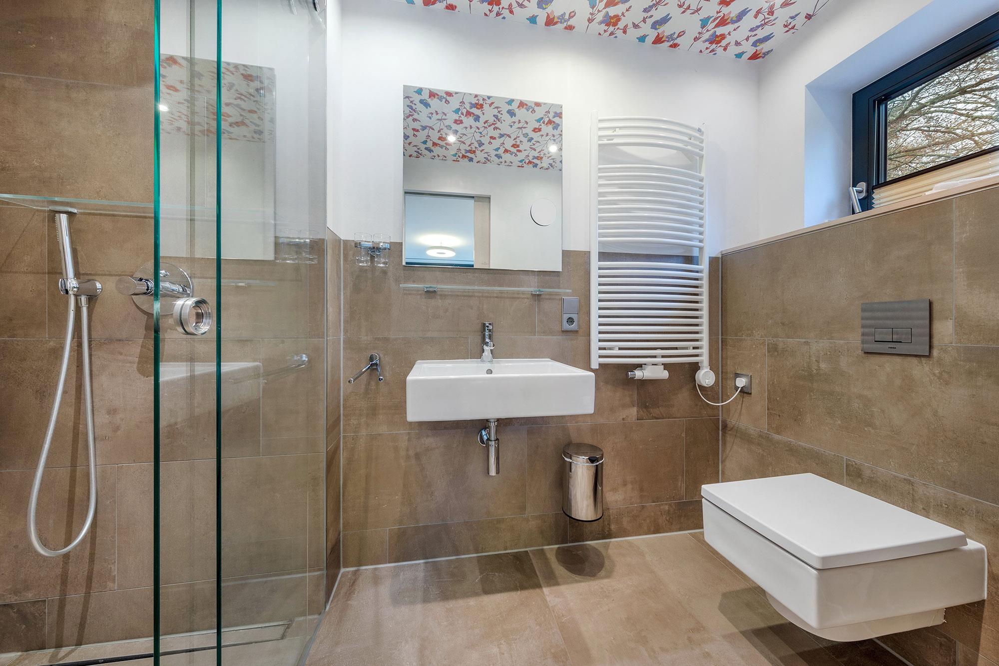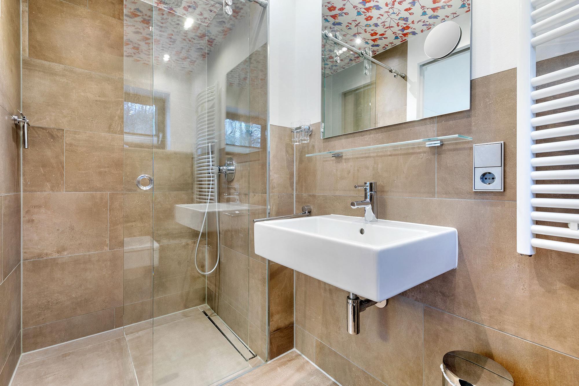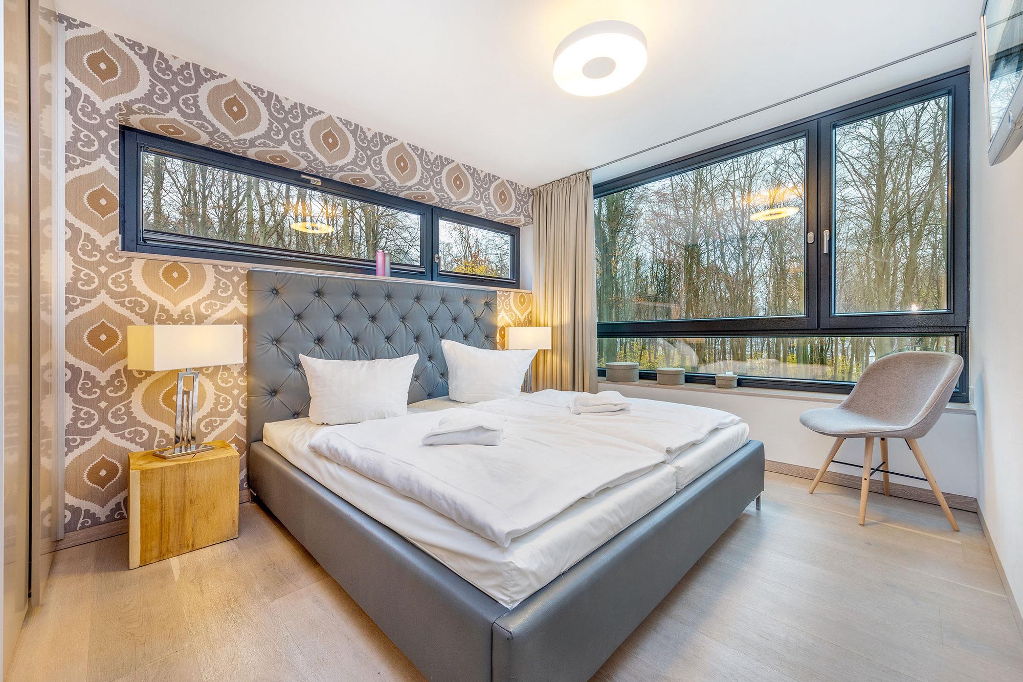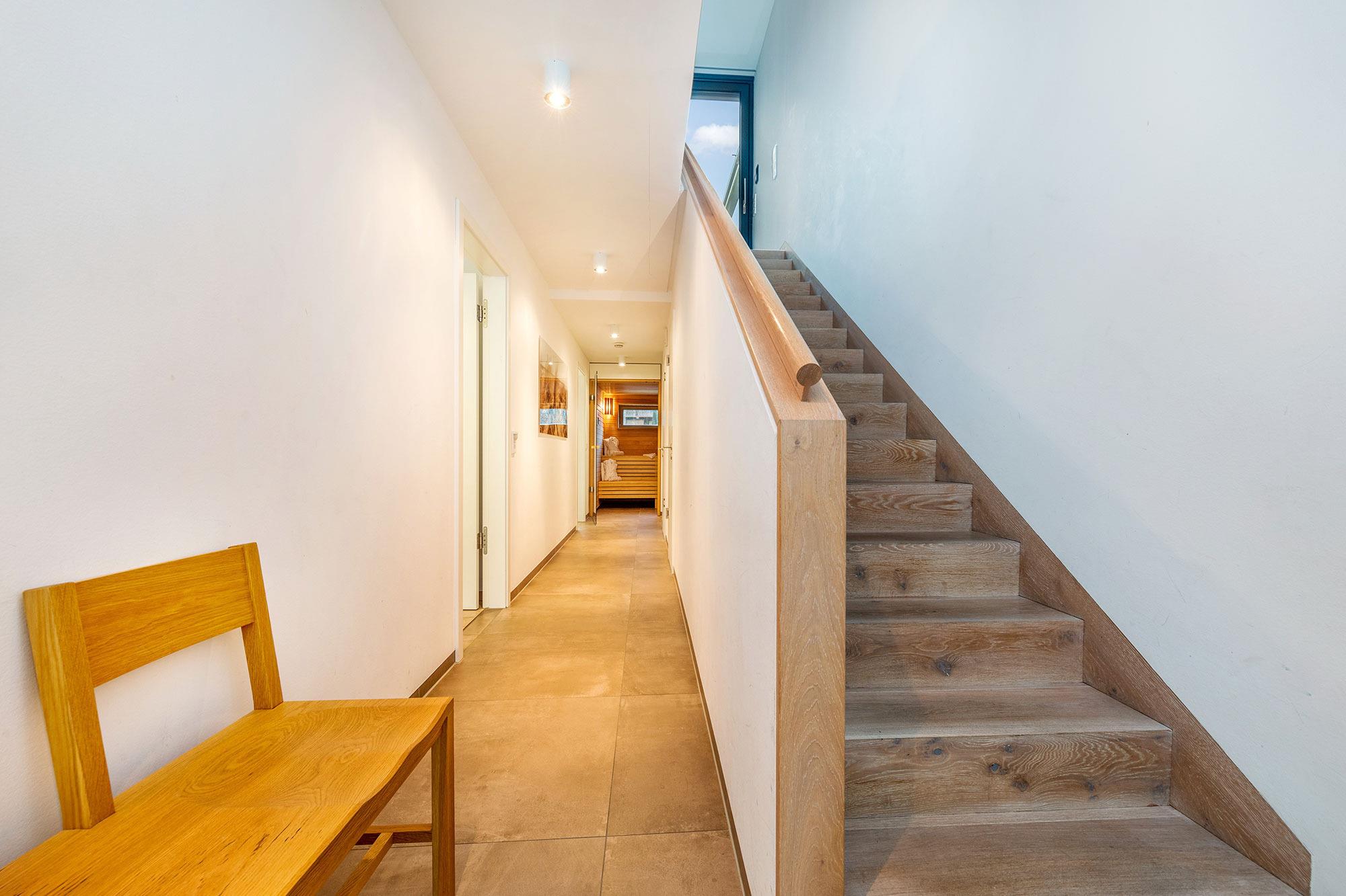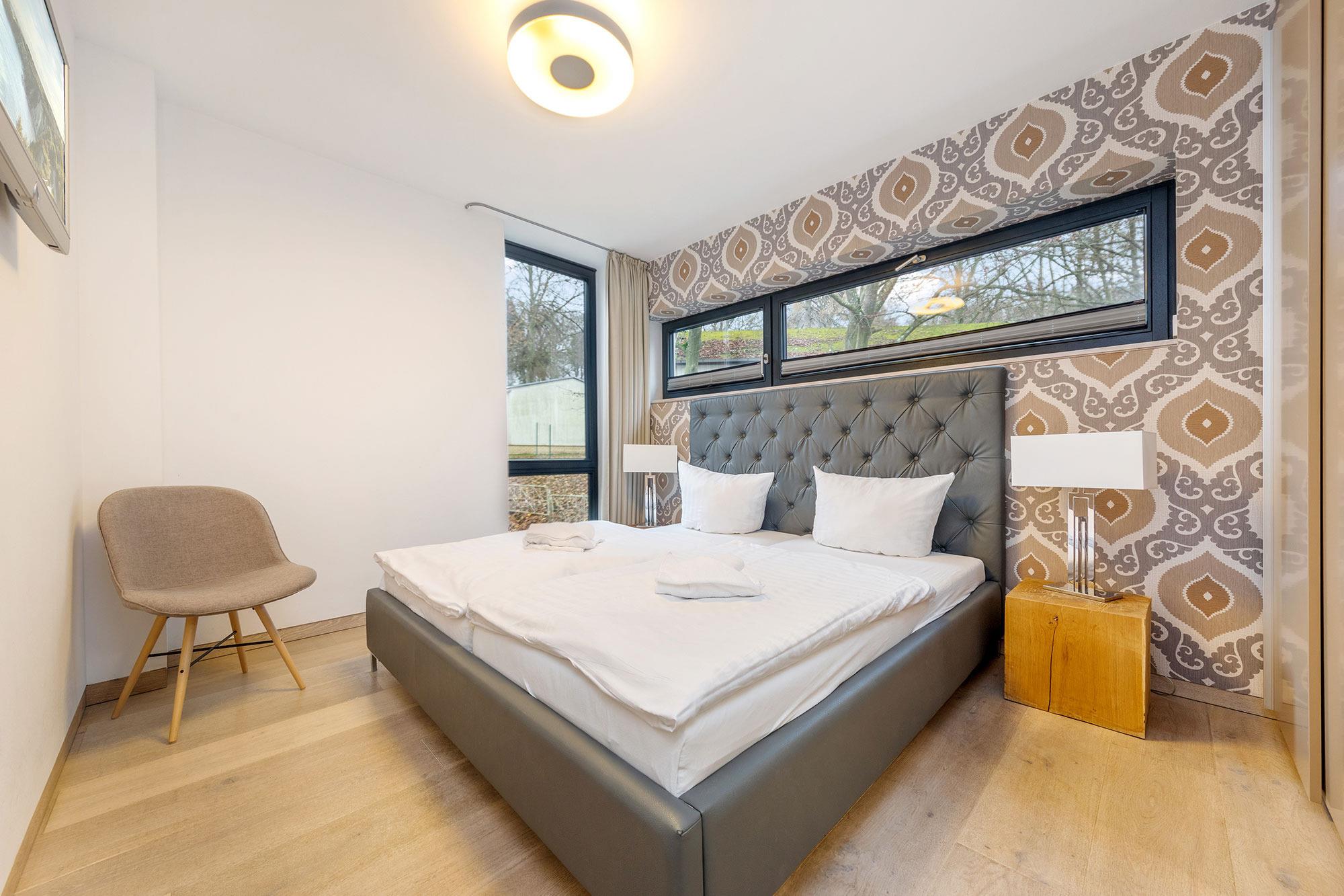 Auf der großen, nach Südwesten ausgerichteten Dachterrasse laden unter dem vollautomatischen Sonnensegel bequeme Sitzmöbel und ein BBQ-Grill zum gemütlichen Verweilen ein. Darunter warten im ersten Obergeschoss zwei elegant eingerichtete Schlafzimmer und exklusive Ensuite-Bäder darauf, von Ihnen entdeckt zu werden. Hier befindet sich auch die finnische Farblicht-Sauna, die Sie jederzeit für Ihr individuelles Verwöhnprogramm nutzen können. Die im gesamten Appartement vorhandene Fußbodenheizung sorgt für ein angenehmes Raumklima und unterstützt Ihre Entspannung zusätzlich.