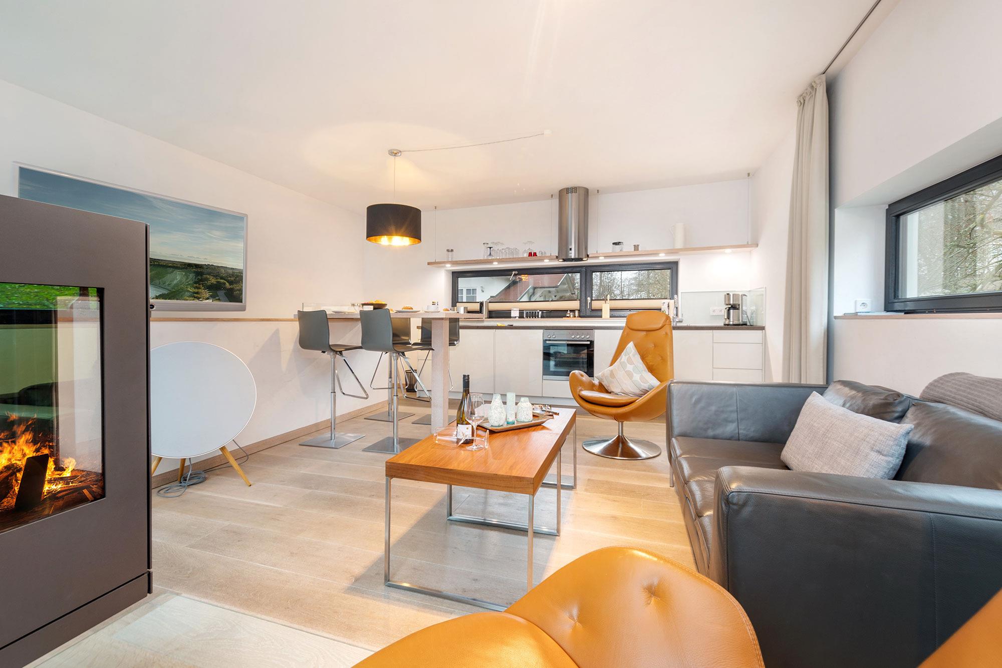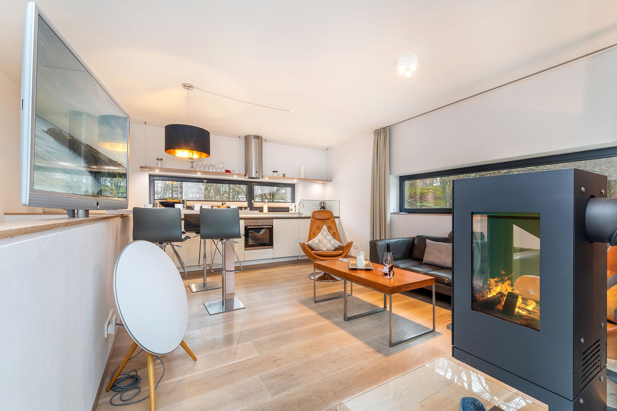 Das 3-Raum-Penthouse Küstensegler erstreckt sich über das erste Obergeschoss und das Dachgeschoss der Strandvilla und erfüllt auf 93 Quadratmetern Wohnfläche alle Urlaubsträume von bis zu vier Personen. Hochwertige Leder- und Eichenmöbel, pointierte Dekorationen und modernste Unterhaltungselektronik zaubern ein Ambiente der Spitzenklasse. Eines der vielen Highlights ist dabei ganz sicher der geräumige Wohn- und Essbereich mit seiner integrierten Designerküche, deren exklusive Ausstattung Funktionalität und Komfort in vollkommener Weise verbindet.