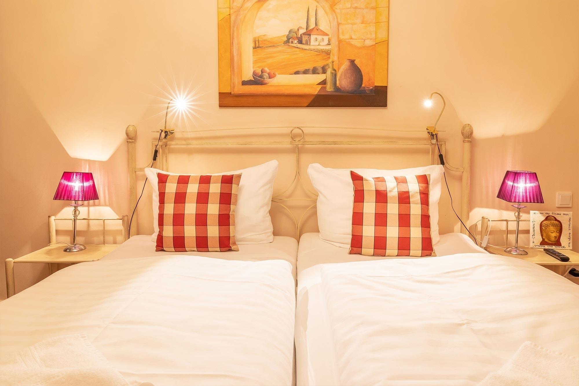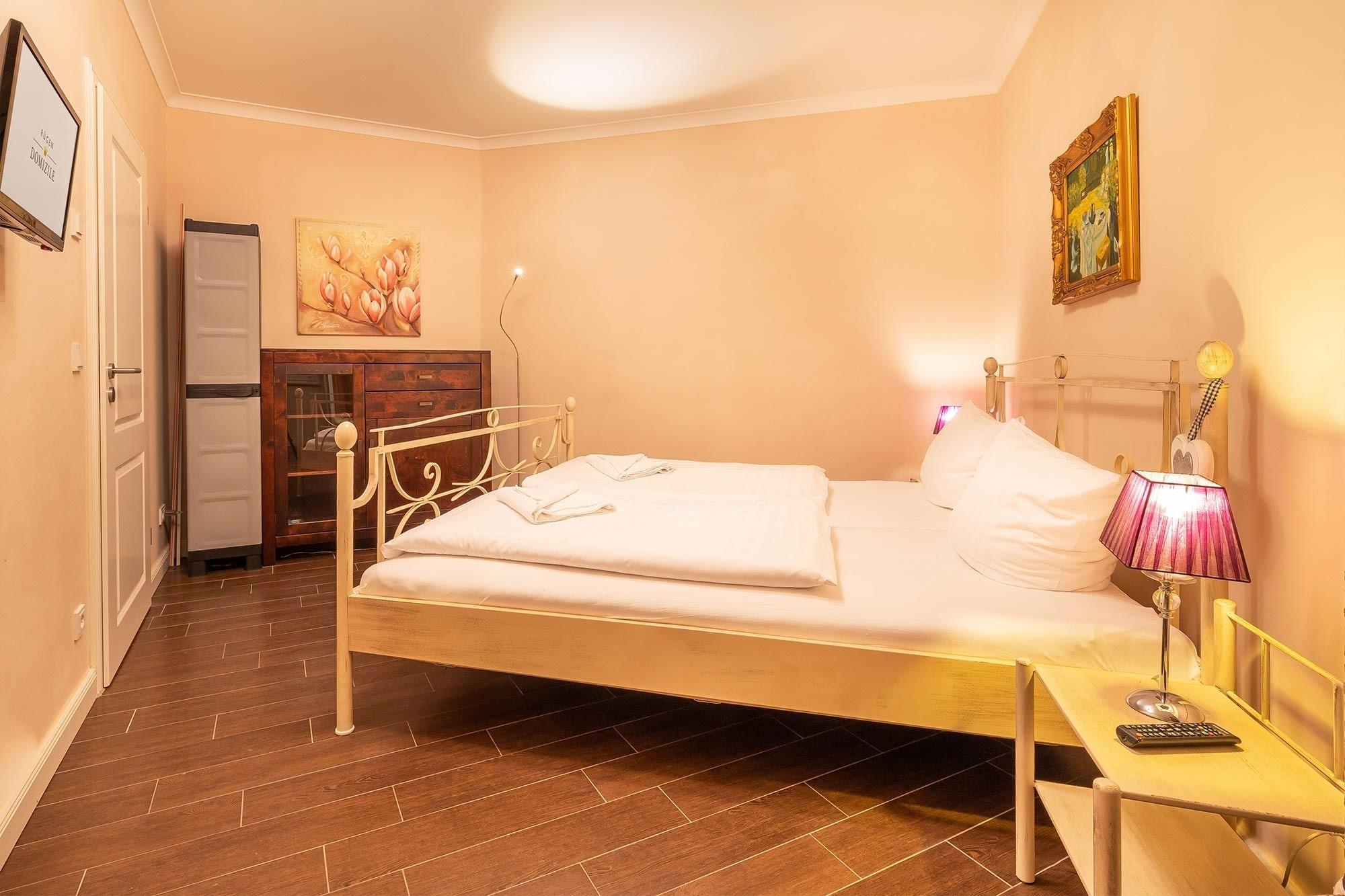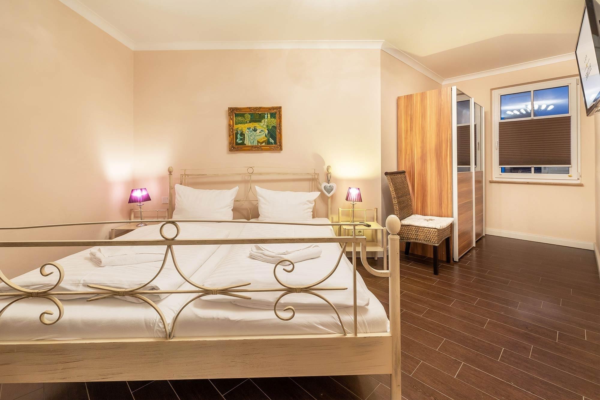 Als Ruckzugsort erwartet Sie in den beiden Schlafzimmern jeweils ein stilvolles Metallbett (180x200 cm) und ein großer geräumiger Kleiderschrank. Die Ferienwohnung verfügt über ein modernes Duschbad.