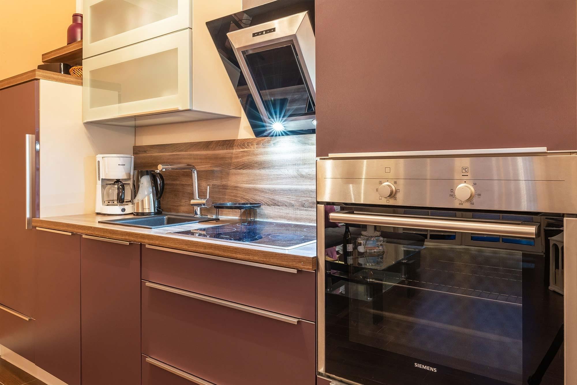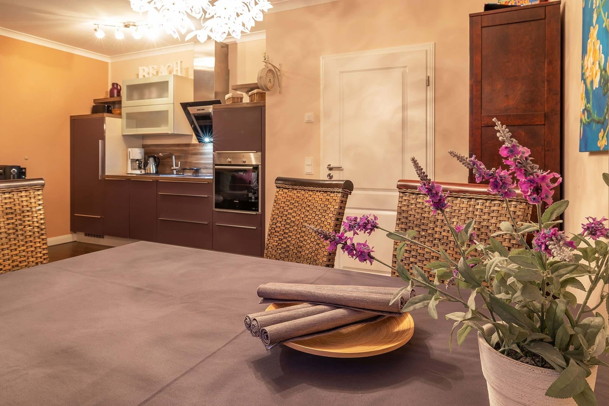 Die integrierte Küchenzeile lässt keine Wünsche offen, vom integrierten Cerankochfeld, Backofen, sowie einer Spülmaschine und diversem Kleininventar, können Sie hier Ihren Kochkünsten freien Lauf lassen. Kreieren Sie kleine Köstlichkeiten und genießen Sie diese bei einem Glas Wein in Ihrem Strandkorb auf der möblierten Terrasse.