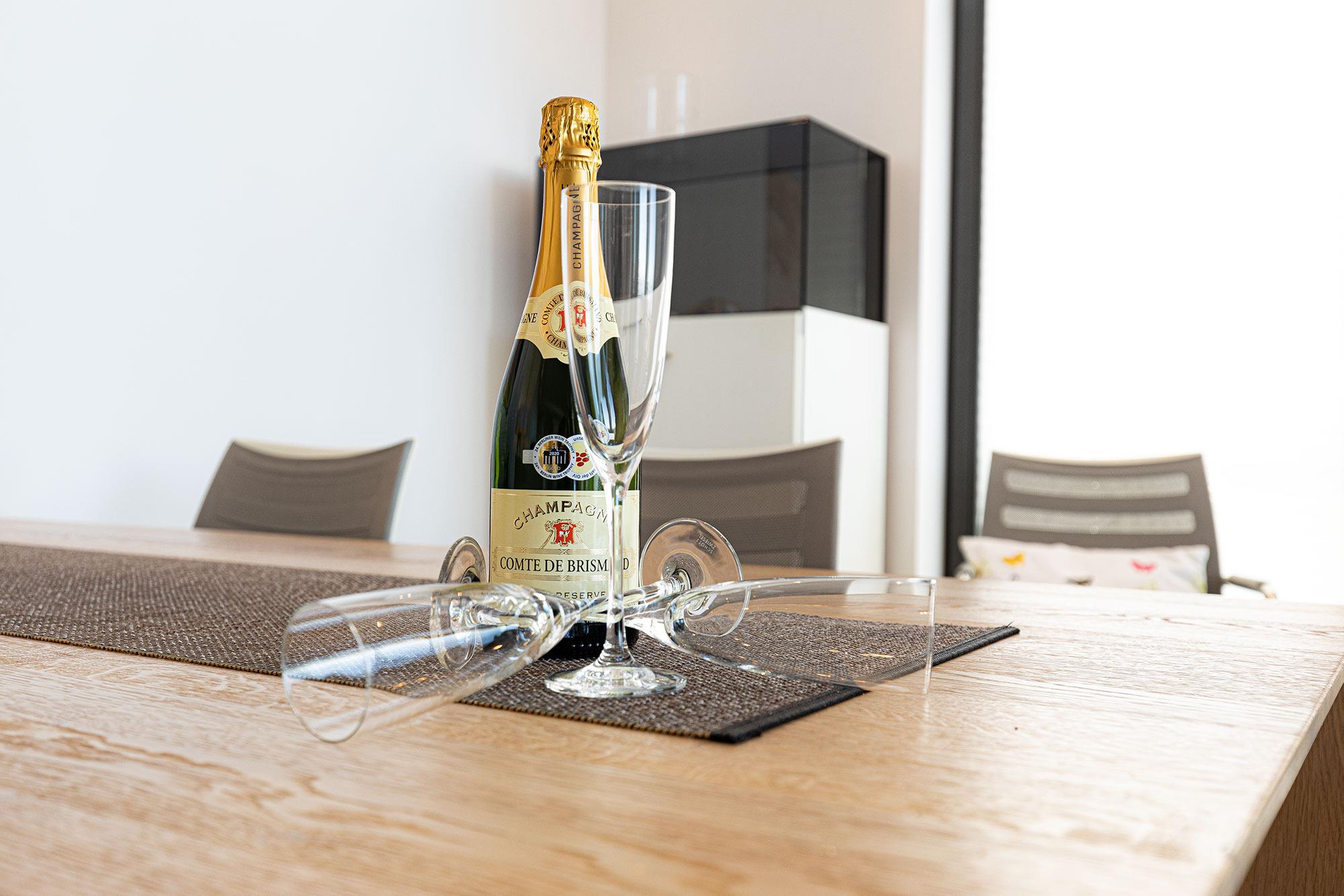 Vom Eingangsbereich aus gelangen Sie zunächst in den weitläufigen Wohn- und Essbereich mit Eichenholzdielung in maritimer Optik. Bodentiefe Fenster ermöglichen eine freie Sicht auf das Meer. Die offene und hochwertig ausgestattete Luxusküche mit professionellem Equipment lässt keine Wünsche offen. Der große Esstisch aus Wildeiche bietet Ihnen und Ihren Gästen ausreichend Platz für ein gemütliches Zusammensein.