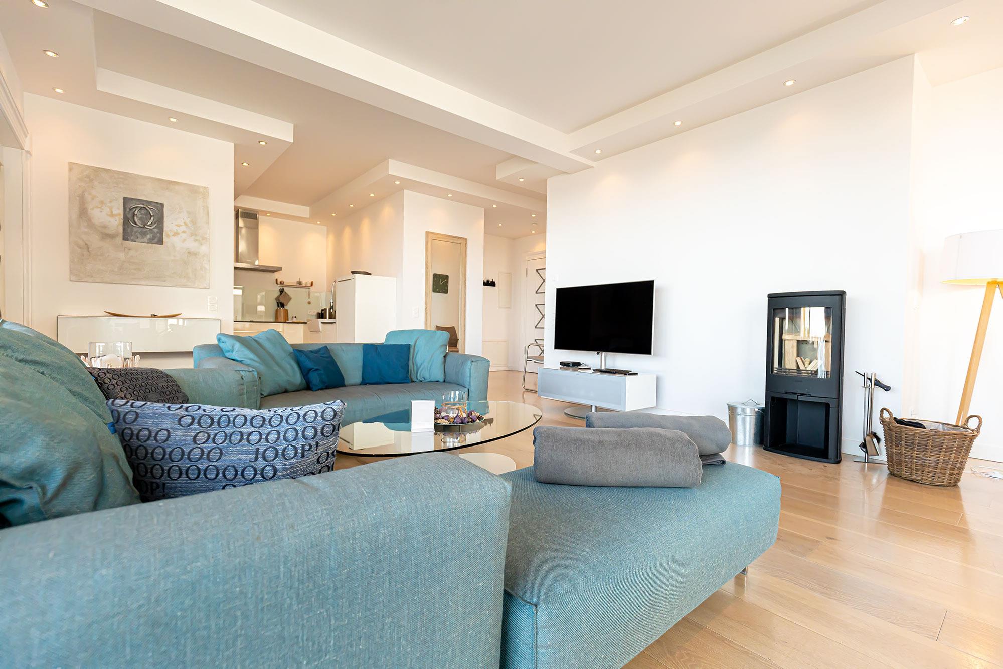 Das Appartement Ocean Blue befindet sich in der 2. Etage der Villa Claire, ist rund 110 Quadratmeter groß und verspricht bis zu fünf Personen einen Urlaub der Spitzenklasse. Für die Einrichtung wurden ausschließlich exquisite Möbel namhafter Marken, wie Rolf Benz und Hülsta, verwendet. Sofort beim Eintreten verspürt man das behagliche Gefühl dieses frischen und modernen Ambientes. Kamin und Fußbodenheizung sorgen für Gemütlichkeit und die dimmbare Beleuchtung für stimmungsvolle Stunden.