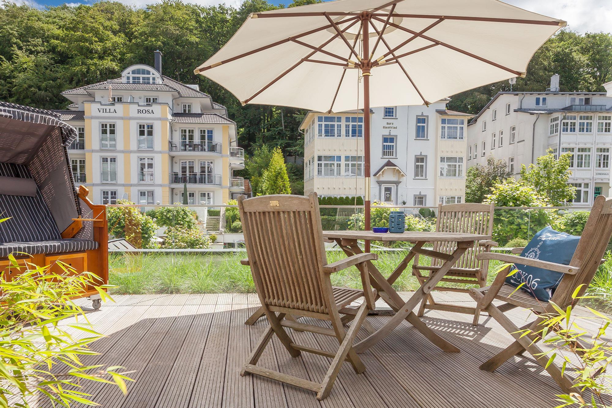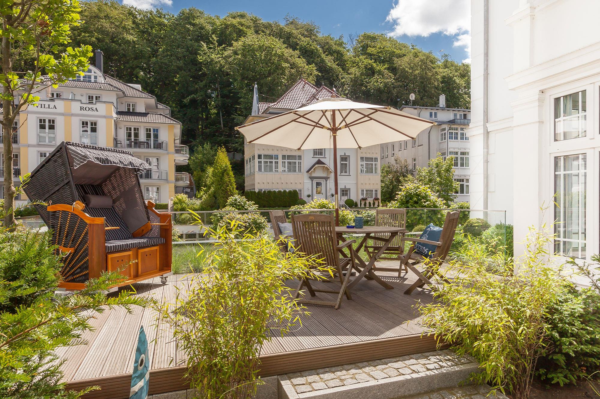 In der warmen Jahreszeit lädt Sie vor der FeWo Ihre private, schön begrünte Terrasse mit Teakholzmöbeln und Strandkorb zum gemütlichen Sitzen an der frischen Ostseeluft ein. Durch die erhöhte Lage sind Sie dabei vor neugierigen Blicken von der Wilhelmstraße geschützt und genießen trotzdem selbst quasi einen "Logenplatz mit Aussicht".