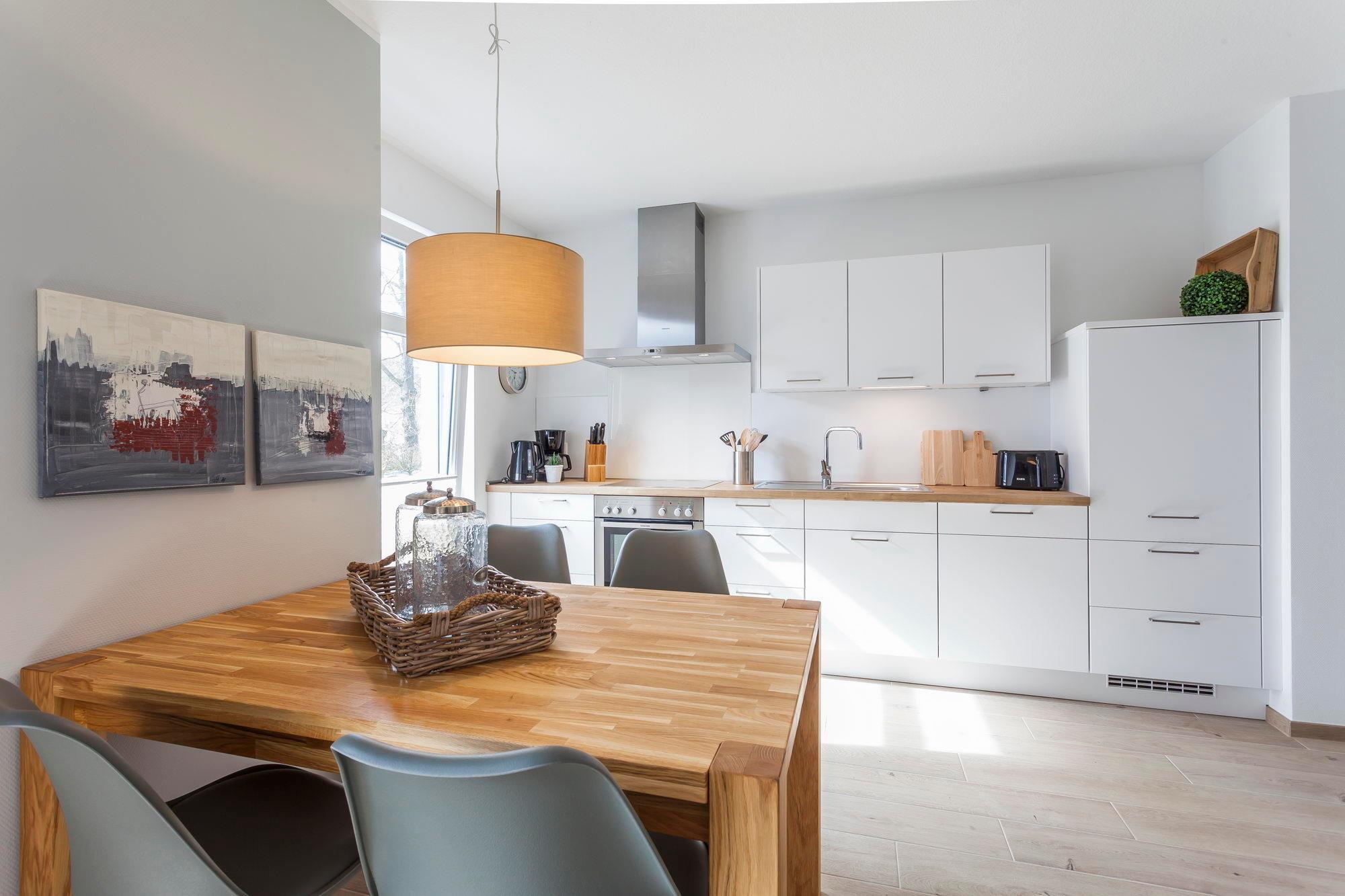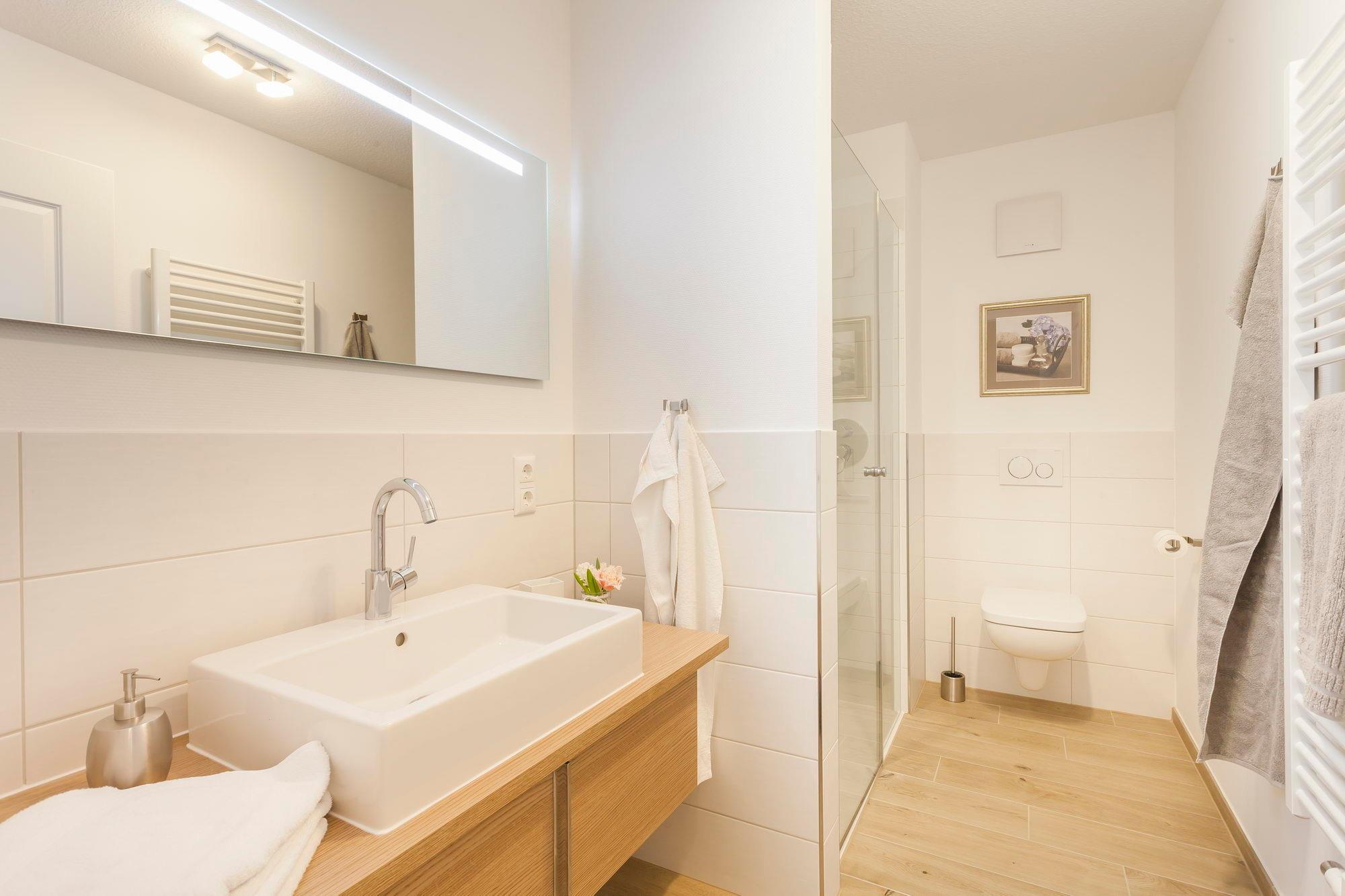 Im Schlafzimmer verspricht Ihnen ein Massivholzbett mit hochwertigen Lattenrosten und luxuriösen Matratzen erholsamen Schlaf und süße Träume. Das Badezimmer begeistert mit einem 1,20 x 0,90 Meter großen, bodengleichen Duschraum, wertvollen Duravit-Badmöbeln und Grohe-Armaturen sowie edlen Natursteinfliesen. Die hochwertig ausgestattete Küchenzeile im kombinierten Wohn- und Esszimmer verfügt neben allen wichtigen Utensilien zum Kochen selbstverständlich über einen Geschirrspüler, einen Kühlschrank und einen Backofen. Auch die übrige technische Ausstattung ist vom Feinsten: Die Fußbodenheizung unter dem in Holzoptik gefliesten Boden sorgt für ein angenehmes Raumklima. Wohn- und Schlafzimmer verfügen jeweils über einen 32 Zoll großen LCD-Fernseher, es gibt eine Musikanlage und W-LAN steht selbstverständlich ebenfalls zur Verfügung.
