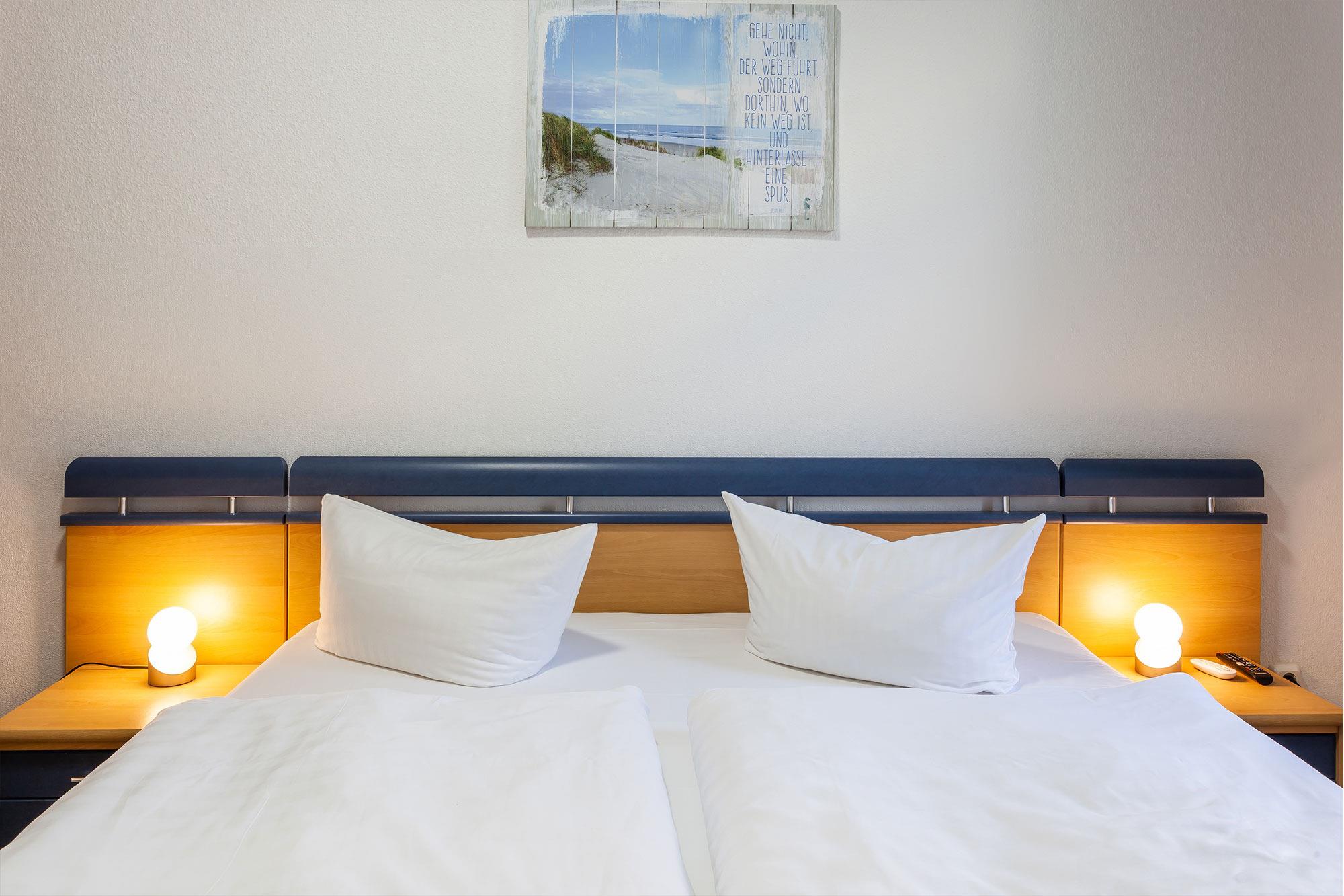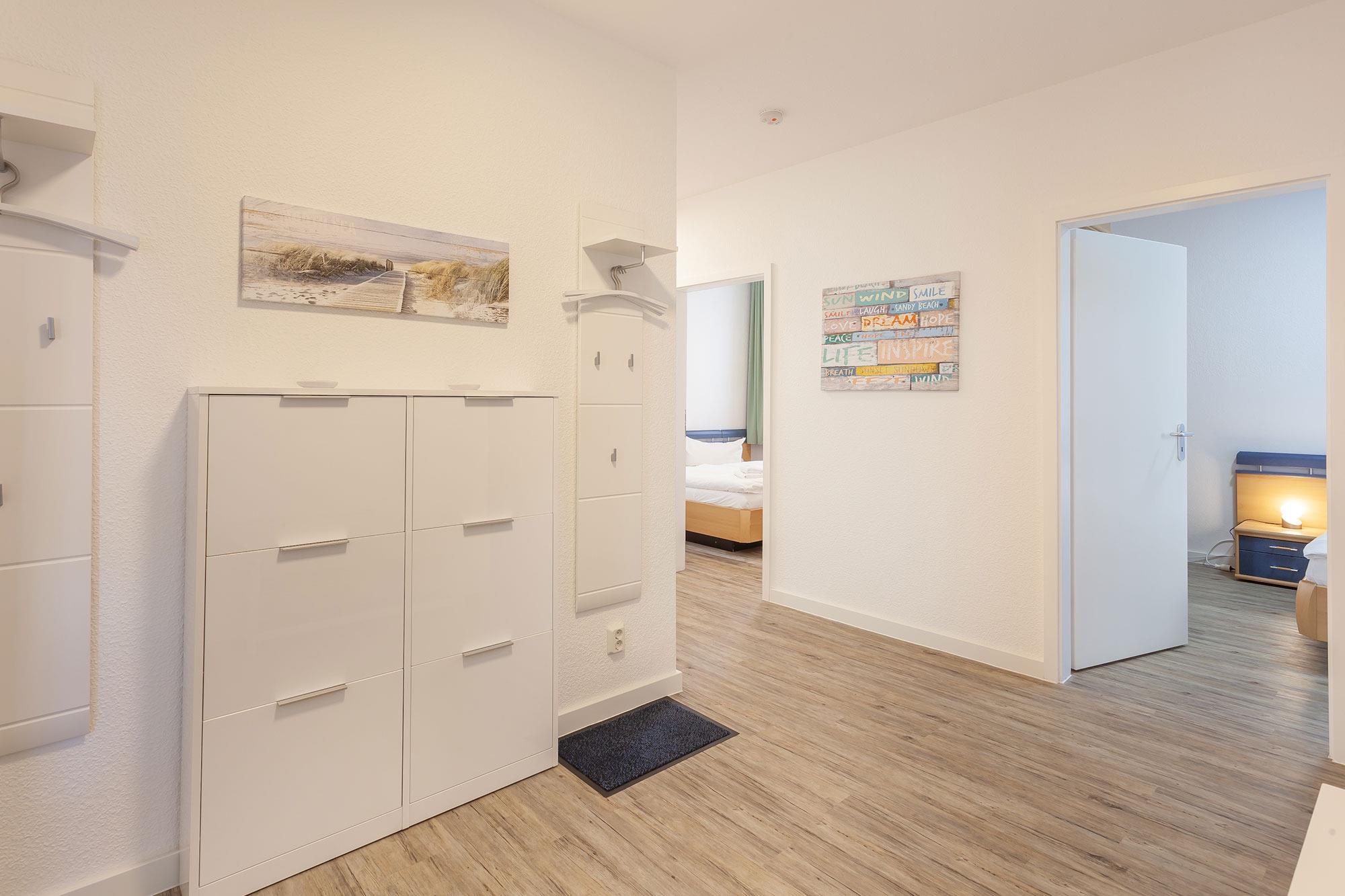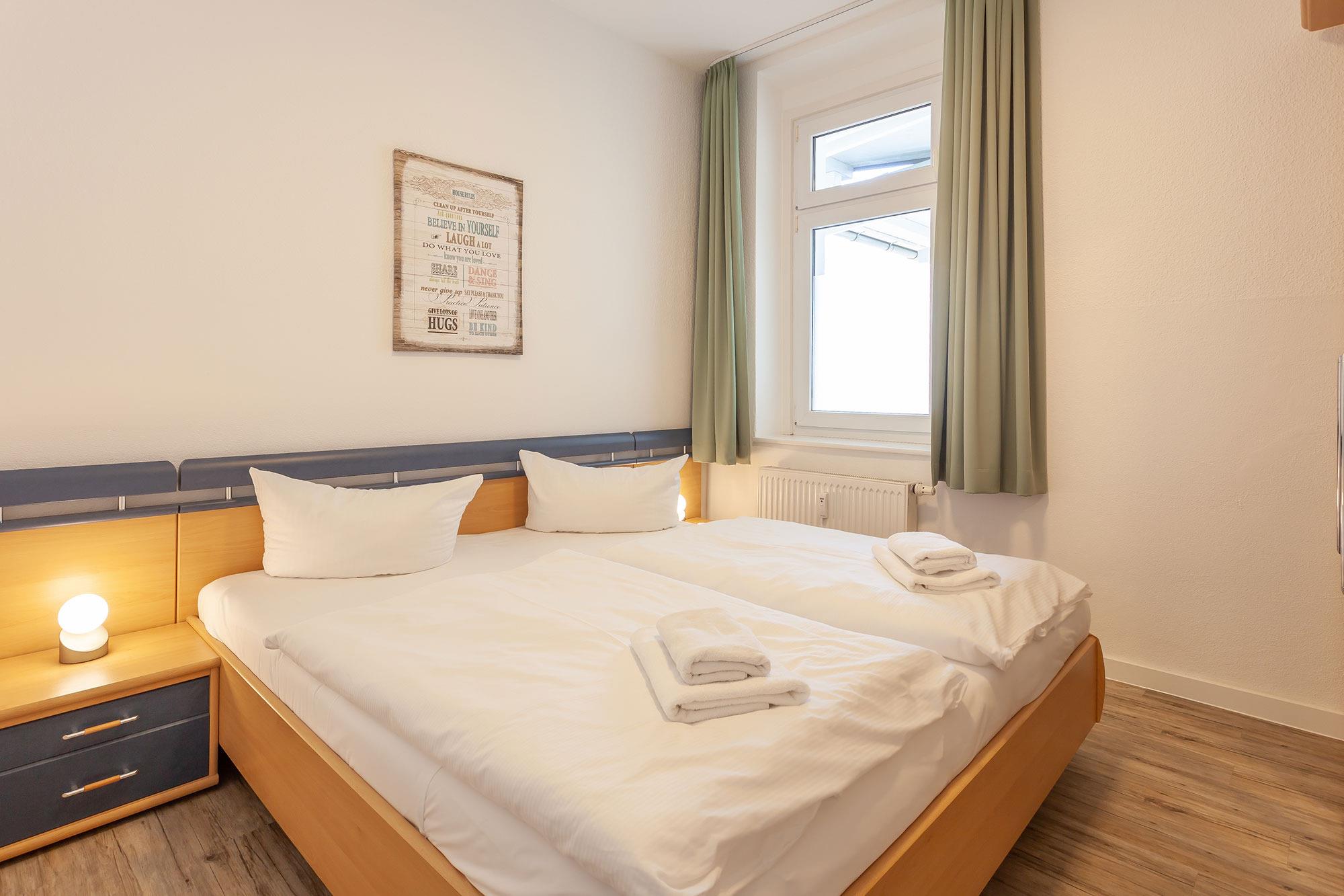 Zwei Schlafzimmer mit je einem Doppelbett und einem geräumigen Kleiderschrank bieten Platz für 4 Personen. Eine Aufbettung zur 5. und 6. Person ist auf der ausziehbaren Schlafcouch im Wohnzimmer möglich. Das Badezimmer überzeugt mit einem geräumigen Duschbad und einem separaten WC mit Handwaschbecken.