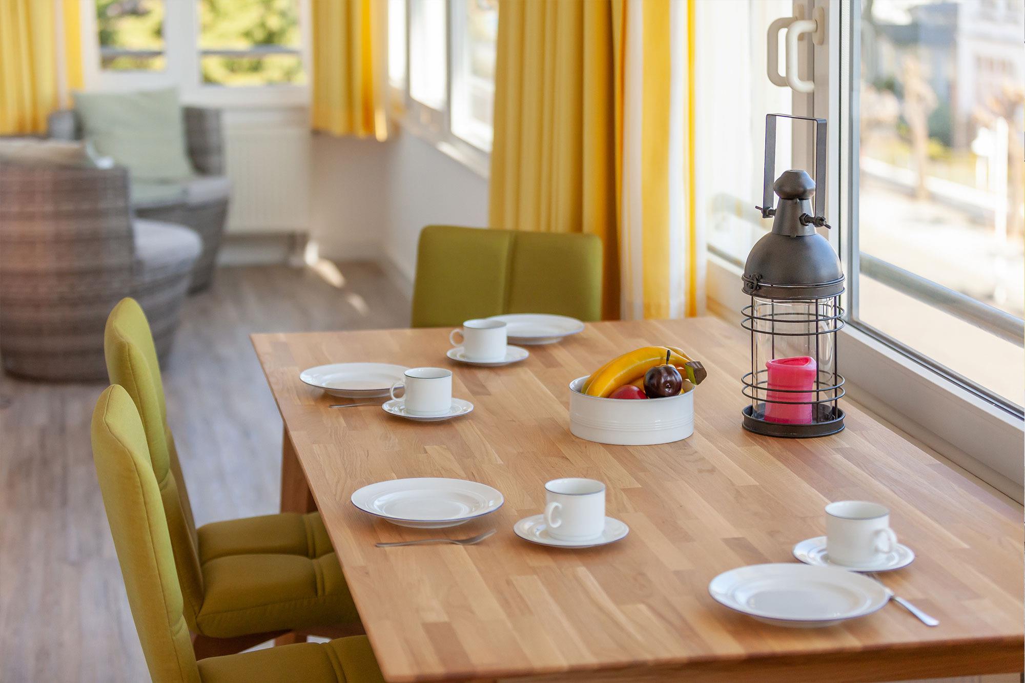 Die in der Villa Meeresgruss gelegene Ferienwohnung bietet auf 70qm Platz für bis zu 4 Personen. Eine Aufbettung zur 3. und 4. Person befindet sich im offenen Wohnbereich, dieser ist ausgestattet mit einer Schlafcouch (Federkernauflage). Der Wintergarten lädt mit Blick auf die Wilhelmstrasse zum Verweilen ein. Die vollausgestattete Einbauküche im Wohnbereich lässt keine Wünsche offen, hier können Sie gemeinsam kochen und den Abend bei einem Glas Wein im Wintergarten ausklingen lassen.