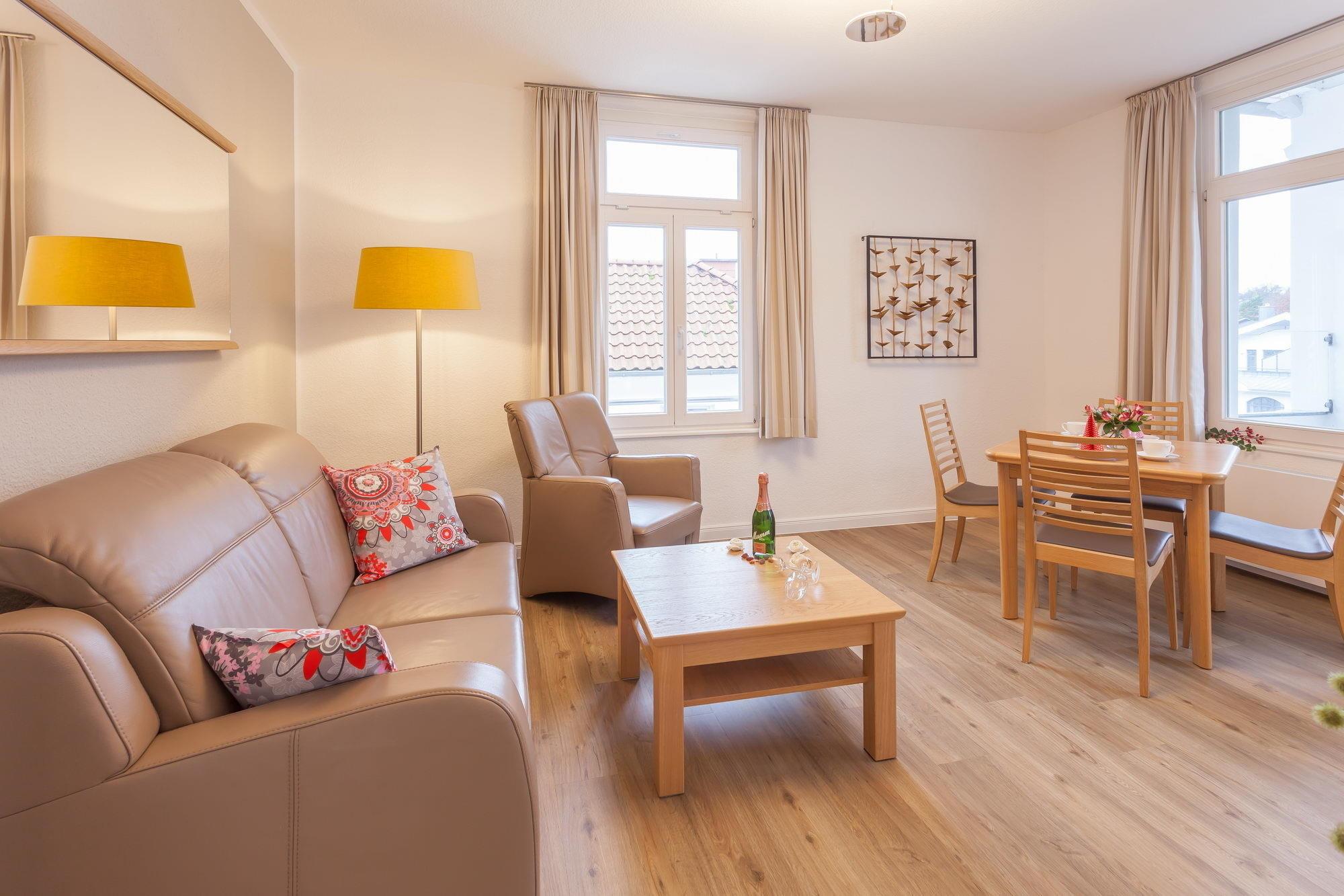 Von der Nachmittags- und Abendsonne beschienen, lädt Sie die große, möblierte Loggia ein, dem bunten Treiben an Sellins Flaniermeile, der Wilhelmstraße, zuzusehen. Dank der Überdachung sitzen Sie hier auch bei schlechterem Wetter geschützt und trocken. Drinnen im Wohnzimmer können Sie es sich auf der Couch gemütlich machen, die sich bei Bedarf in ein 140 x 200 cm großes Bett verwandeln lässt. Ein großer Flachbild-TV mit HDMI-Anschluss, eine Stereoanlage und natürlich auch kostenfreies W-LAN sorgen für die nötige mediale Unterhaltung.