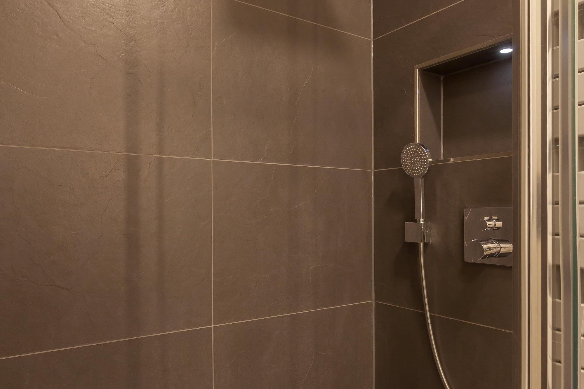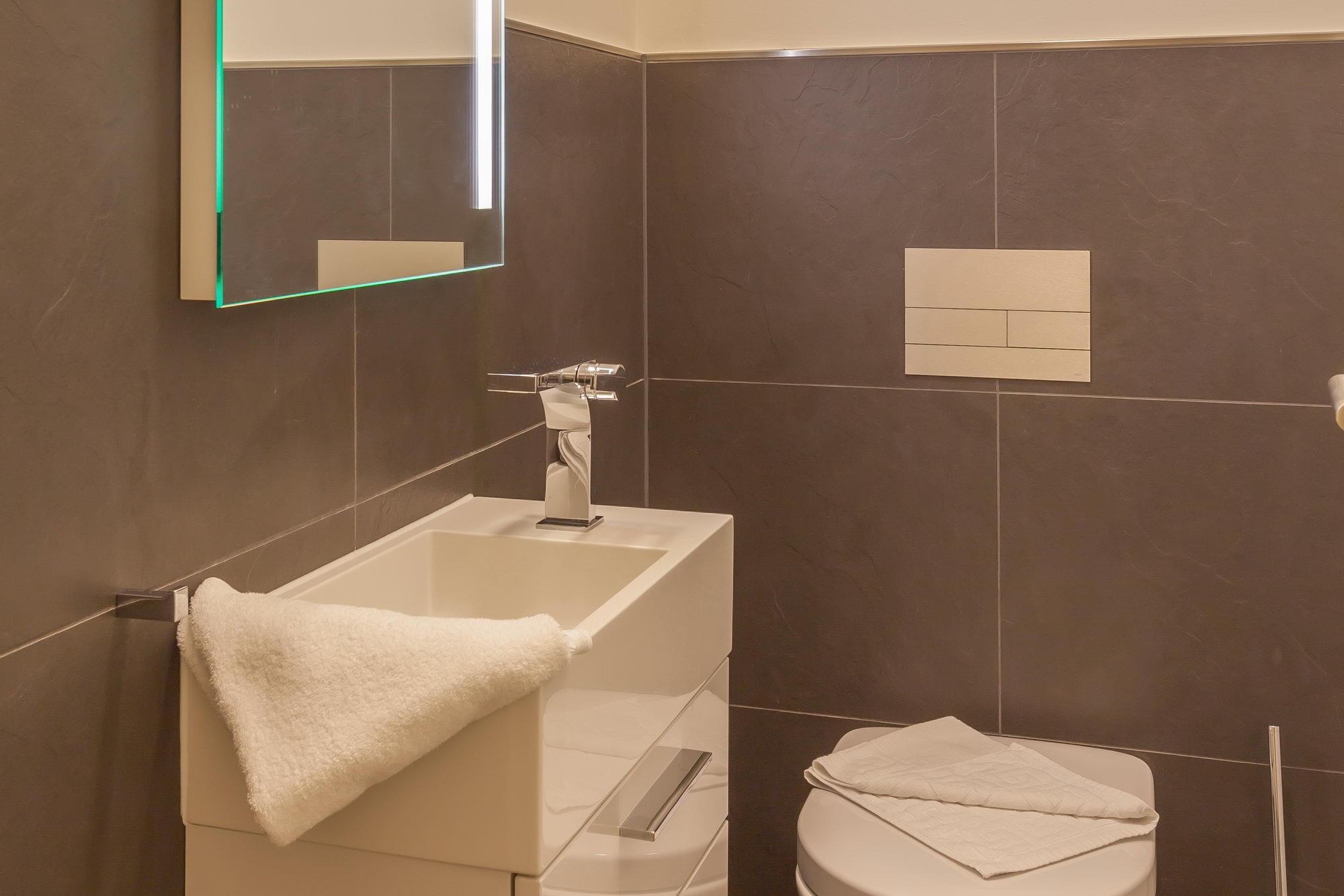 Das stilvoll geflieste Badezimmer Ihrer Fewo ist mit einer großen bodentiefen Dusche, Waschtisch und WC ausgestattet. Ein zusätzliches Gäste-WC sorgt für entspannten Komfort.