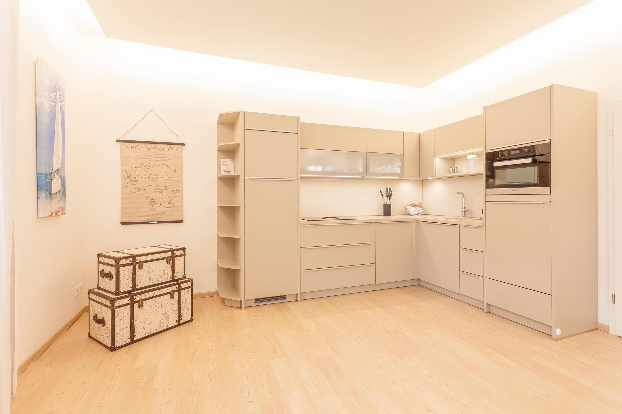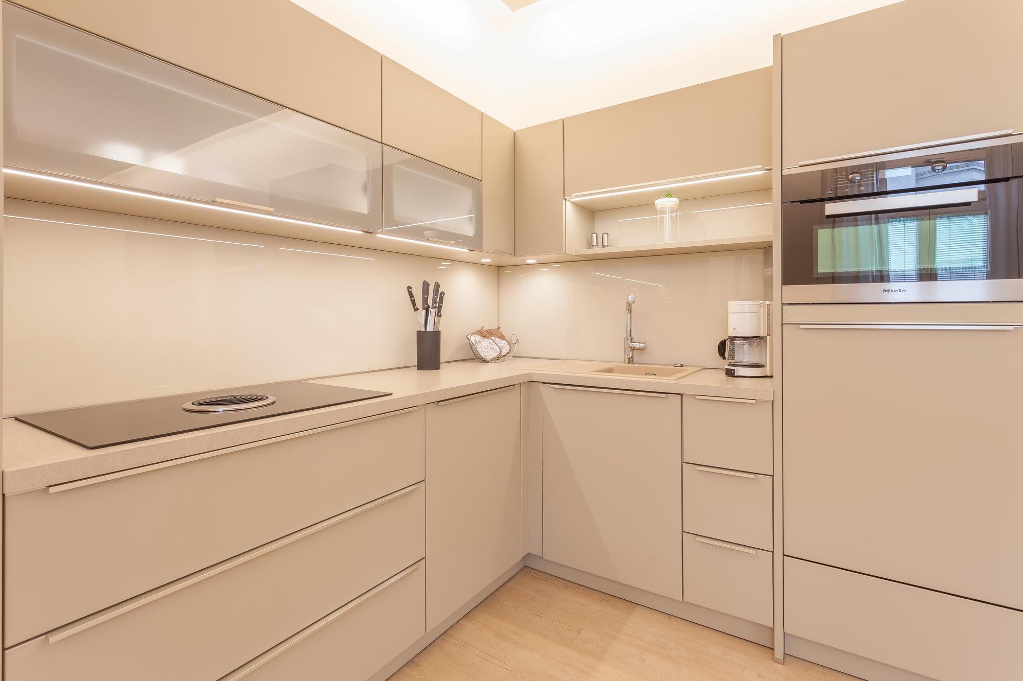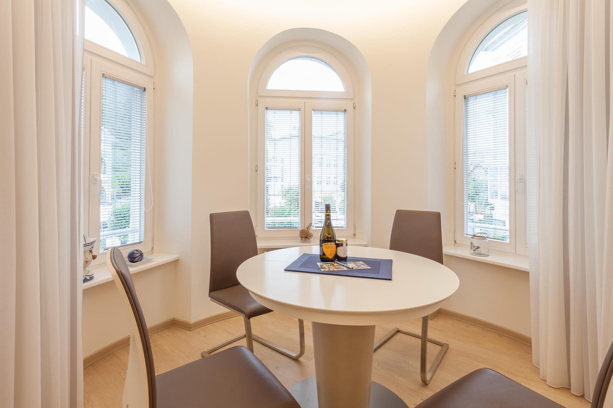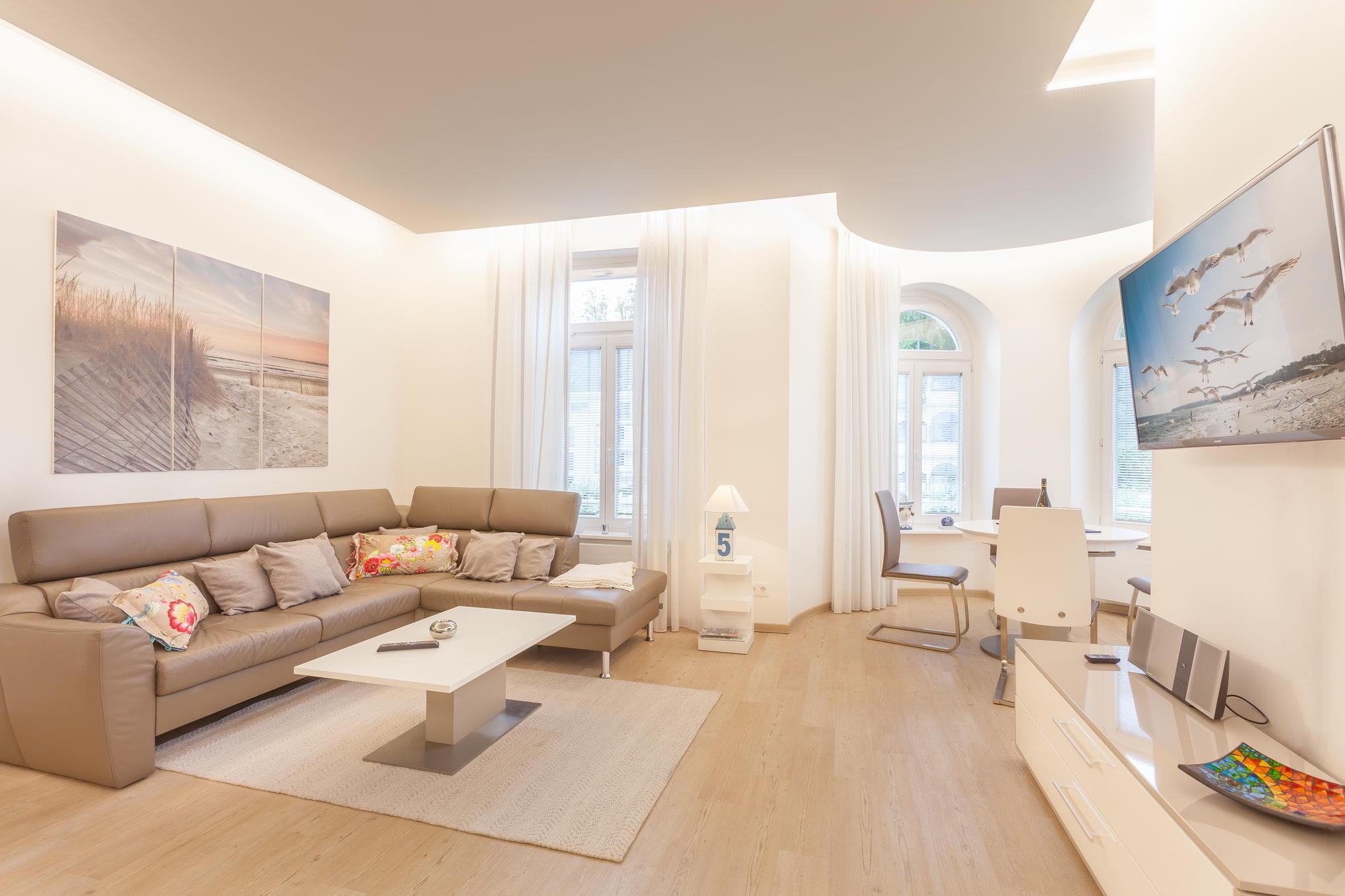 Die Fewo ist auf gut 90 qm Wohnfläche und dreieinhalb Zimmern für bis zu fünf Personen ausgelegt. Der großzügige Wohn-, Koch- und Essbereich besticht neben gemütlichen Couchmöbeln, einem großformatigen Flachbild-TV, einer Stereoanlage und kostenfreiem W-LAN mit seiner bestens ausgestatteten Küche von MIELE. Dank Kühl-/Gefrierkombi, Ceran-Induktionsherd, Backofen, Spülmaschine, Kaffeemaschine, Wasserkocher, Toaster etc. können Sie sich bequem selbst "bekochen", wenn Sie nicht gerade in einem der zahlreichen guten Restaurants in der Nähe speisen. Der Esstisch im kreisrunden Erker bietet jedenfalls genügend Platz für ein stilvolles Essen ganz in Familie.