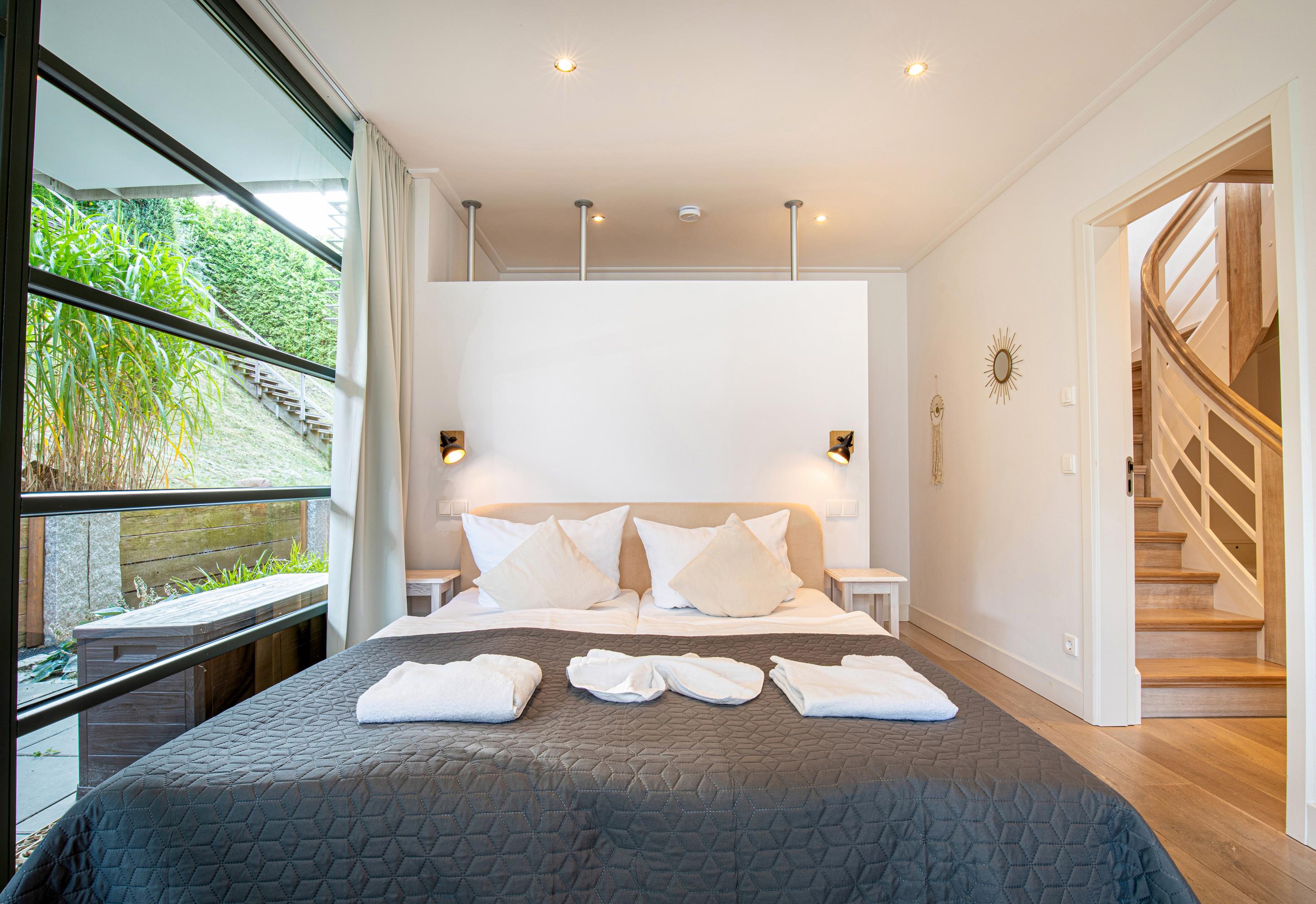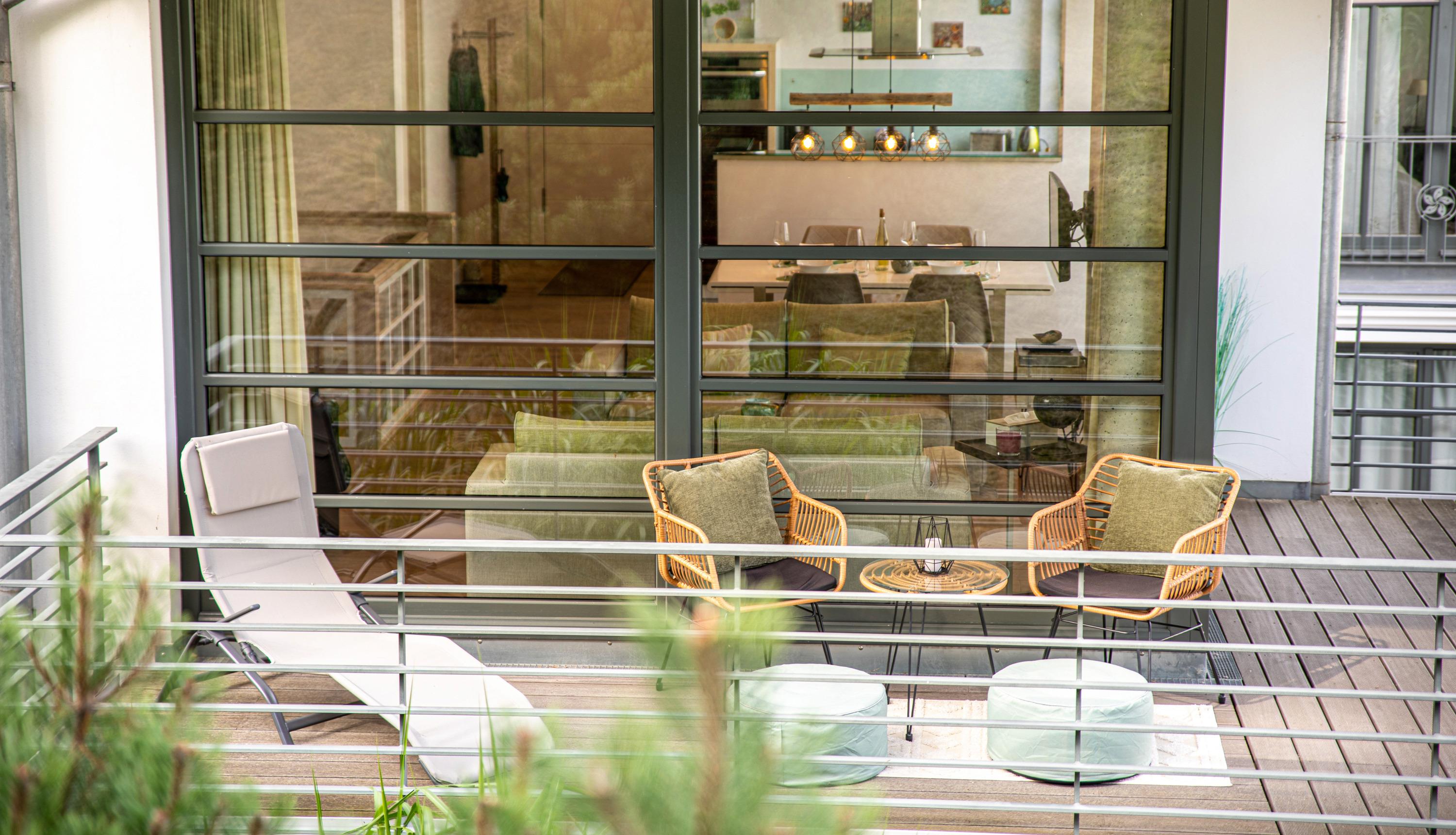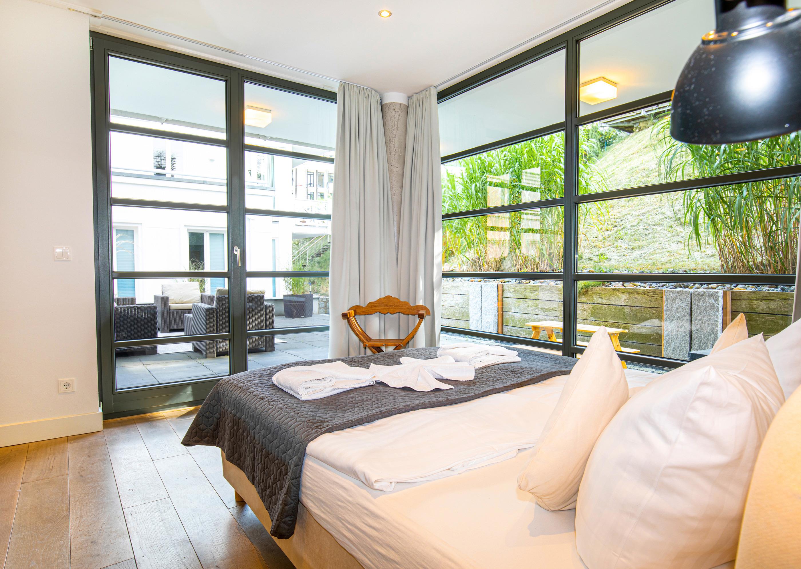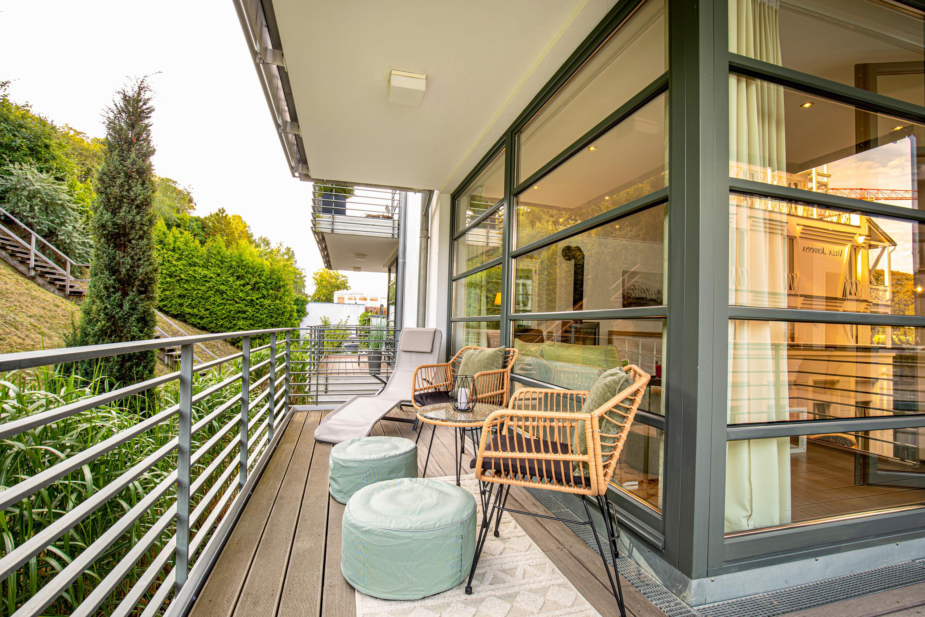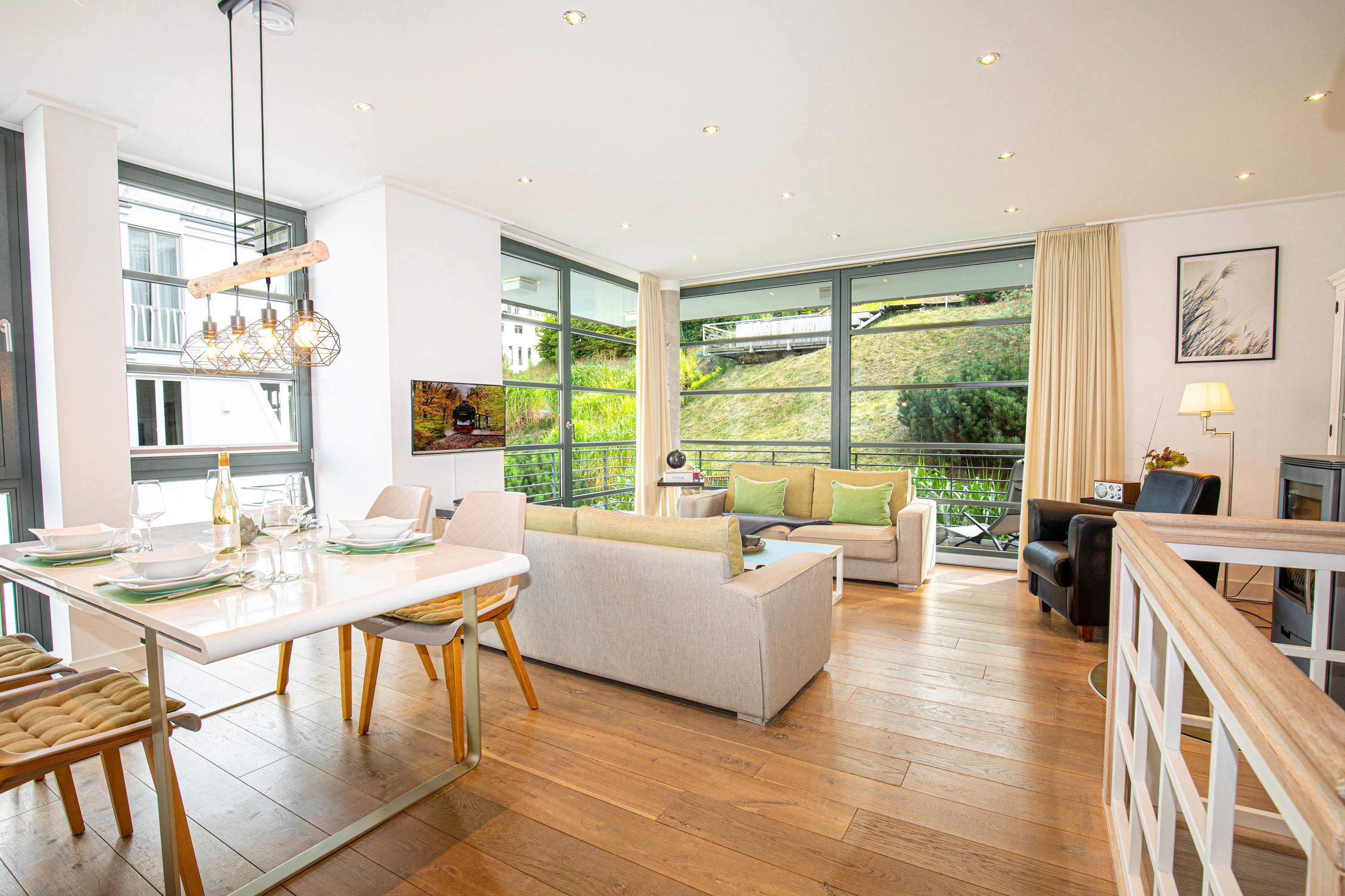Der großzügige Wohnbereich der Wohnung ist durch viele bodentiefe Fenster lichtdurchflutet. Das besondere Highlight dieser Ferienwohnung ist die Möglichkeit, sowohl von der Terrasse als auch dem großen Balkon im Obergeschoss die herrliche Ruhe und den Blick in den eigens angelegten Garten des Hauses zu genießen. In den Sommermonaten lässt sich außerdem herrlich im Pool entspannen.