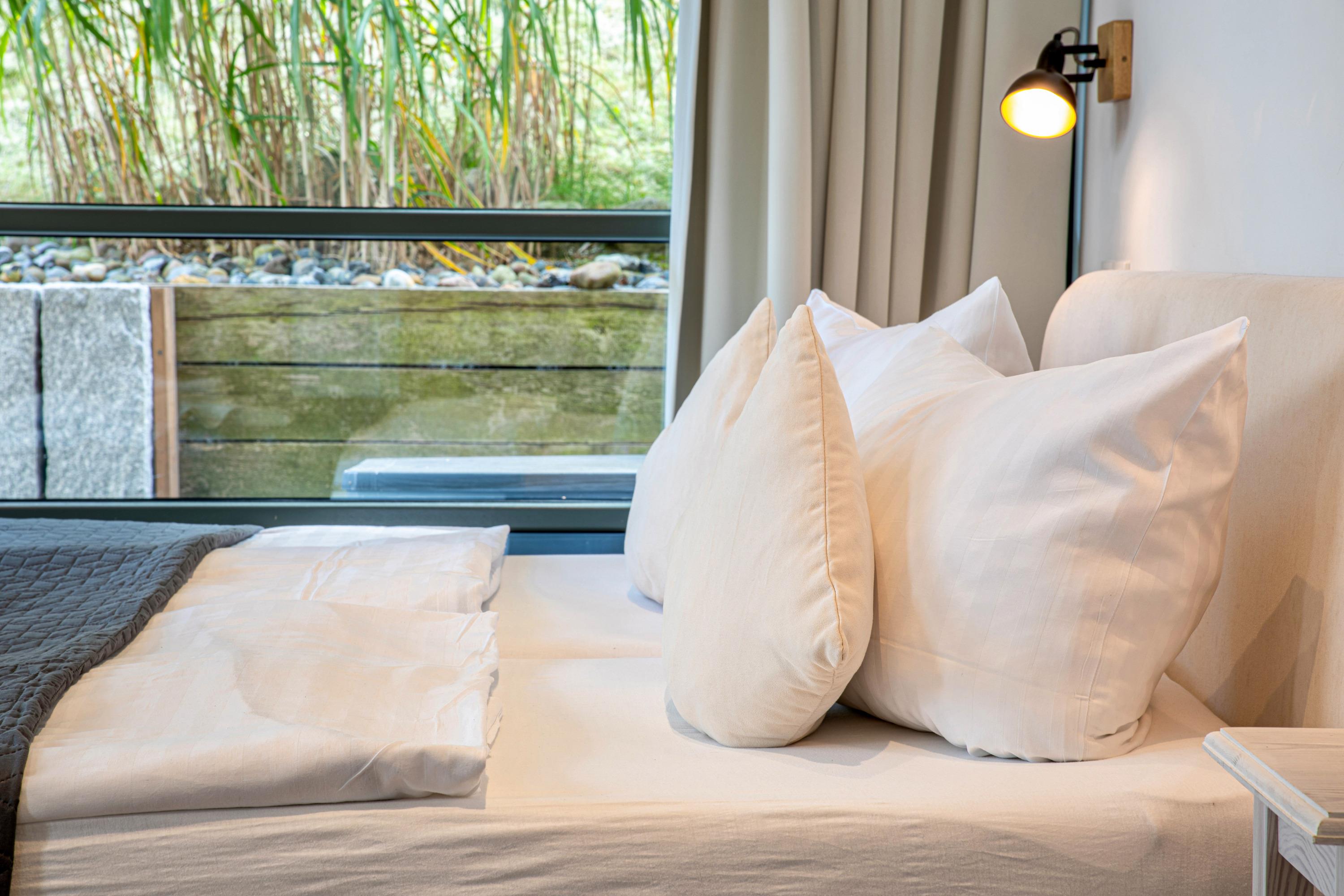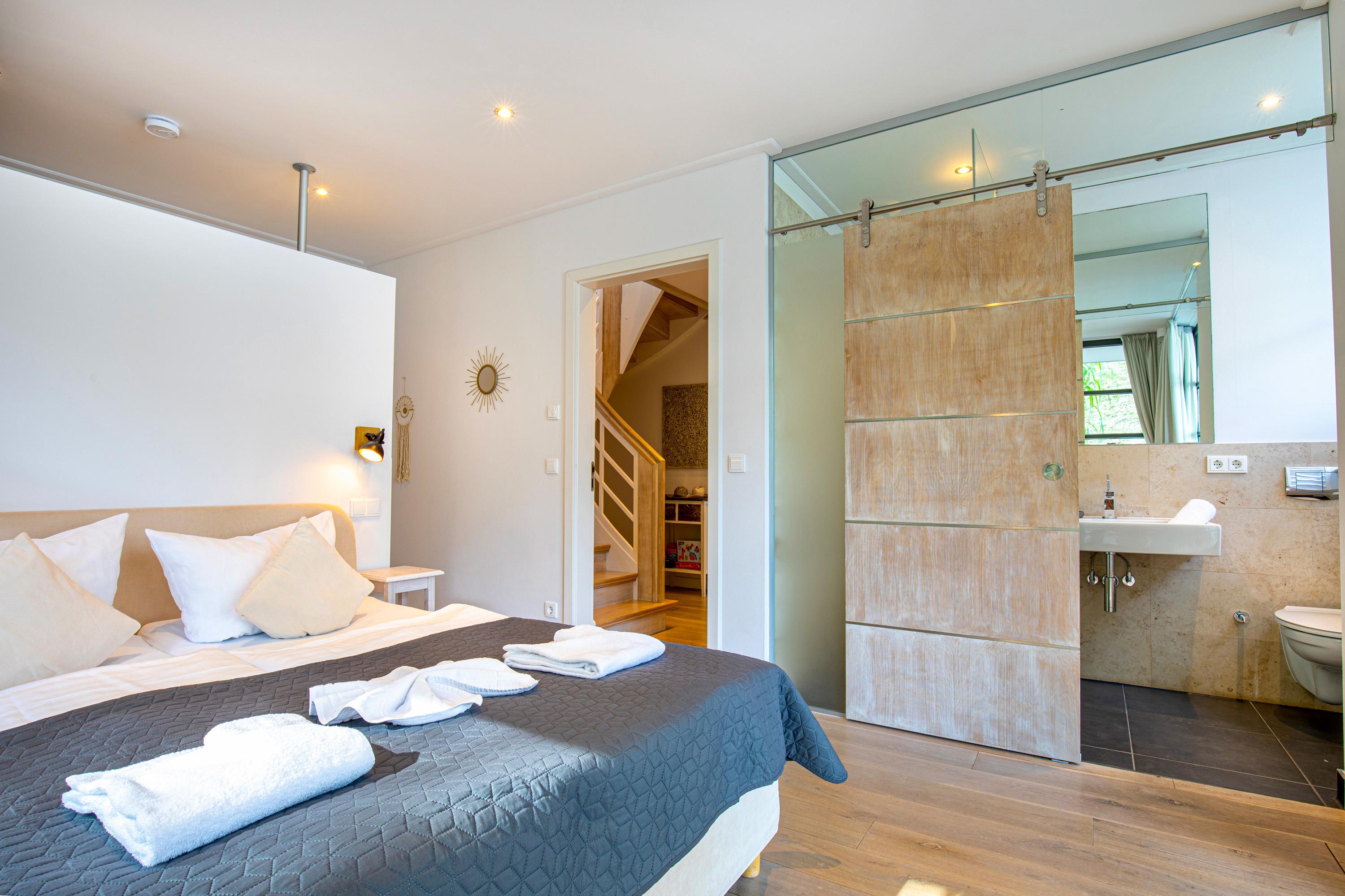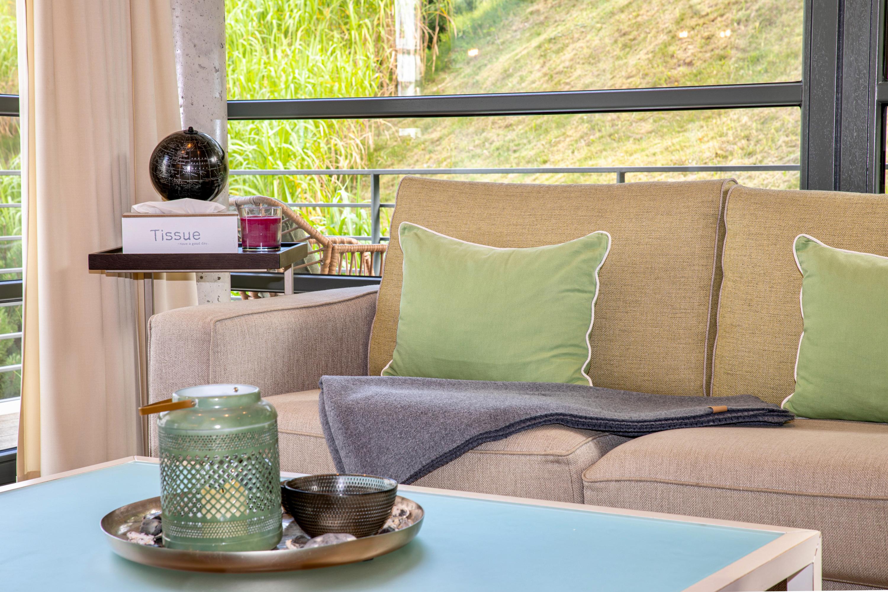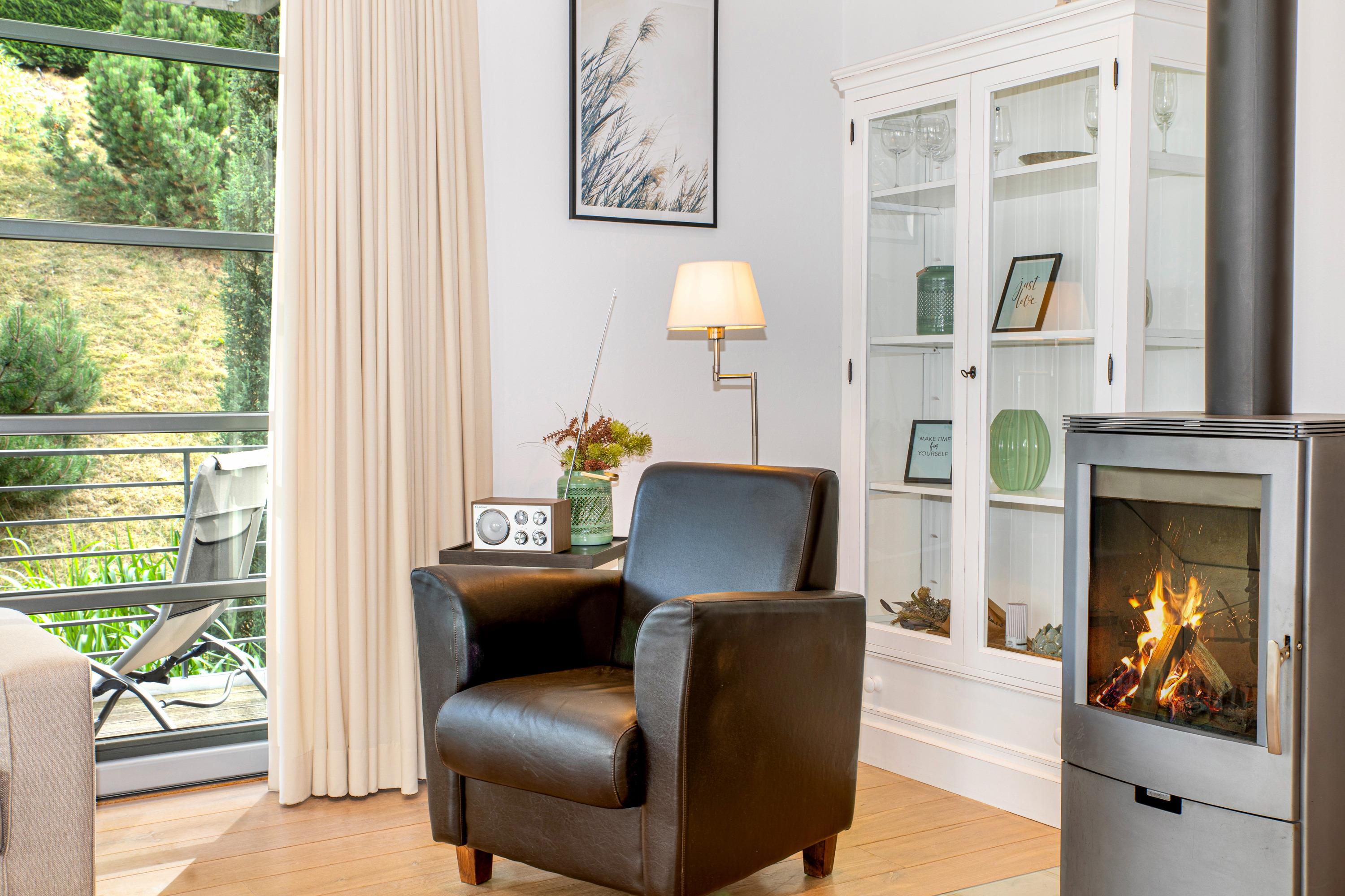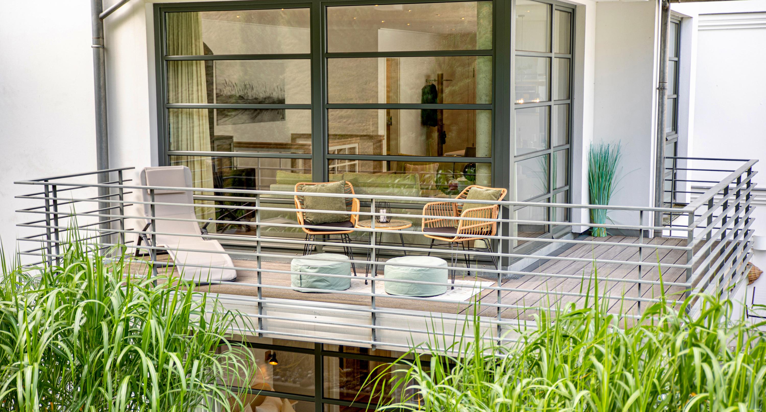 Der großzügige Wohnbereich der Wohnung ist durch viele bodentiefe Fenster lichtdurchflutet. Das besondere Highlight dieser Ferienwohnung ist die Möglichkeit, sowohl von der Terrasse als auch dem großen Balkon im Obergeschoss die herrliche Ruhe und den Blick in den eigens angelegten Garten des Hauses zu genießen. In den Sommermonaten lässt sich außerdem herrlich im Pool entspannen.