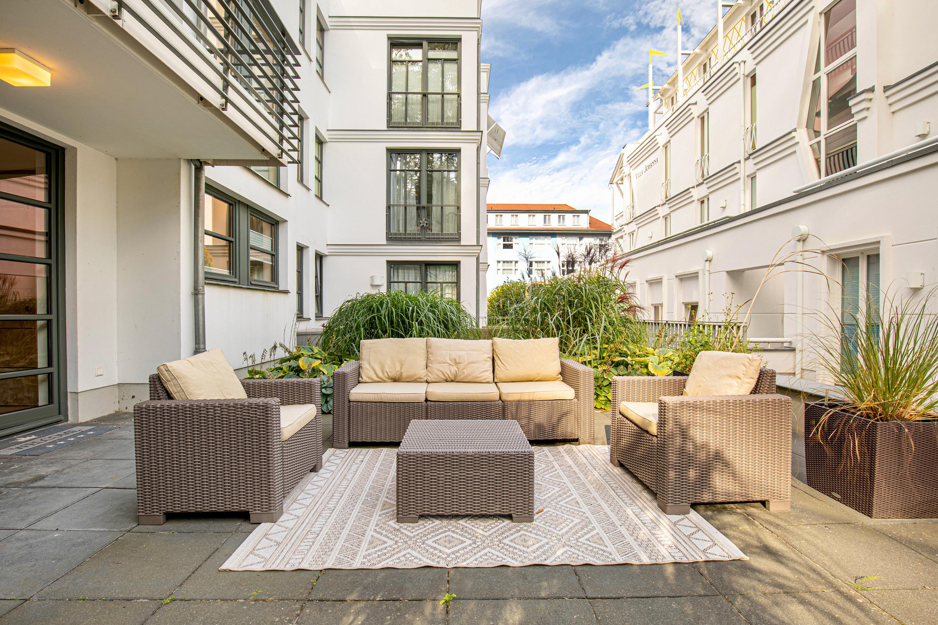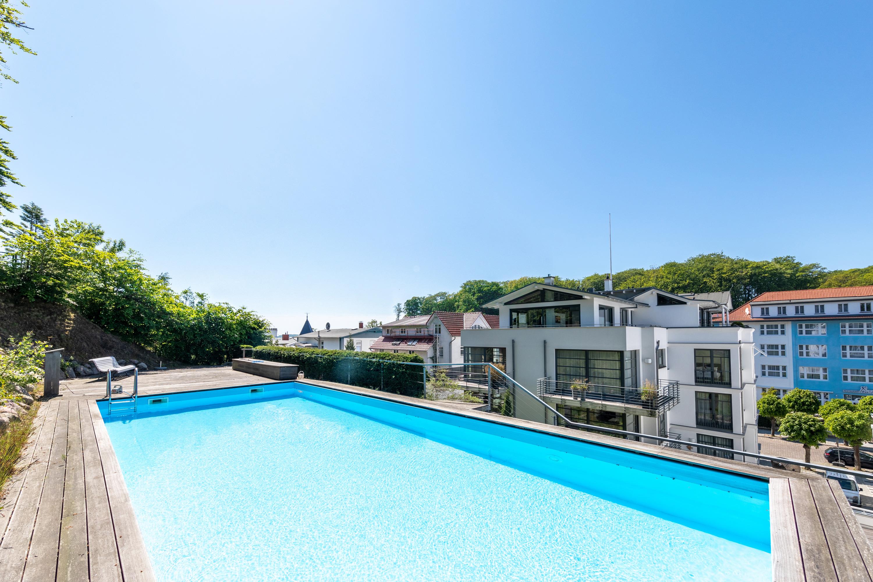 Exklusive 110m² Ferienwohnung in Sellin mit Balkon, Terrasse, Pool und Kamin für entspannte Urlaubstage.
