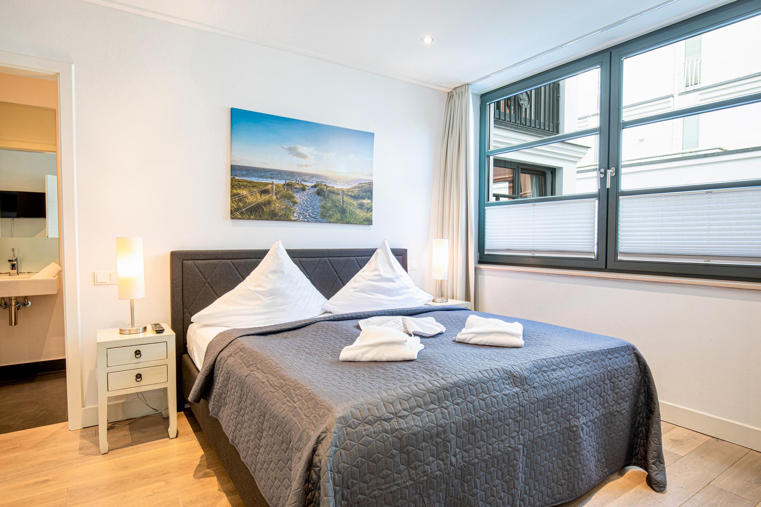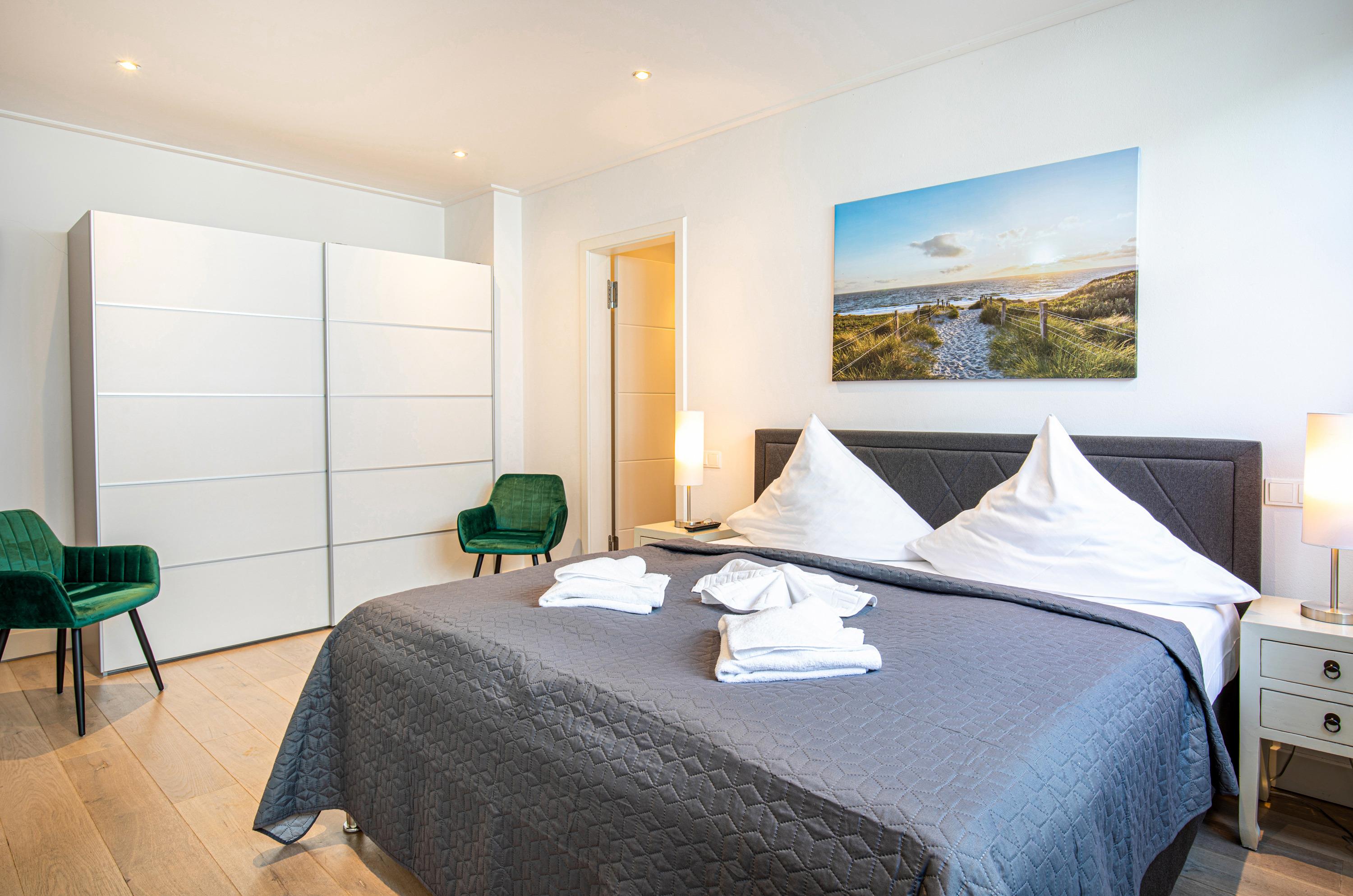 Die beiden Schlafzimmer überzeugen mit ihren luxuriösen Doppelbetten und strahlen eine elegante Behaglichkeit aus. Beide Schlafzimmer verfügen außerdem jeweils über ein Bad en Suite.