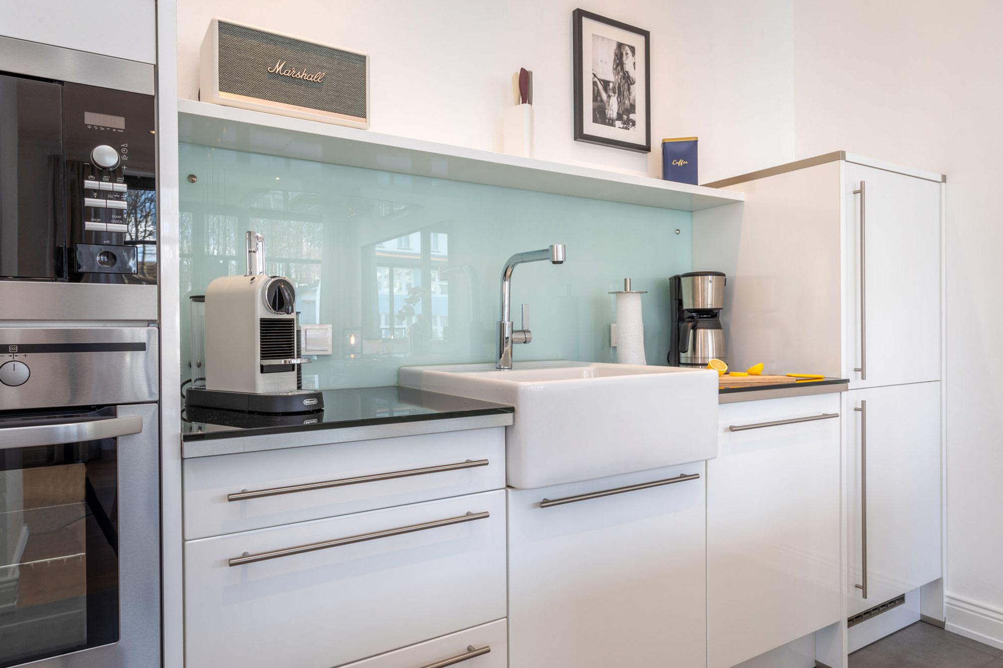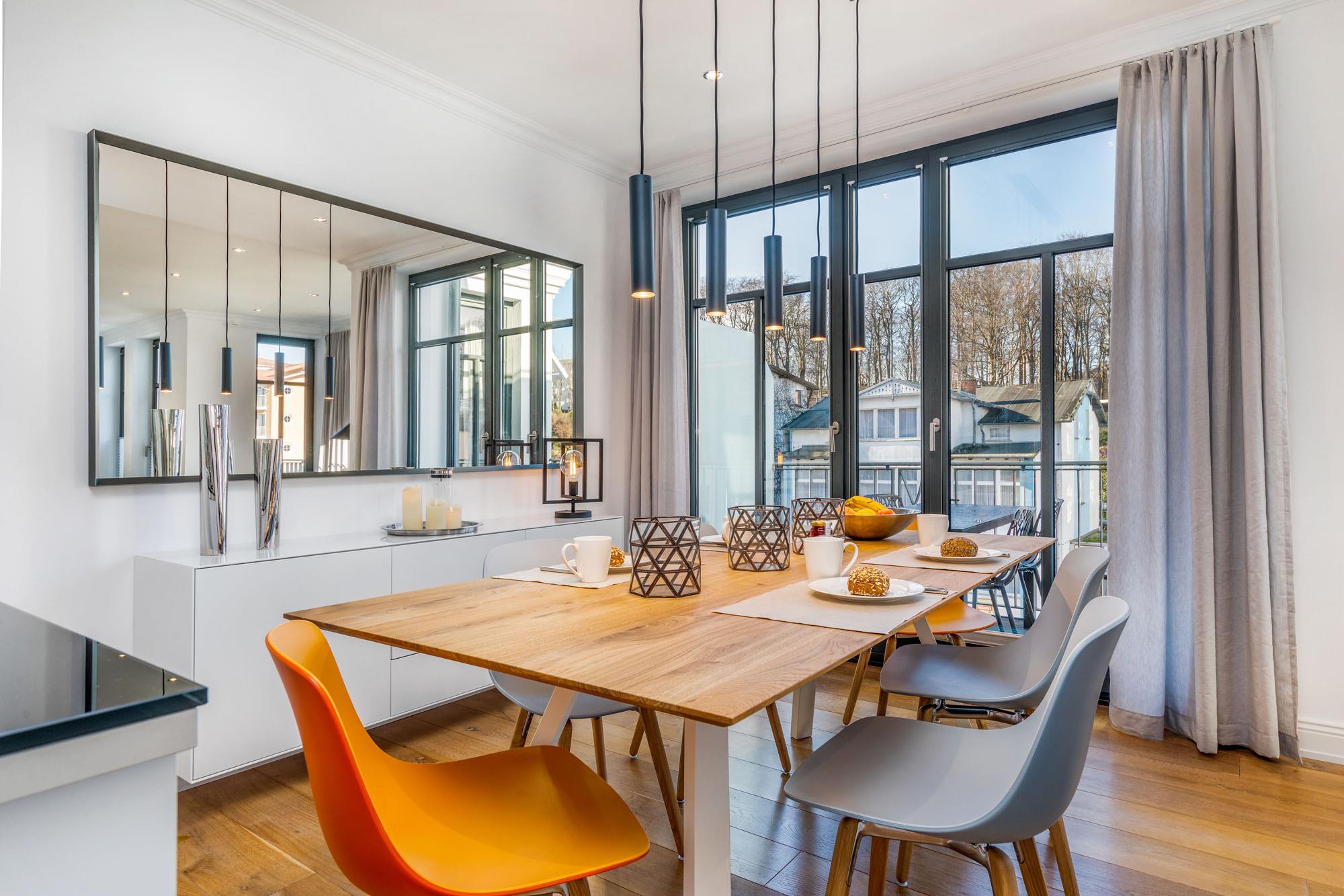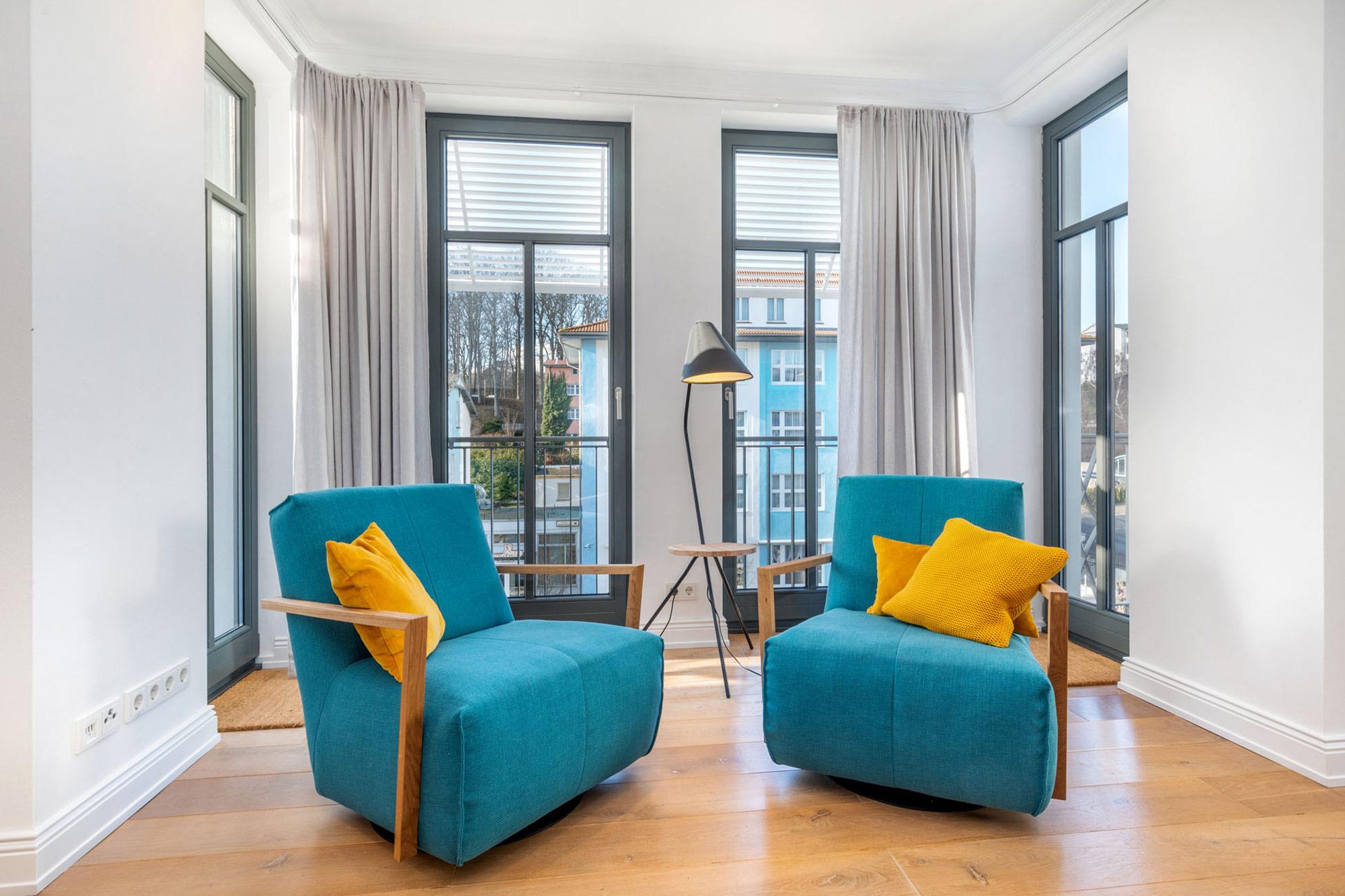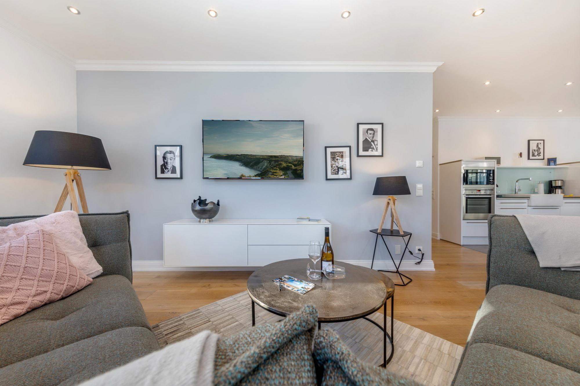 Das Wohnzimmer besticht durch einen Hauch von Skandinavien und ist mit jeweils zwei 2,5-Sitzer-Sofas ausgestattet und lädt zum Entspannen vor dem 55 Zoll LED Fernseher (inkl. Netflix) ein. Das besondere Highlight dieser Ferienwohnung sind die schwenkbaren und drehbaren Loungesessel mit Blick auf den flackernden Kamin und dem atemberaubenden seitlichen Meerblick auf die Ostsee.