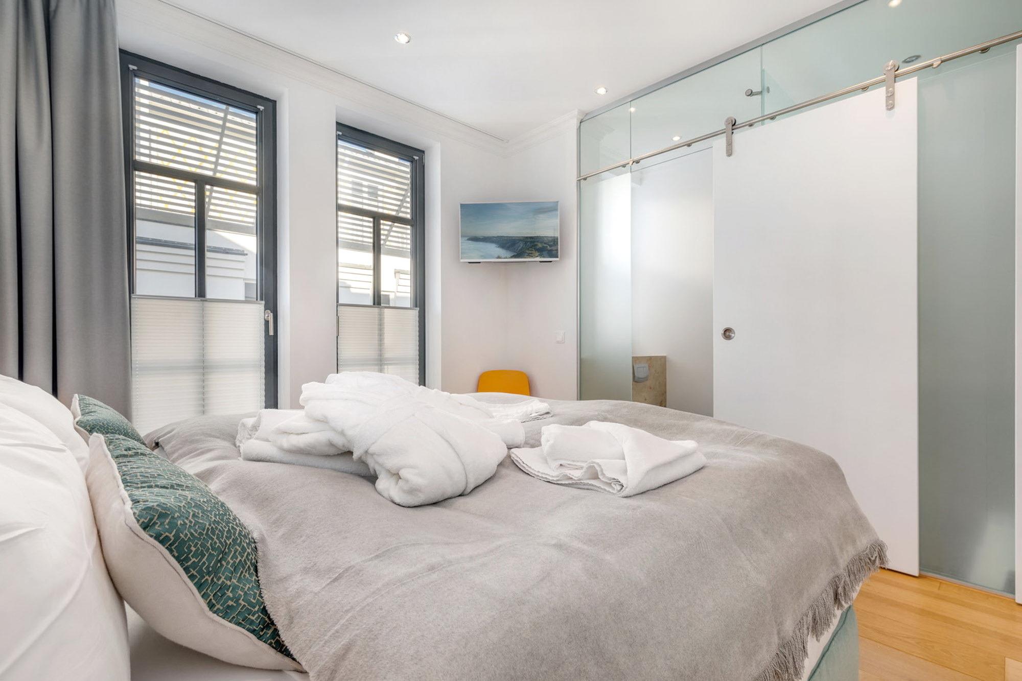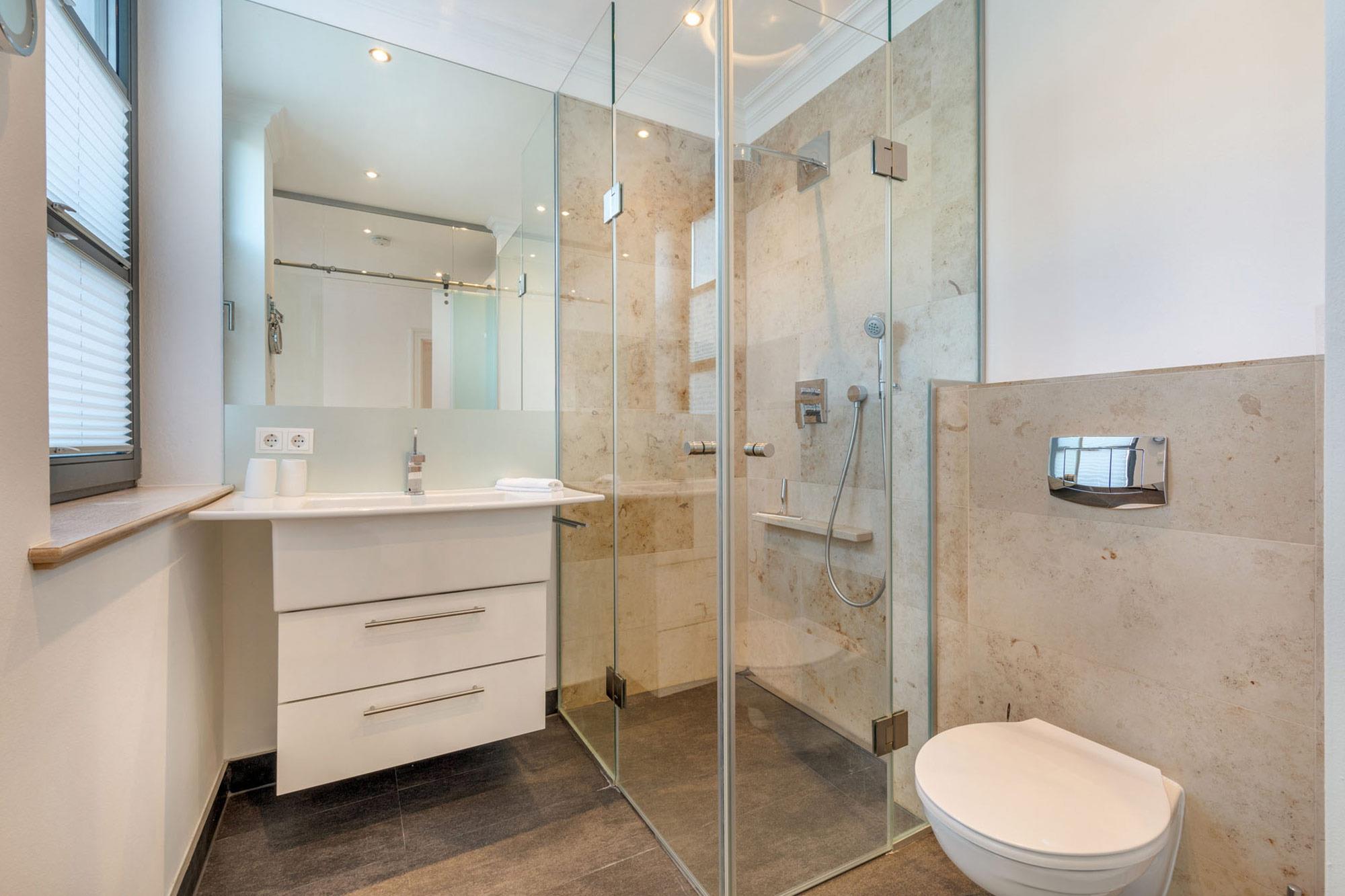 Die beiden Schlafzimmer überzeugen mit ihren luxuriösen Boxspring-Doppelbetten, Kleiderschränken und den 32 Zoll LED Fernsehern (inkl. Netflix) und strahlen eine elegante Behaglichkeit aus. Vom ersten Schlafzimmer (Richtung Osten) genießen Sie einen herrlichen Blick auf den solar beheizten Aussenpool und dem seitlichen Blick auf die Wilhelmstraße. Dem Schlafzimmer angeschlossen befinden sich jeweils ein Ensuite-Bad, welches mit hochwertiger Keramik von Villeroy [&] Boch und Amaturen von Grohe Axor ausgestattet ist. Dies gibt den Ensuite-Bädern eine definierte Ästhetik und lässt keine Wünsche offen.