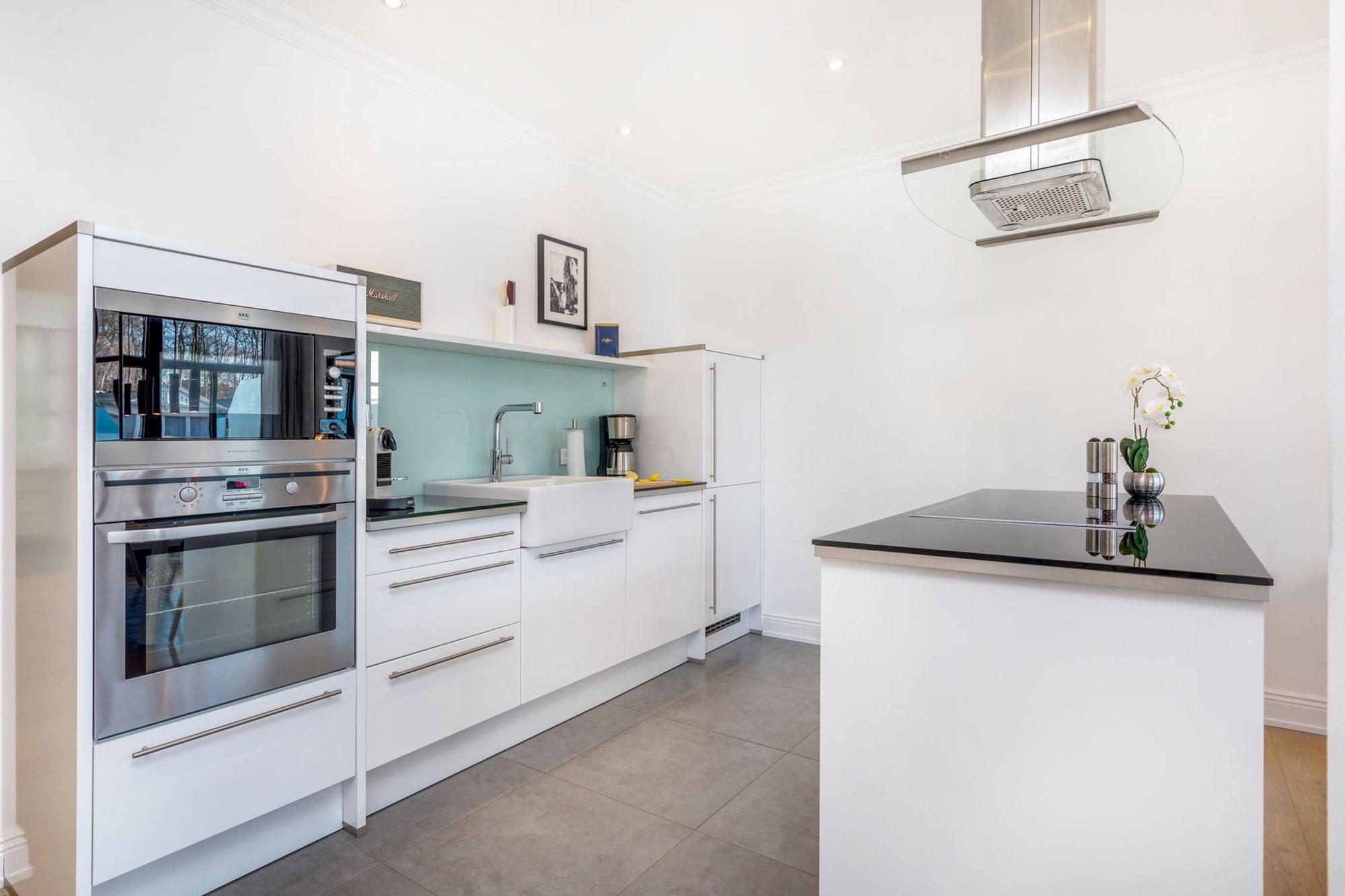 In Ihrem Urlaubsdomizil erwartet Sie ein stilvolles Ambiente durch hochwertige Möbel in exklusivem Design. Zum Wohlfühl-Erlebnis sorgt die flächendeckende Fußbodenheizung und eine wohnungseigene Sauna, die zum Verweilen an kalten Wintertagen einlädt. Die moderne Küchenzeile und -insel im kombinierten Wohn- und Esszimmer wurde mit hochwertigen Markengeräten und allem notwendigen Geschirr ausgestattet und lädt zum gemeinsamen Kochen ein. Hier bleiben keine Wünsche offen.