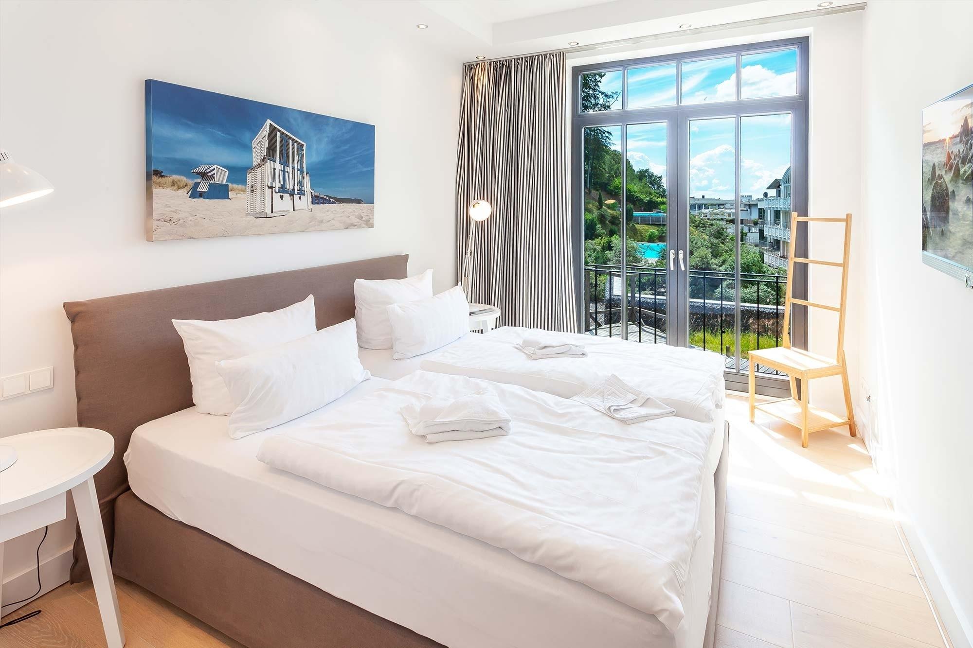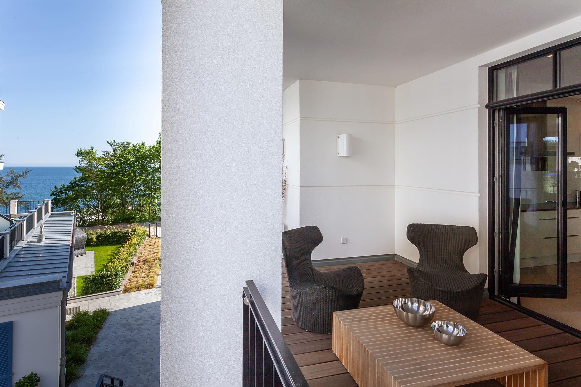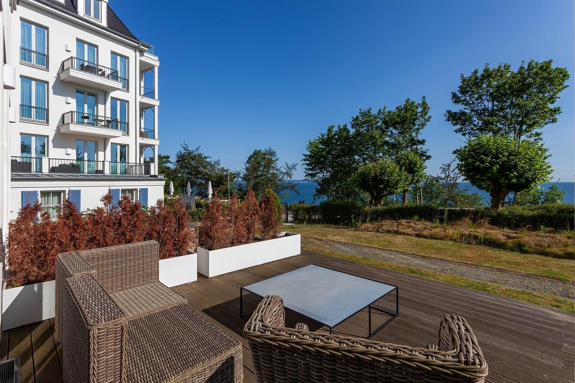 Rügen-Urlaub deluxe auf 178 Quadratmetern! Das Appartement Nr. 017 begrüßt Sie im Erdgeschoss der Villa Philine mit zwei freundlichen Schlafzimmern, die Ihnen durch ihre bodentiefen Fenster einen sehr schönen Blick auf die Ostsee bis hinüber zu den Kreidefelsen Jasmunds ermöglichen. Zwei stilvolle Ensuite-Badezimmer mit ebenerdiger Dusche bzw. Badewanne, ein Gäste-WC und die private Finnische Sauna nebst kleiner Ruhezone komplettieren diese Etage. Sogar an einen separaten Zugang zum Pool im Außenbereich wurde gedacht, so dass Sie auch ganz kurzentschlossen ein erfrischendes Bad (saisonal) genießen können.