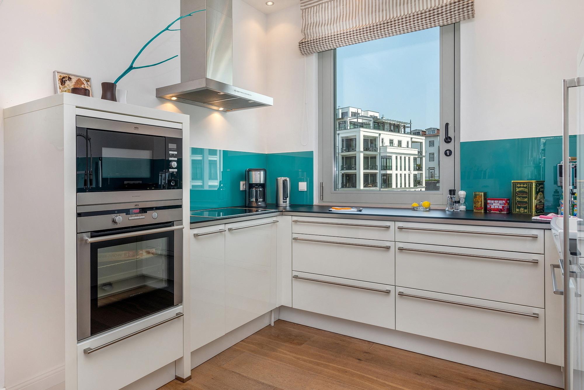 In der unteren Etage eröffnet sich Ihnen zunächst der große Koch- und Essbereich. In einer harmonischen Mischung aus Kolonialzeit und Sailing-Style ist alles sehr großzügig angelegt, funktionell durchdacht und mit hochwertigen Markenmöbeln eingerichtet. Perfekt in einer separaten Nische des hellen Raumes integriert, befindet sich die Designerküche mit exklusiven technischen Geräten sowie Armaturen der Firma Dornbracht.