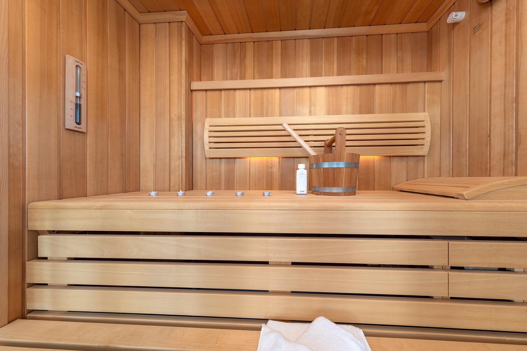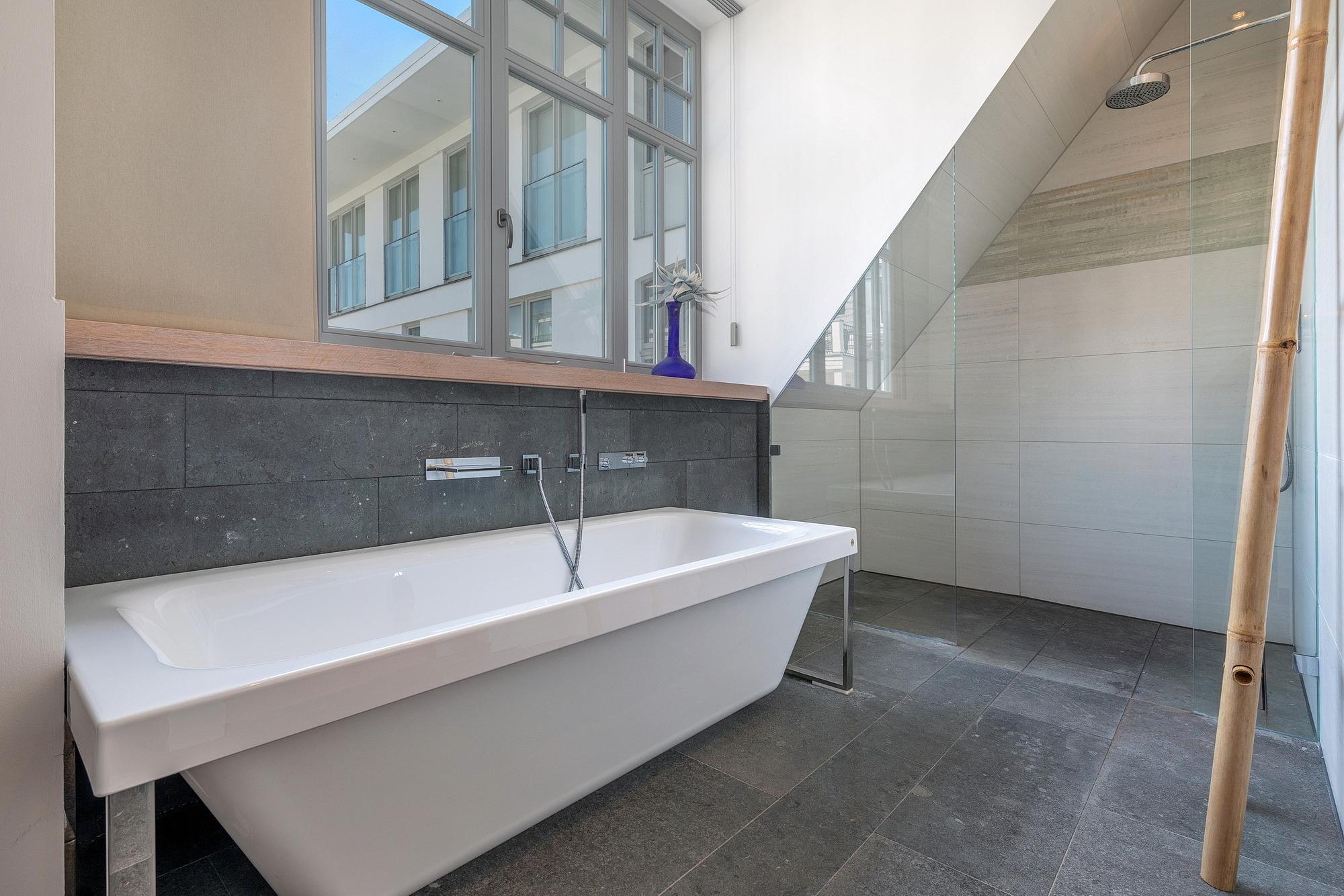 Zwei Schlafzimmer mit komfortablen Doppelbetten strahlen elegante Behaglichkeit aus. Die bodentiefen Fenster lassen viel Tageslicht ein, können aber selbstverständlich auch verdunkelt werden. Über eine Flügeltür gelangen Sie auf die nordöstlich ausgerichteten Balkone. Dem Schlafzimmer angeschlossen ist jeweils ein Ensuite-Bad, dessen dunkelgrauen Ceralith-Bodenplatten, die fugenlos wie aus einem Stück gegossen erscheinen, schon im ersten Moment von edlem Badevergnügen künden. Villeroy [&] Boch- Waschbecken mit Dornbracht Armaturen, das Wannenbad bzw. die großzügige, ebenerdige Dusche und die wohnungseigene Finnische Sauna sind Annehmlichkeiten, die man gern nutzt. Ein separates Gäste-WC im Eingangsbereich ist ebenfalls vorhanden.