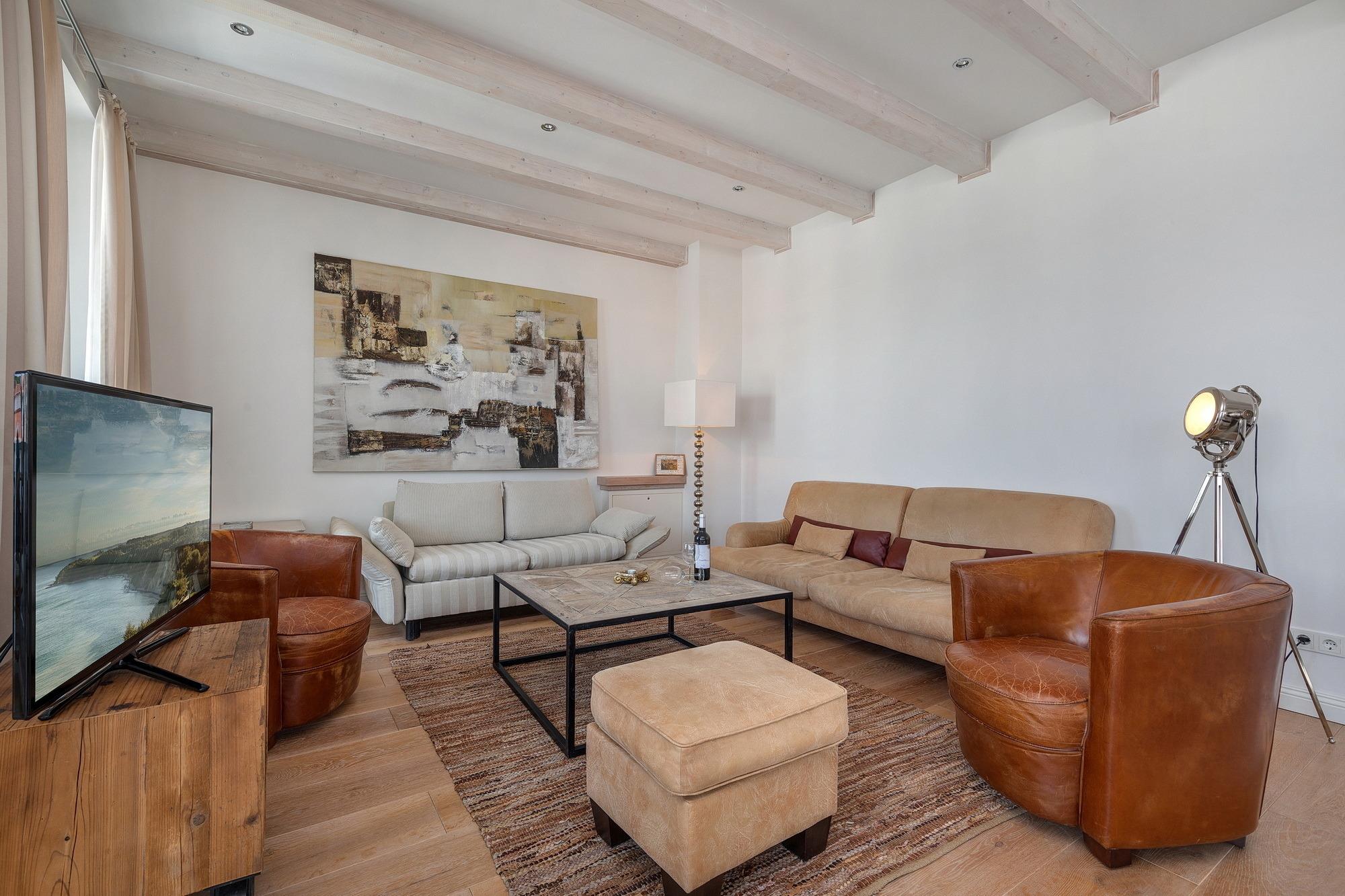 Eine geschwungene Treppe führt hinauf in die zweite Ebene der Wohnung. Hier verspricht Ihnen der Wohnbereich mit Kamin, Terrasse, einem 40-Zoll LED-Fernseher, HiFi-Anlage mit DVD/CD-Player, iPod-Docking-Station sowie kostenfreiem W-LAN schöne Stunden der Erholung. Und falls Sie sich mal nicht für einen Sender entscheiden können, dann stehen in den unteren Räumen natürlich ebenfalls TV-Geräte für Sie bereit.