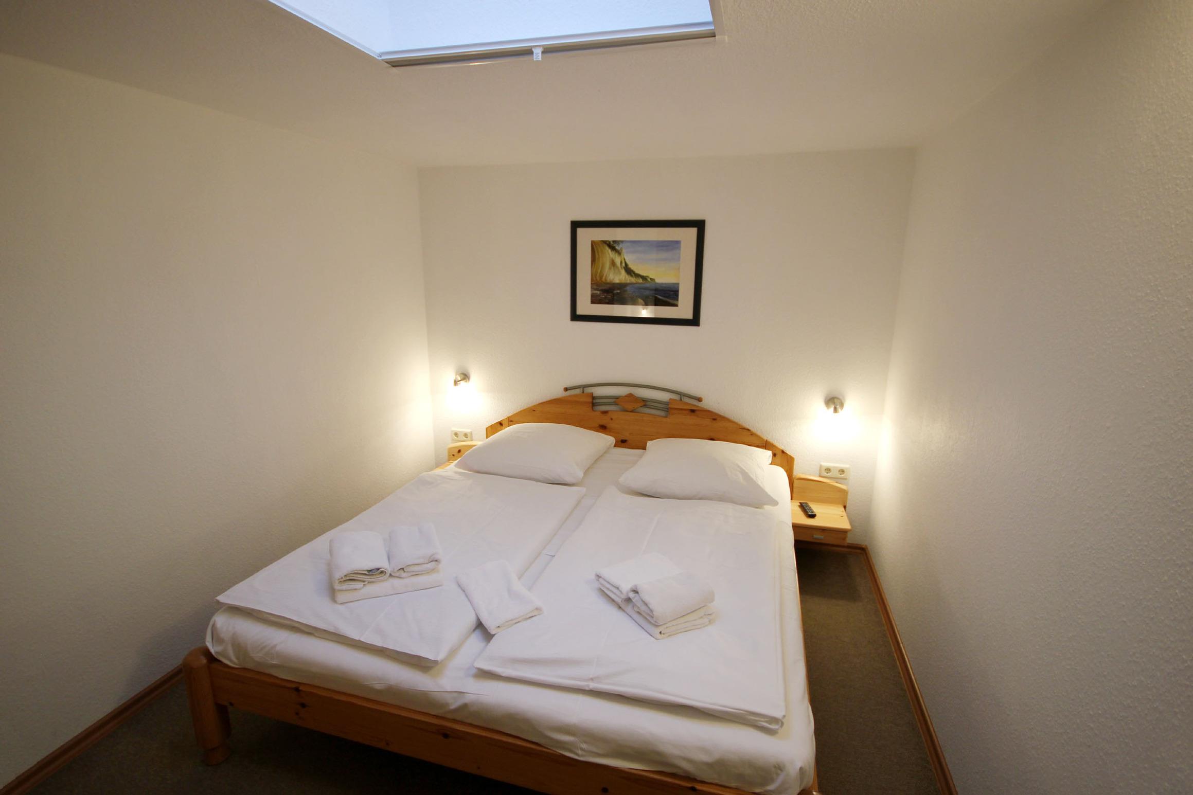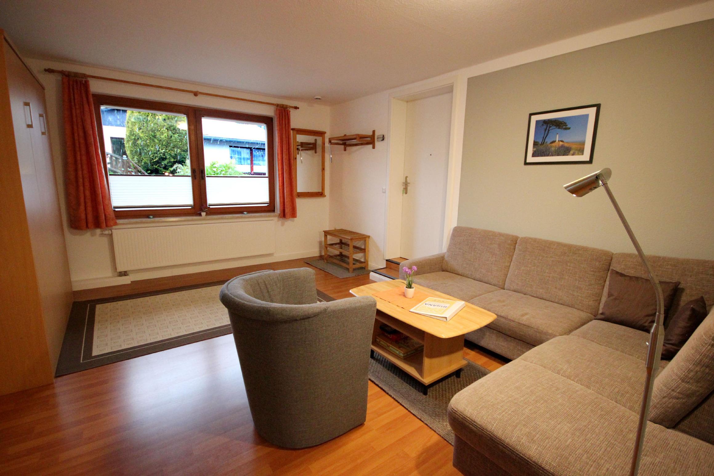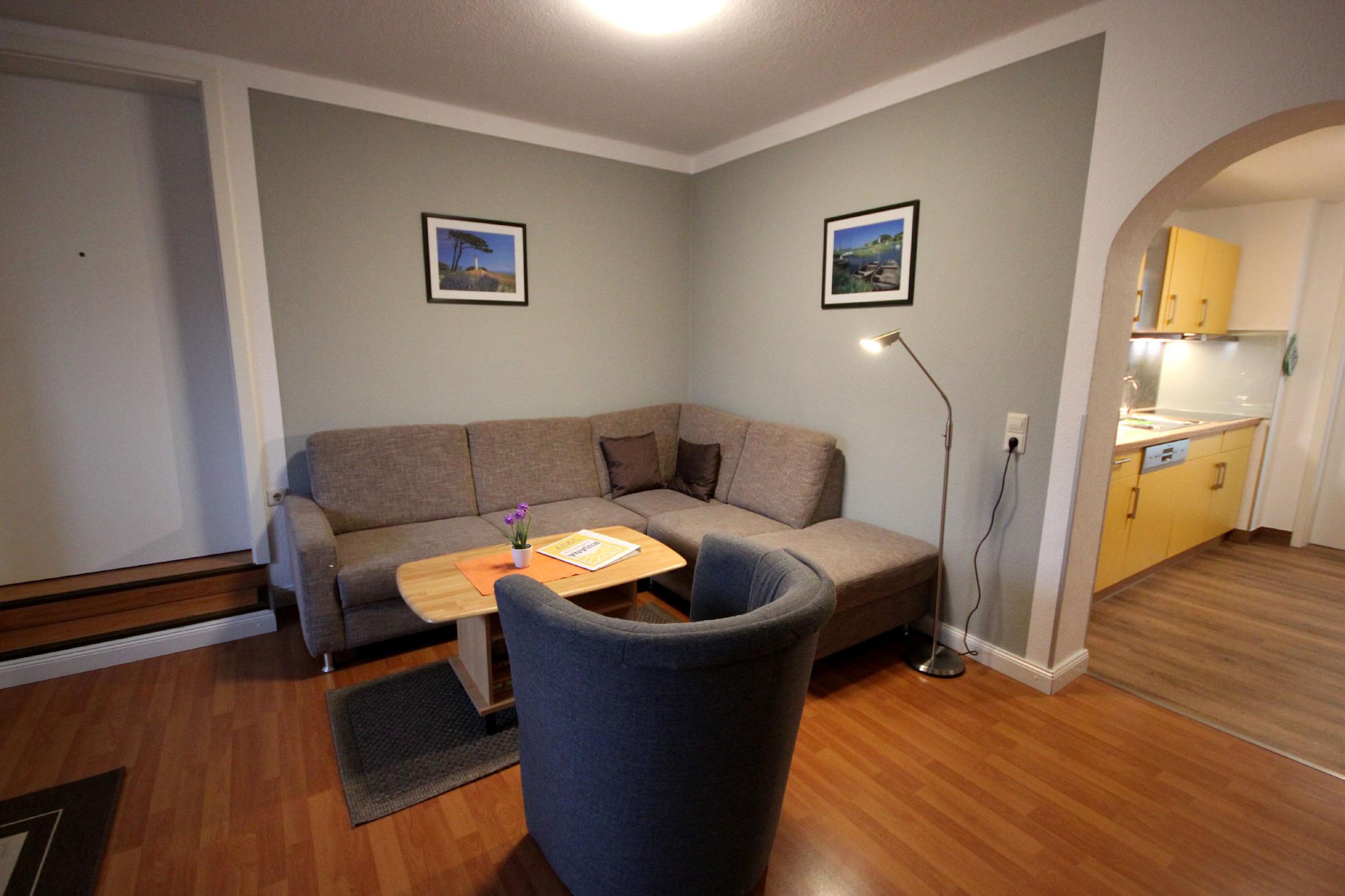 Ihre 2-Raum Nichtraucherwohnung 64RB2 befindet sich im Erdgeschoss des Hauses. Sie besitzt eine Größe von ca. 45 qm und ist für max. 4 Personen belegbar sowie komplett eingerichtet. Das Appartement teilt sich auf in einen gemütlichen Wohnbereich mit bequemer Sitzecke, separate Küche, ein Schlafzimmer und ein Tageslichtbad. Neben dem schönen Wohnraum mit Flachbildfernseher, WLAN und Radio mit CD-Player ist der Schlafraum mit einem weiteren Flachbild-TV, einem Doppelbett, Kleiderschrank und Verdunklungsmöglichkeit ausgestattet. Das komfortable Schrankbett im Wohnbereich bietet Schlafmöglichkeit für die 3. und 4. Person. Die Küche mit Essplatz für 4 Personen ist komplett mit 4-Platten-Herd, Dunstabzugshaube, Kühlschrank, Geschirrspüler, Kaffeemaschine, Wasserkocher, Toaster und weiteren diversen Küchenhelfern eingerichtet. Im Badezimmer erwartet Sie eine Dusche, WC, fest installierter Fön und ein Waschbecken. Als weiteres Highlight steht Ihnen im gemeinschaftlichen Gartenbereich eine extra Grillecke zum Verweilen sowie ein Spielturm mit Rutsche und Schaukeln zur Verfügung. Ein wohnungseigener PKW – Stellplatz sowie Unterstellmöglichkeiten für Ihre Fahrräder sind direkt am Haus vorhanden. Eine hauseigene Waschmaschine steht Ihnen gegen Gebühr zur Verfügung.