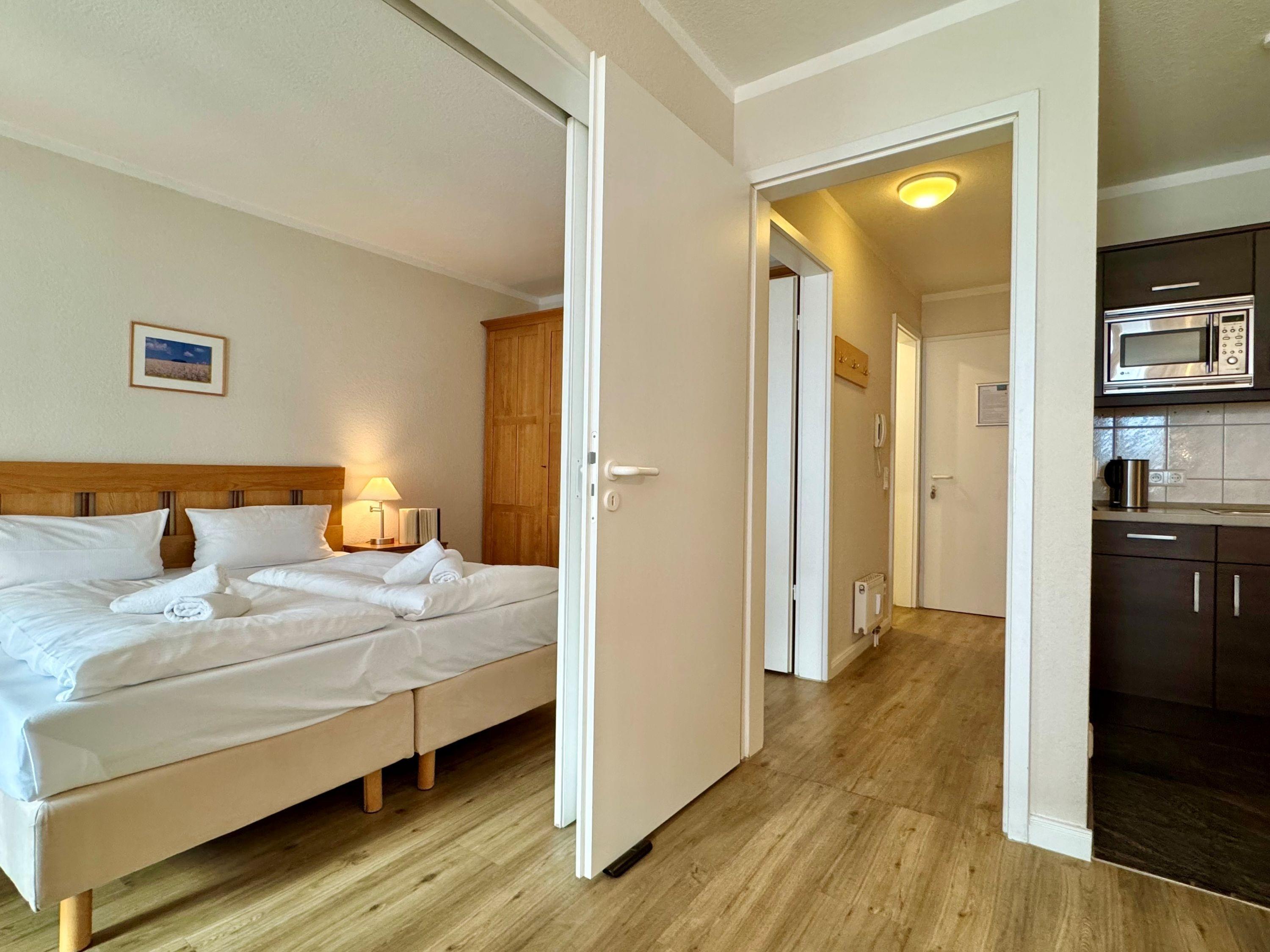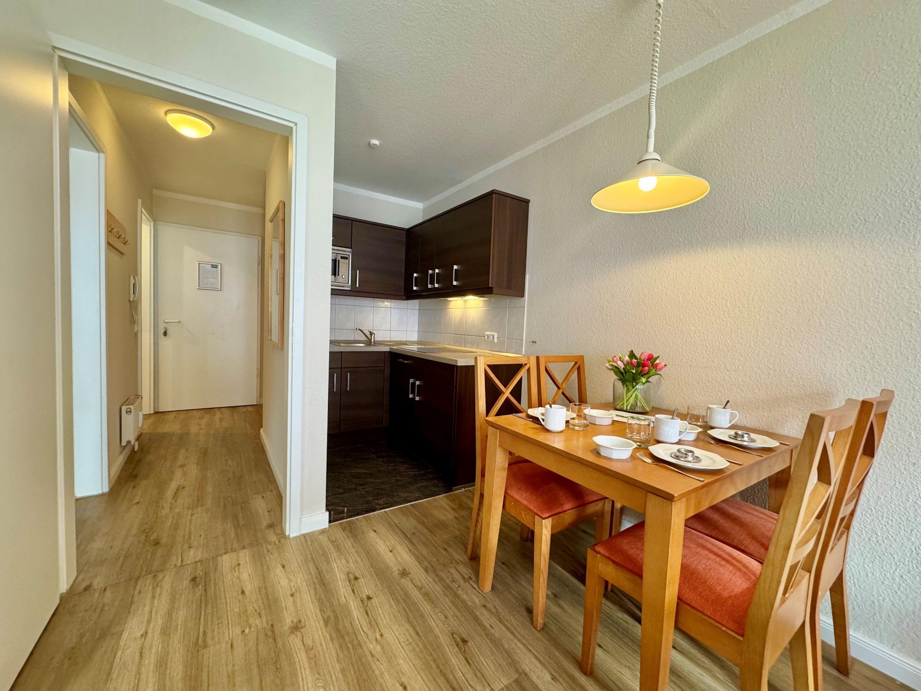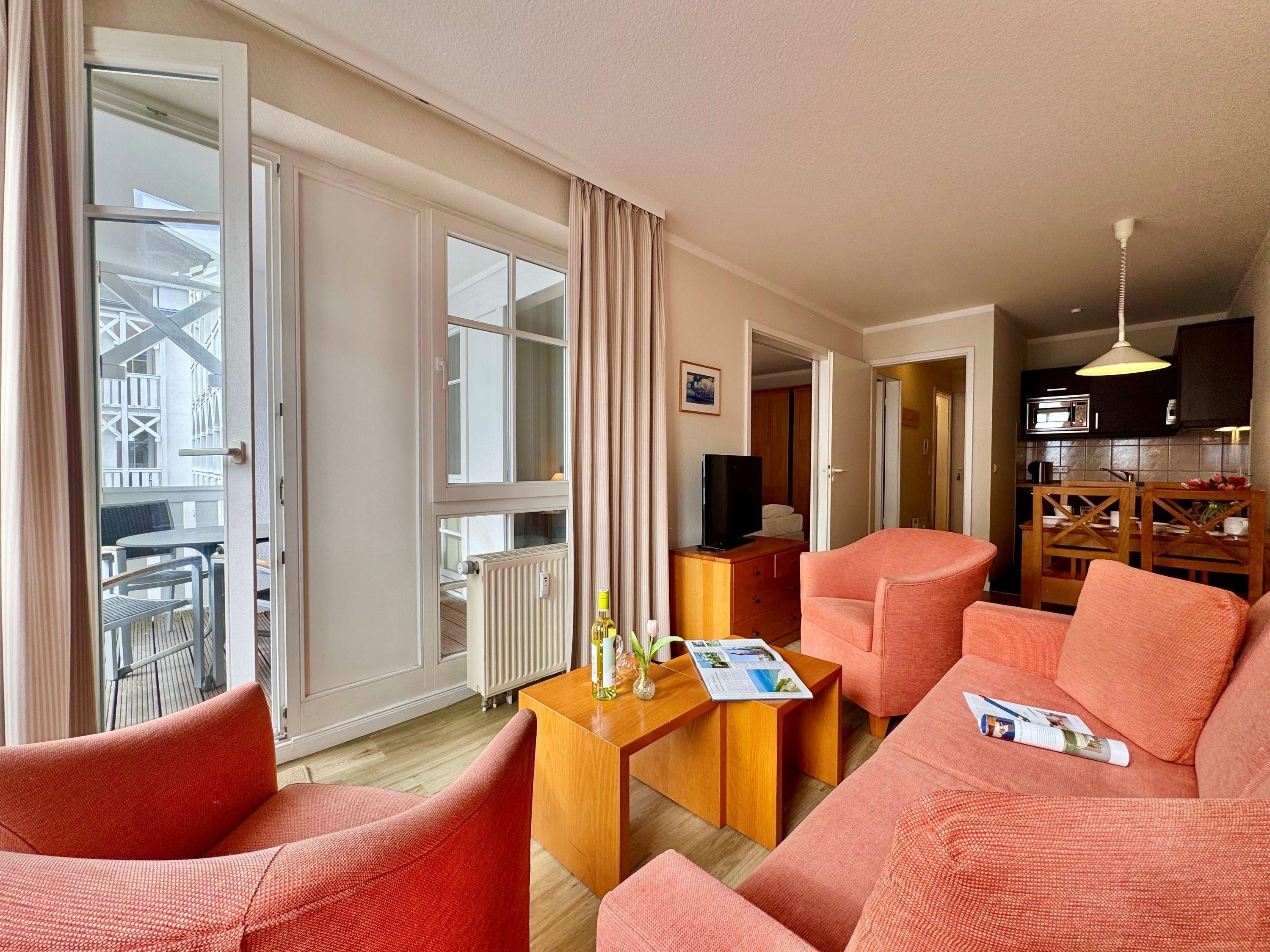 Die Ferienunterkunft Fewo 305 im Seepark Sellin bietet auf 44 m² Platz für bis zu 3 Personen. Die Wohnung befindet sich im Haus Having, liegt in der 1. Etage und ist bequem über einen Fahrstuhl erreichbar. Sie verfügt über ein Schlafzimmer und ein Badezimmer mit Badewanne. Die offene Wohnküche ist mit einer TV-Flachbild, einer Kaffeemaschine (Filter), einer Mikrowelle sowie mit allen nötigen Küchenutensilien ausgestattet. Die Bettwäsche ist im Preis inklusive und Haustiere sind herzlich willkommen.