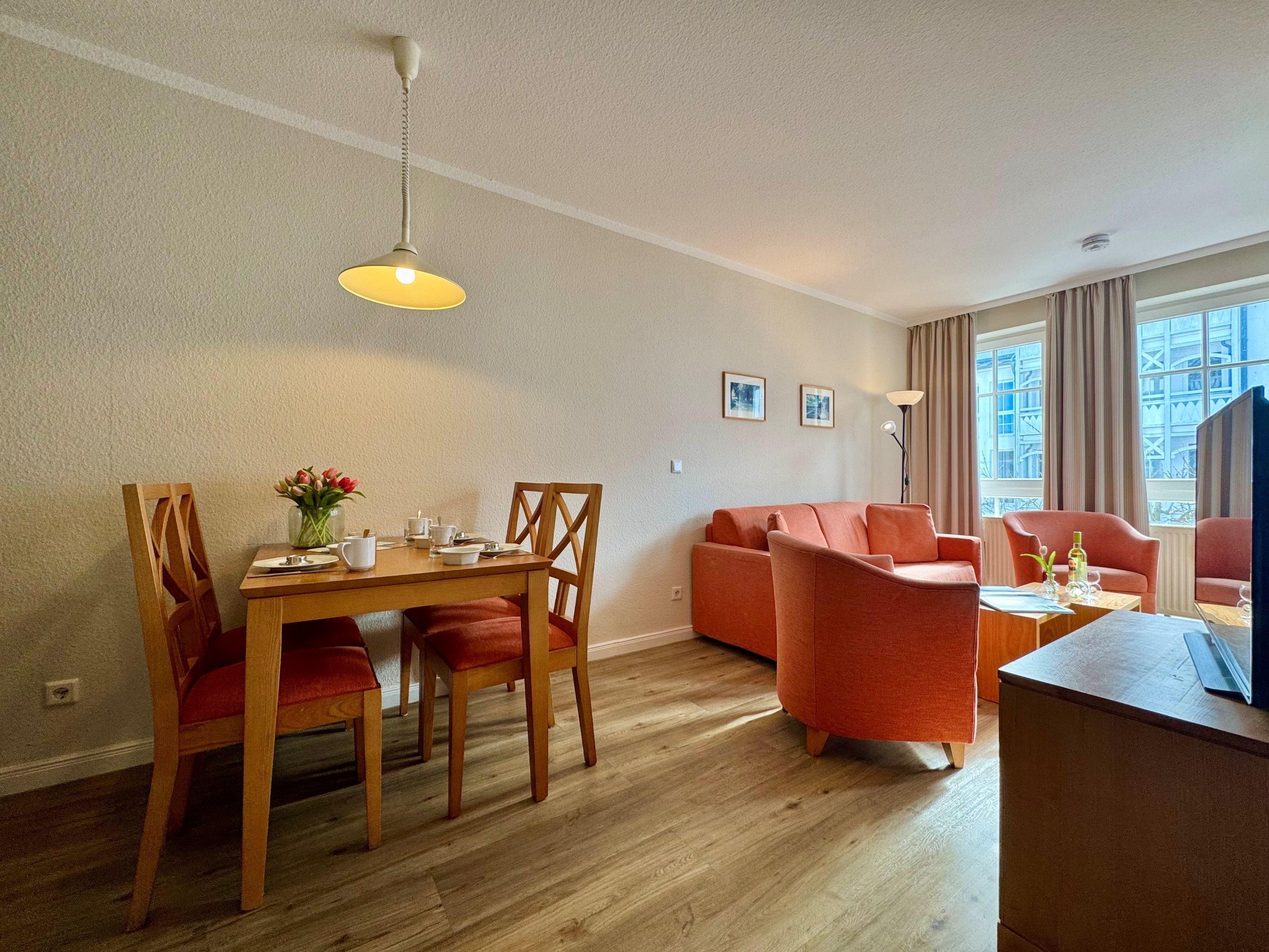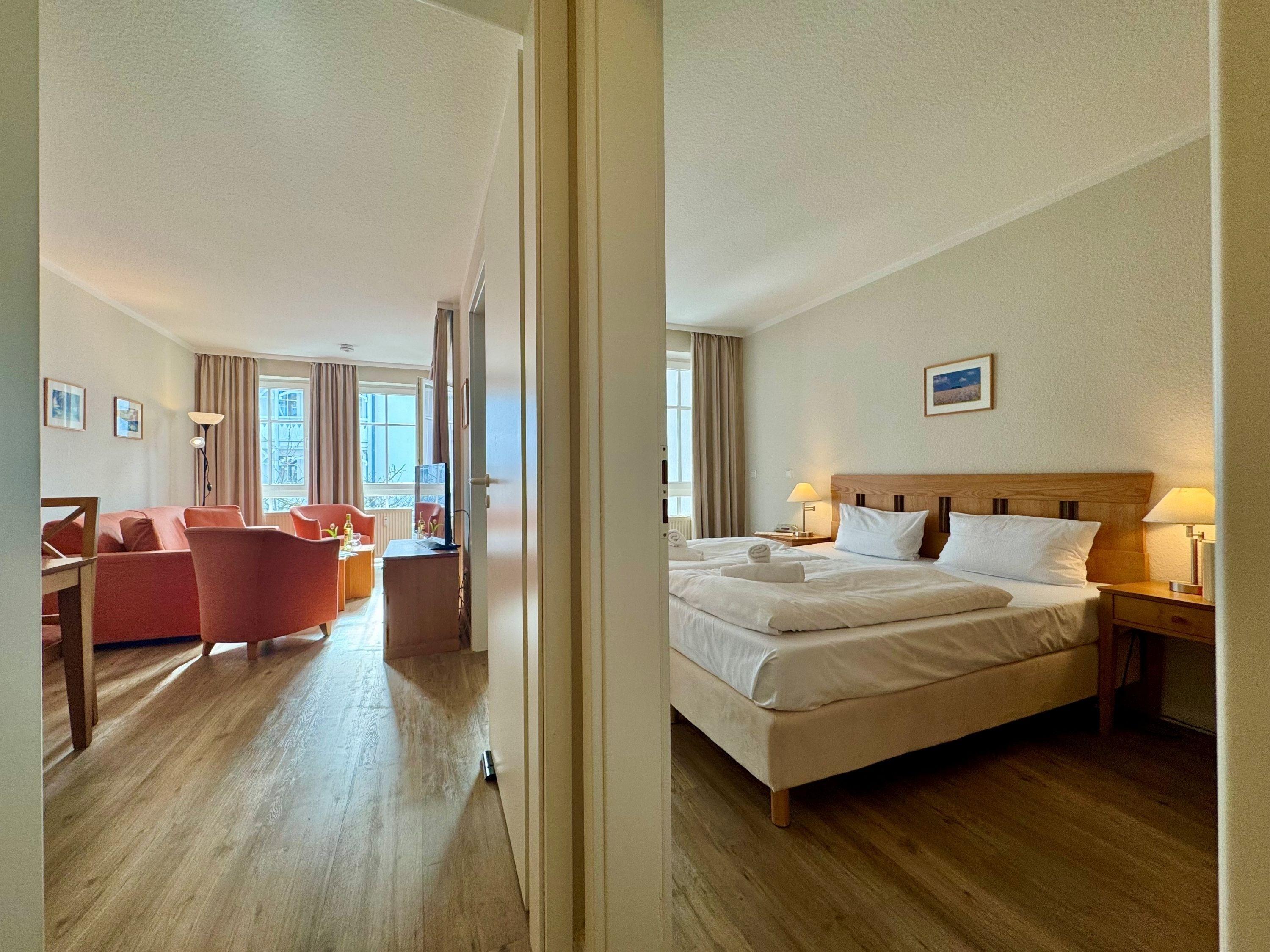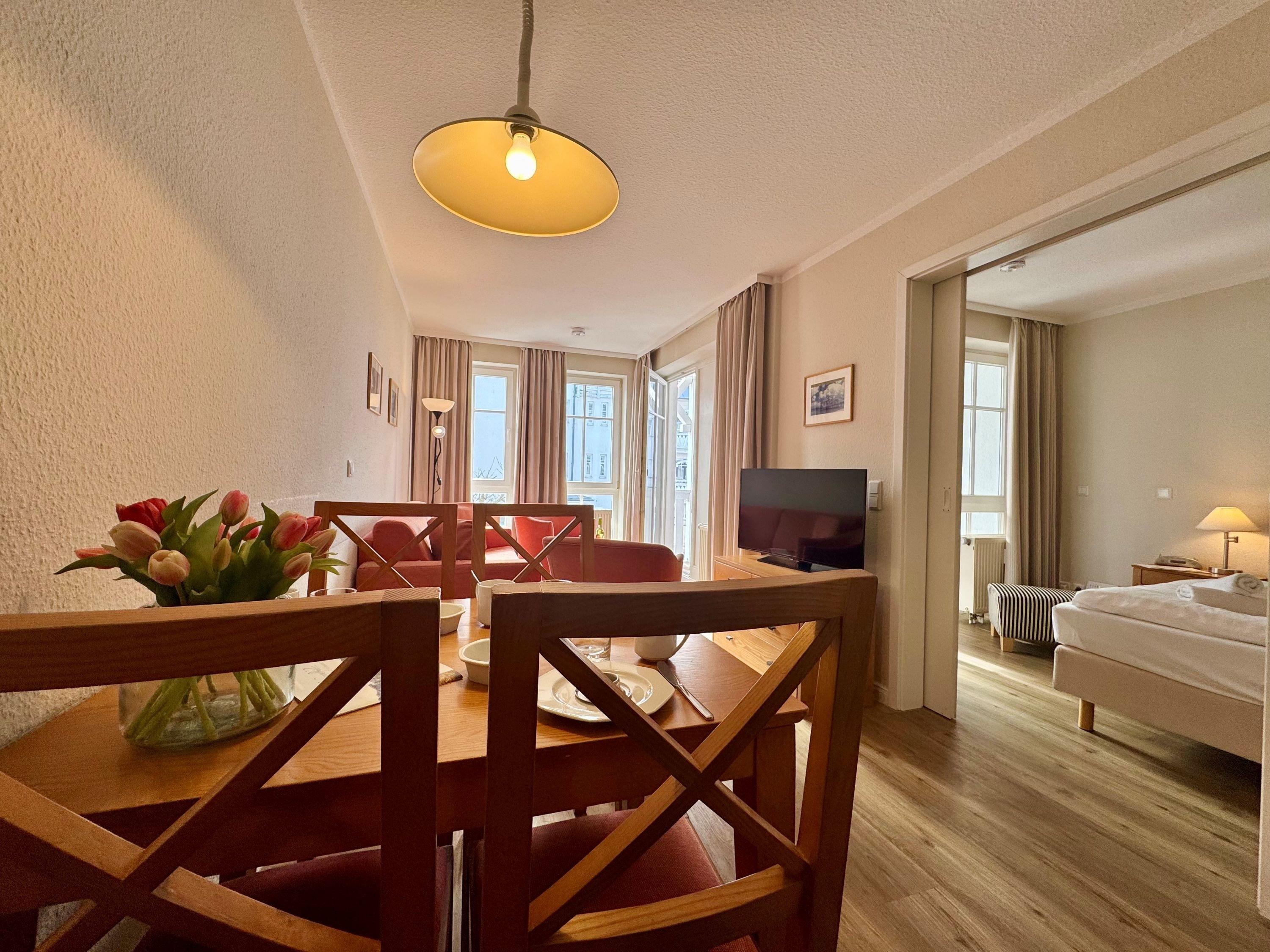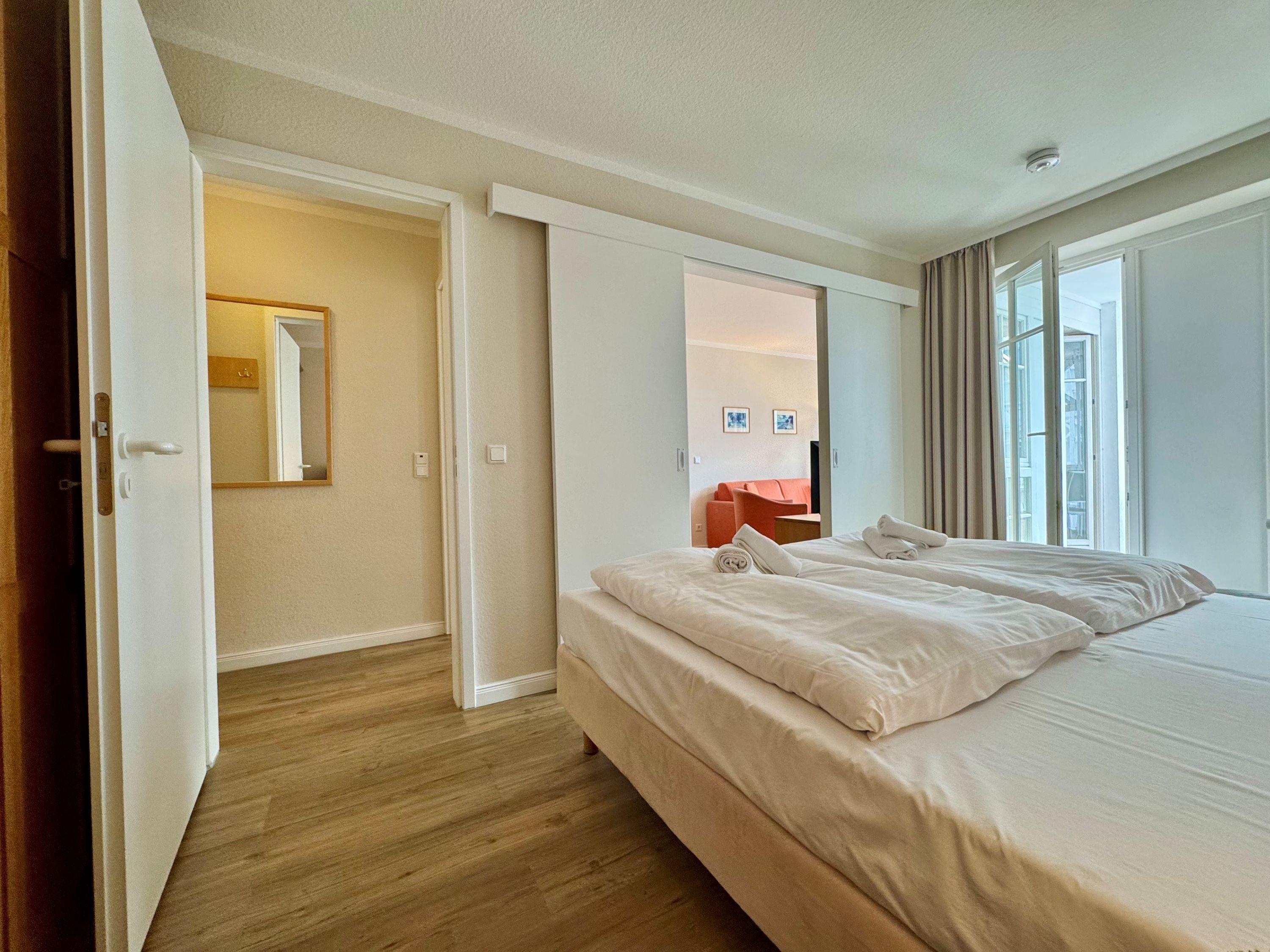 Die Ferienunterkunft Fewo 305 im Seepark Sellin bietet auf 44 m² Platz für bis zu 3 Personen. Die Wohnung befindet sich im Haus Having, liegt in der 1. Etage und ist bequem über einen Fahrstuhl erreichbar. Sie verfügt über ein Schlafzimmer und ein Badezimmer mit Badewanne. Die offene Wohnküche ist mit einer TV-Flachbild, einer Kaffeemaschine (Filter), einer Mikrowelle sowie mit allen nötigen Küchenutensilien ausgestattet. Die Bettwäsche ist im Preis inklusive und Haustiere sind herzlich willkommen.