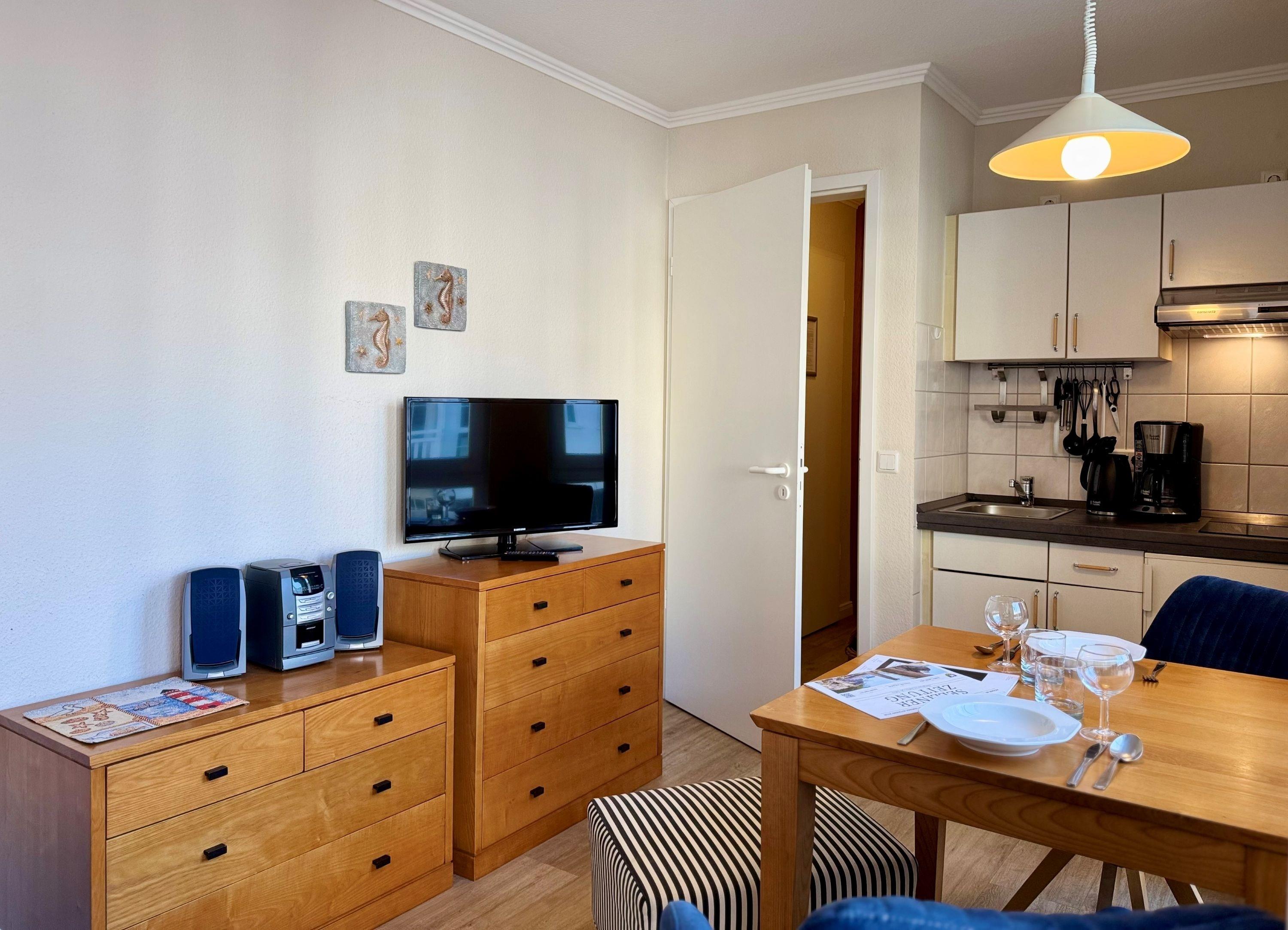 Die Ausstattung der Wohnung umfasst ein Boxspringbett 180 x 200, gemütliche Sitzmöbel, einen TV-Flachbildschirm, eine Kaffeemaschine (Filter), sowie Bettwäsche, die bereits inklusive ist. Auch Haustiere sind hier herzlich willkommen. Der Balkon bietet einen schönen Ausblick und die kleine Küche verfügt über eine Pantry/Mini-Küche.