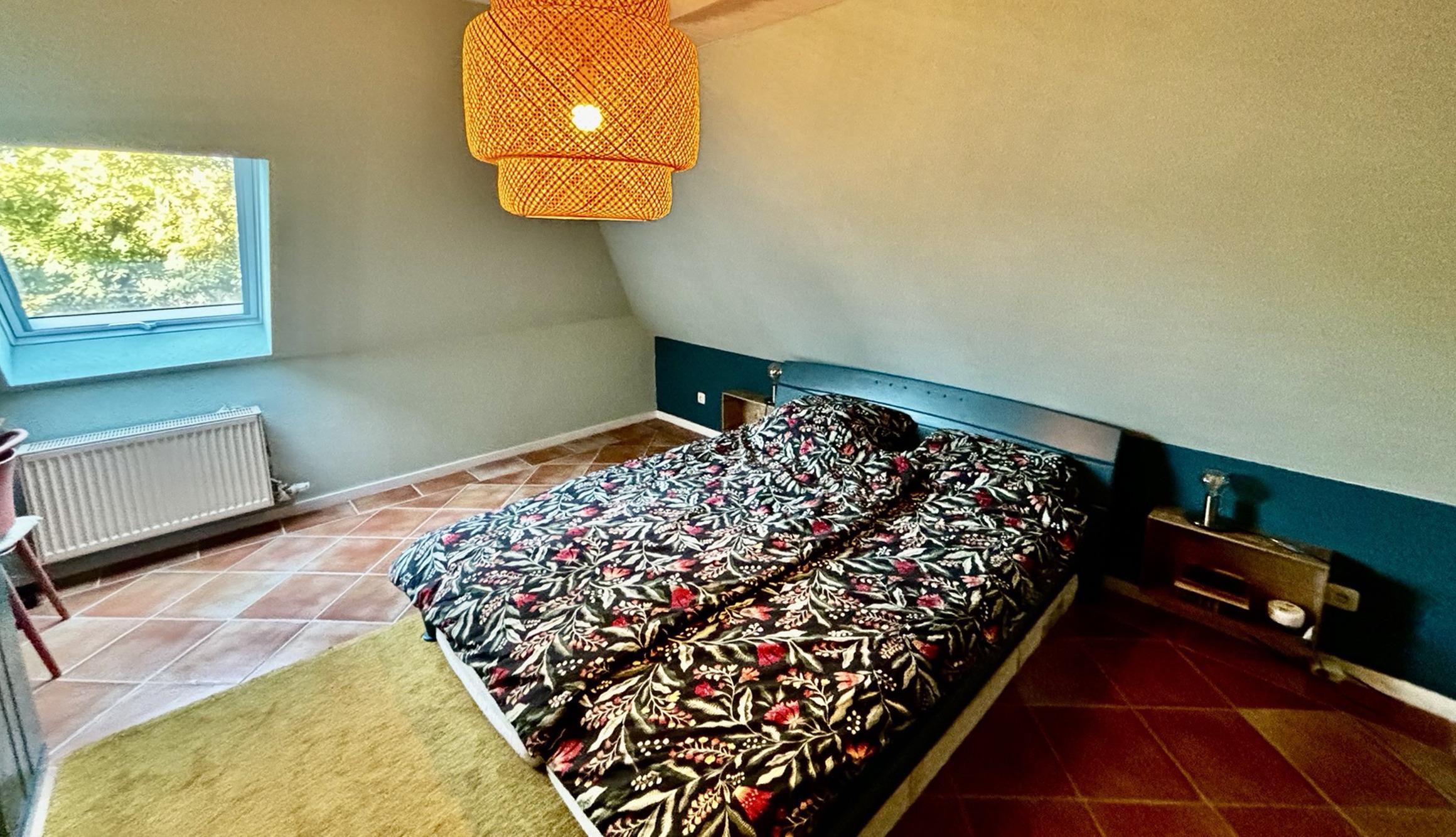 Eine offene Wendeltreppe führt zu dem großen Schlafzimmer. Dieses verfügt über ein Doppelbett mit Nachtischen sowie einen großen Kleiderschrank.