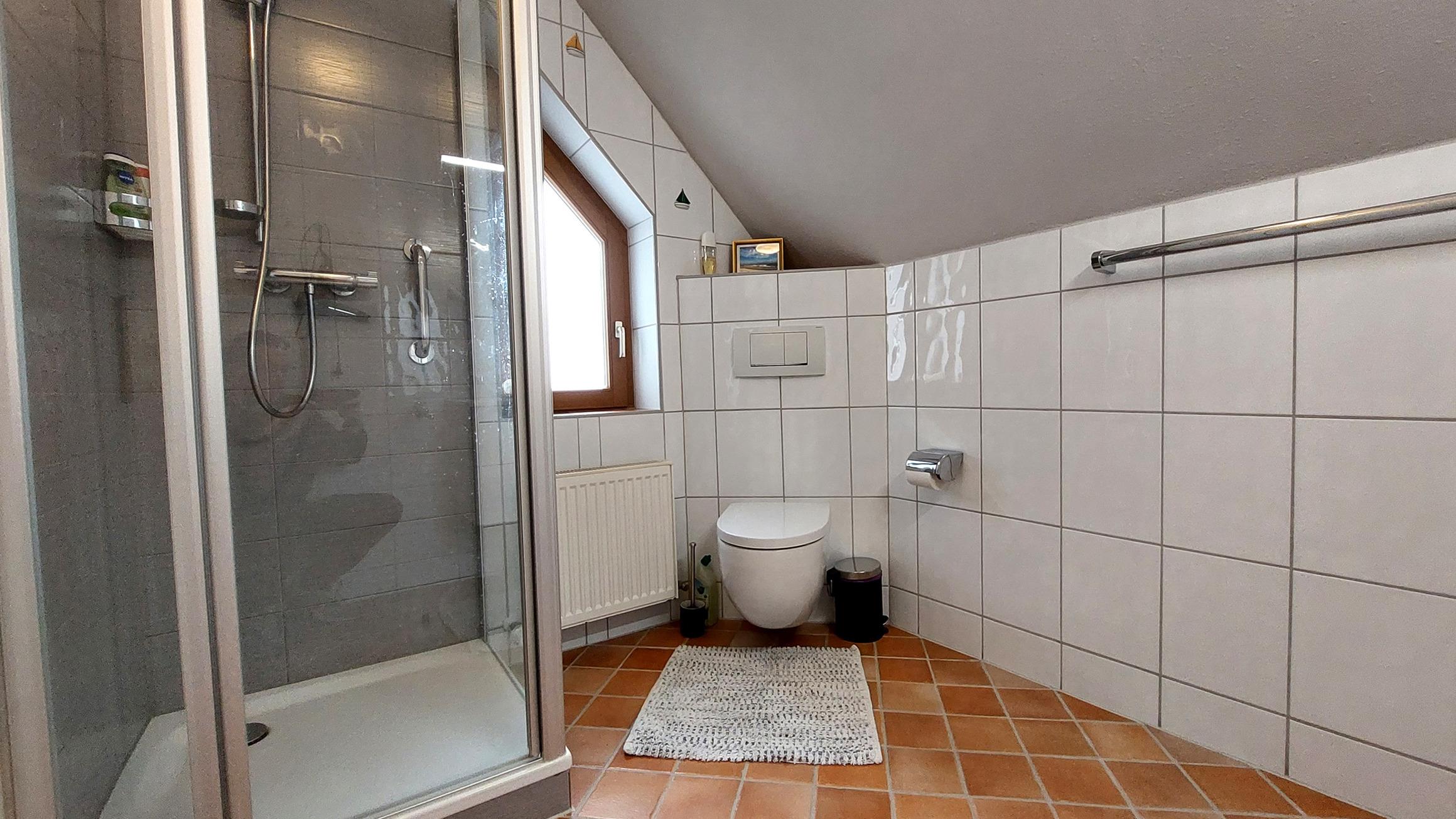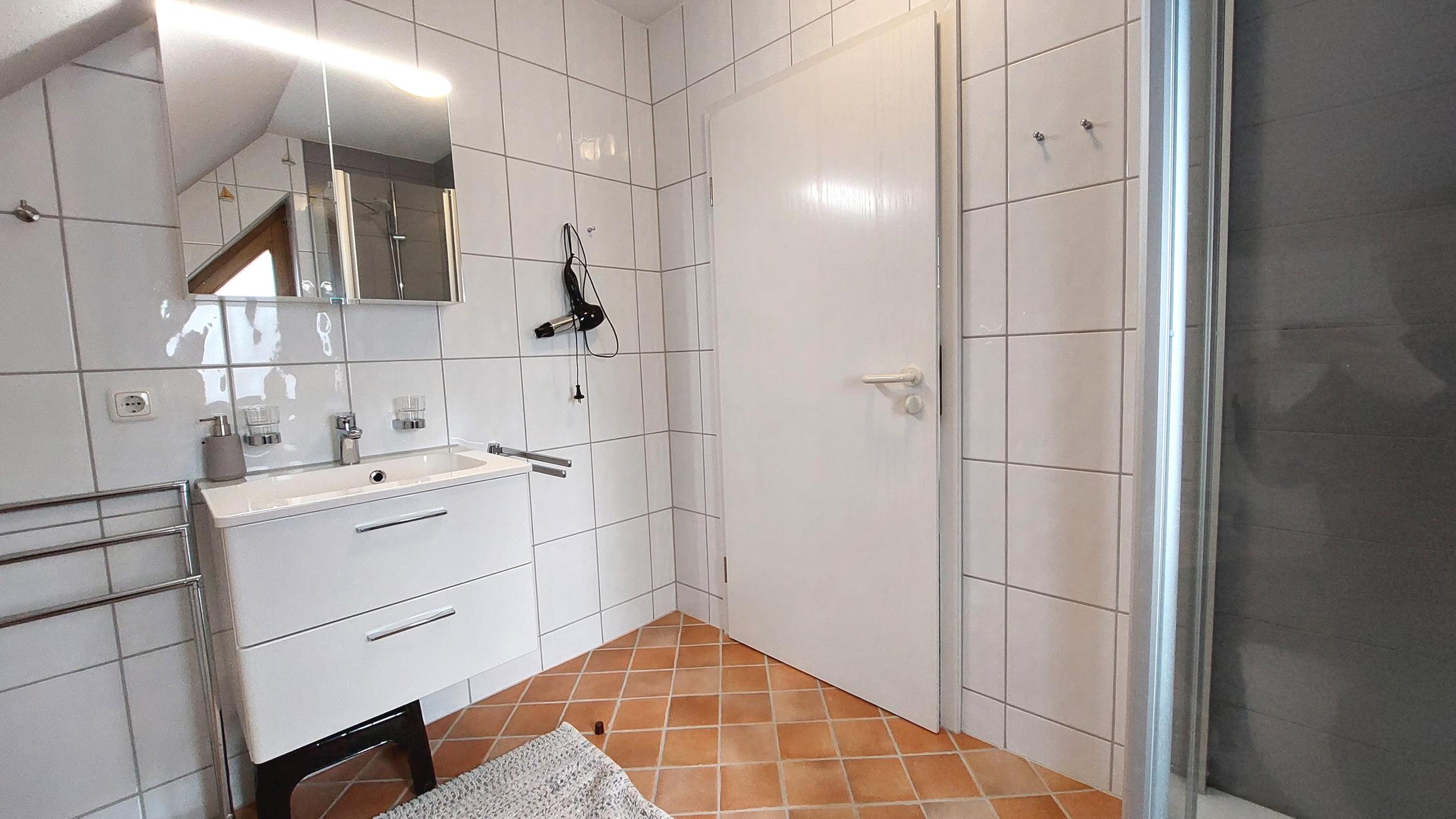 Vom Flurbereich samt Garderobe gelangen Sie ins Tageslichtbad, welches über WC, Dusche, Kosmetikspiegel und Fön verfügt.