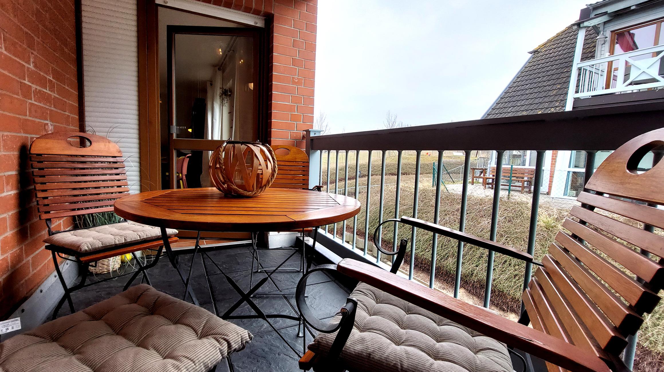 Highlight ist der möblierte und vollüberdachte Balkon mit Blick ins Grüne und zum angrenzenden Spielplatz.