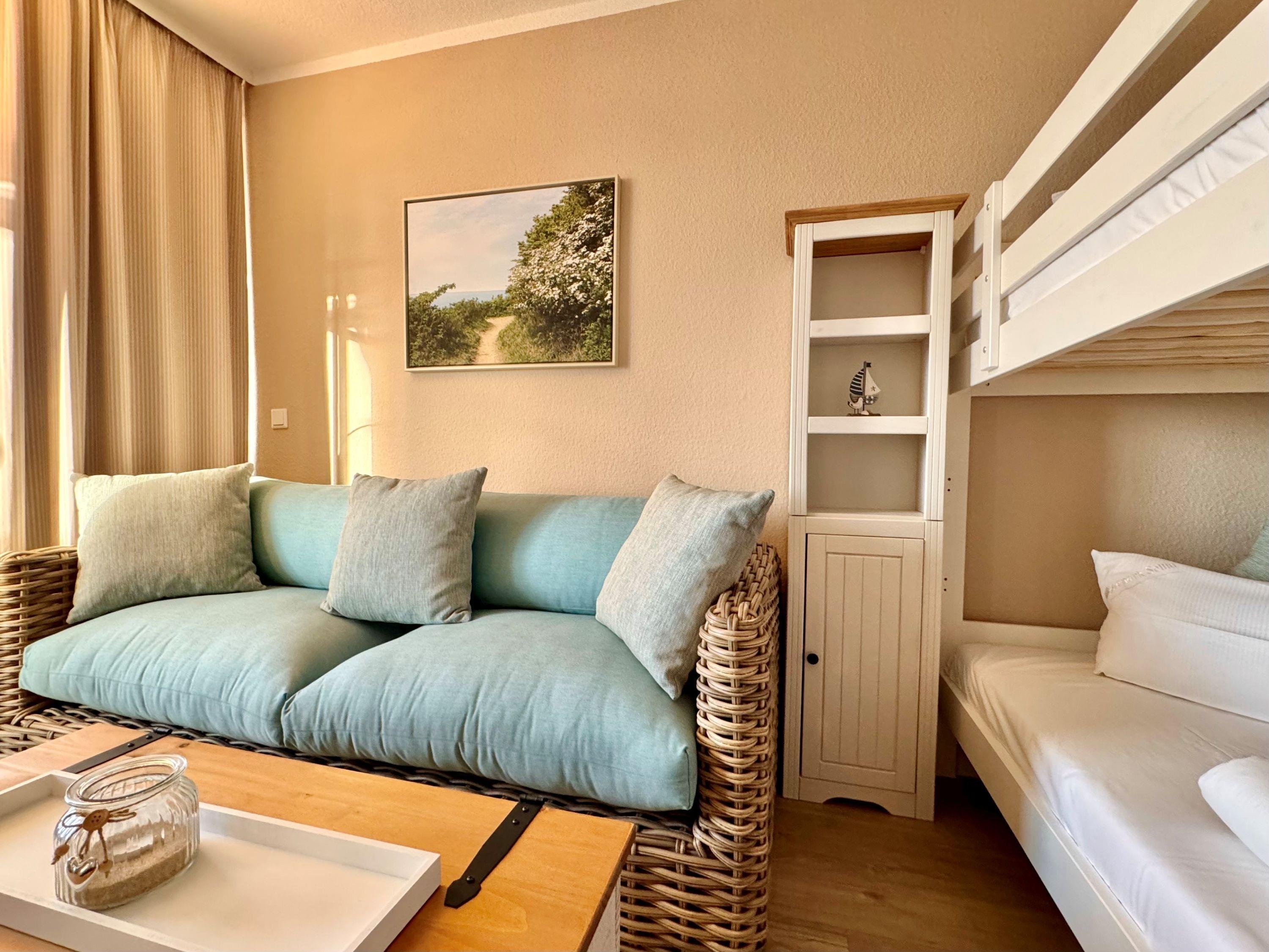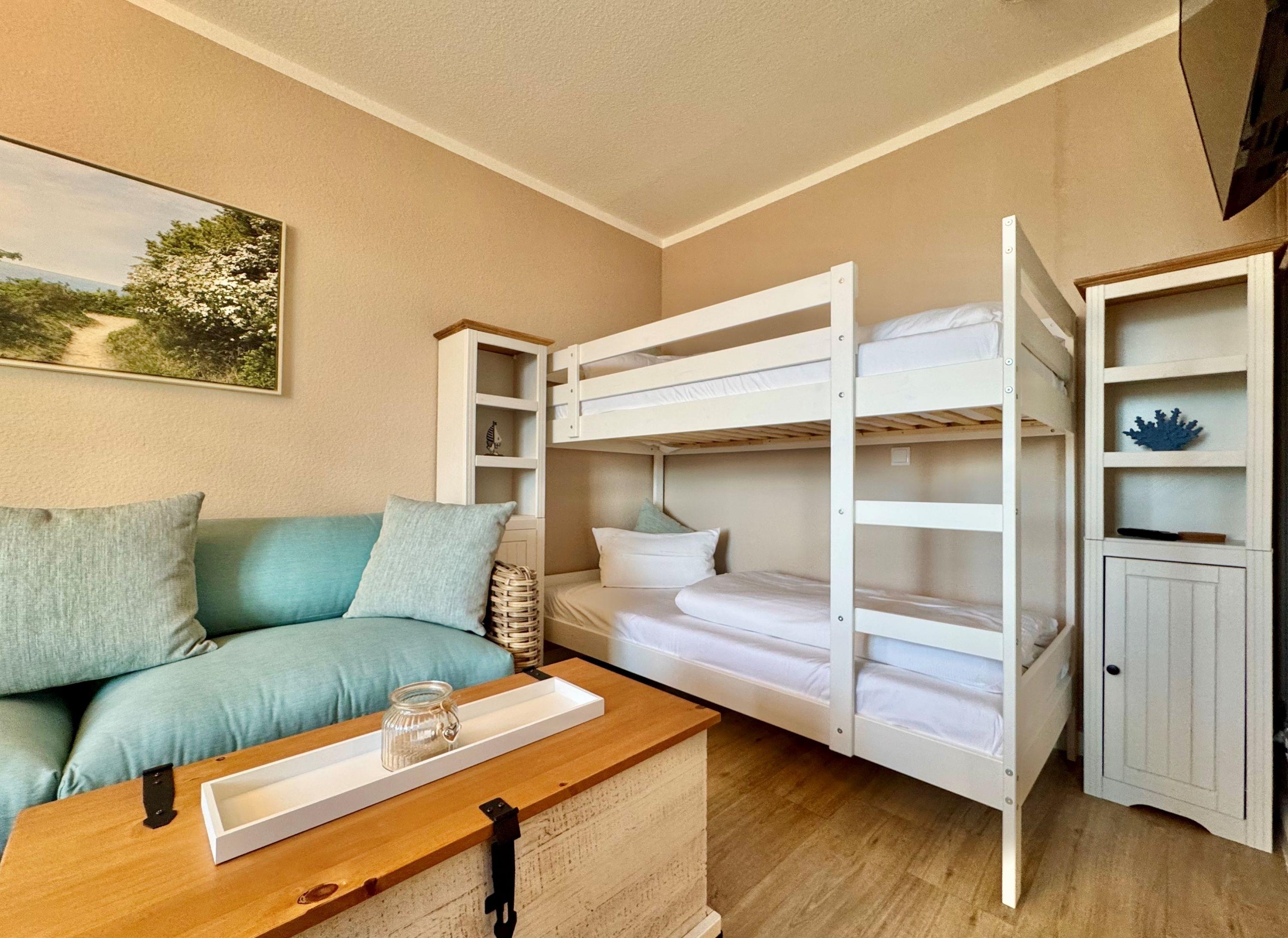 Das separate Schlafzimmer ist mit einem komfortablen Doppelbett und Verdunklungsvorhängen ausgestattet. Ein besonderes Highlight der Wohnung ist das moderne Etagenbett im Wohnzimmer mit zwei Liegeflächen von jeweils 90 x 200 cm, das ideal für Kinder oder weitere Mitreisende geeignet ist.